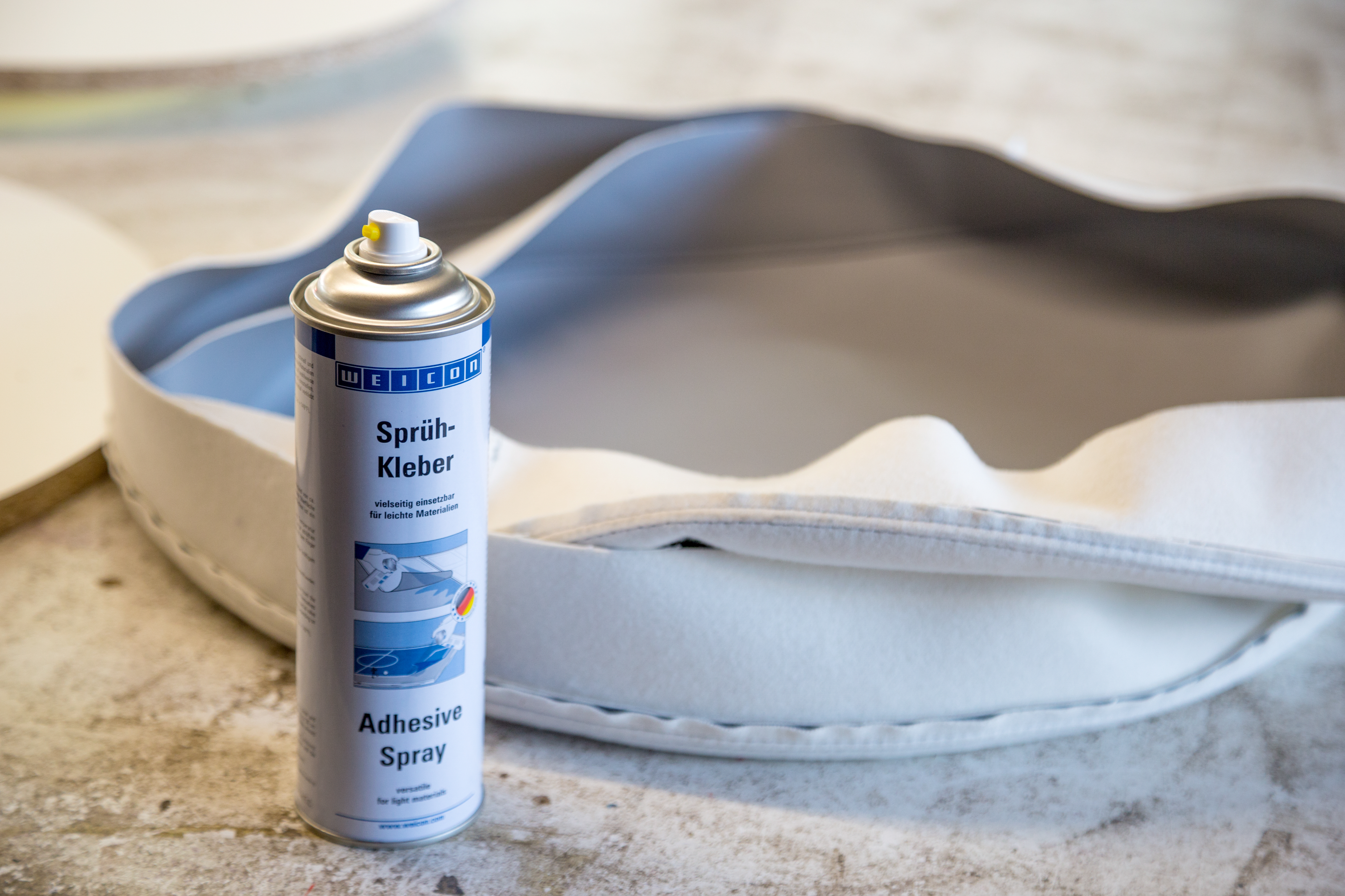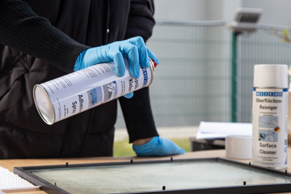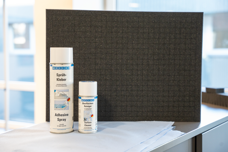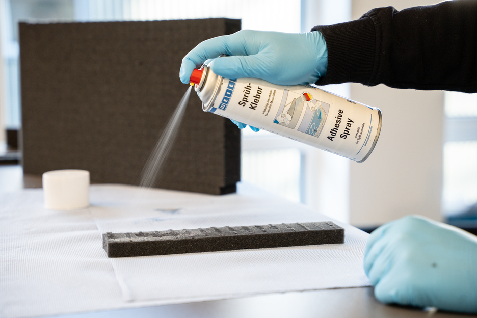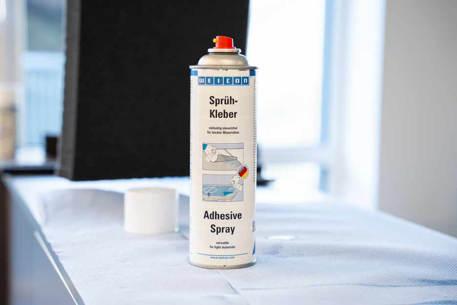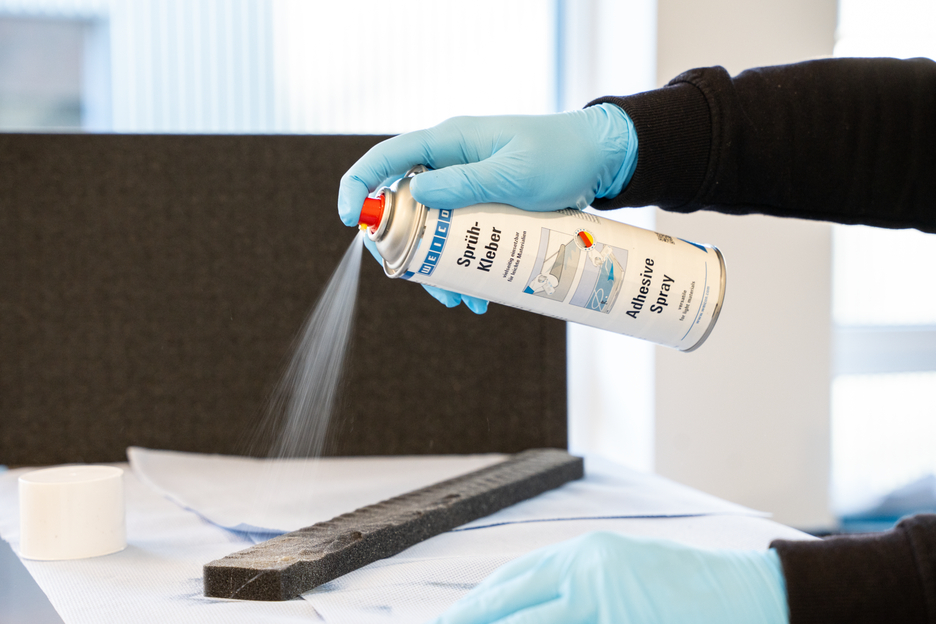WEICON Adhesive Spray to uniwersalny i szybki klej w aerozolu przeznaczony do łączenia dużych powierzchni. Adhesive Spray przeznaczony jest do łączenia filcu, folii PVC, sztucznej skóry i wykładzin, tworzyw i papieru, gumy spienionej i pianek, materiałów izolacyjnych, elastycznych pianek plastikowych, winylu i skóry oraz gumy, metalu i drewna. Szczególnie polecany jest do klejenia twardych pianek (np. polistyren).