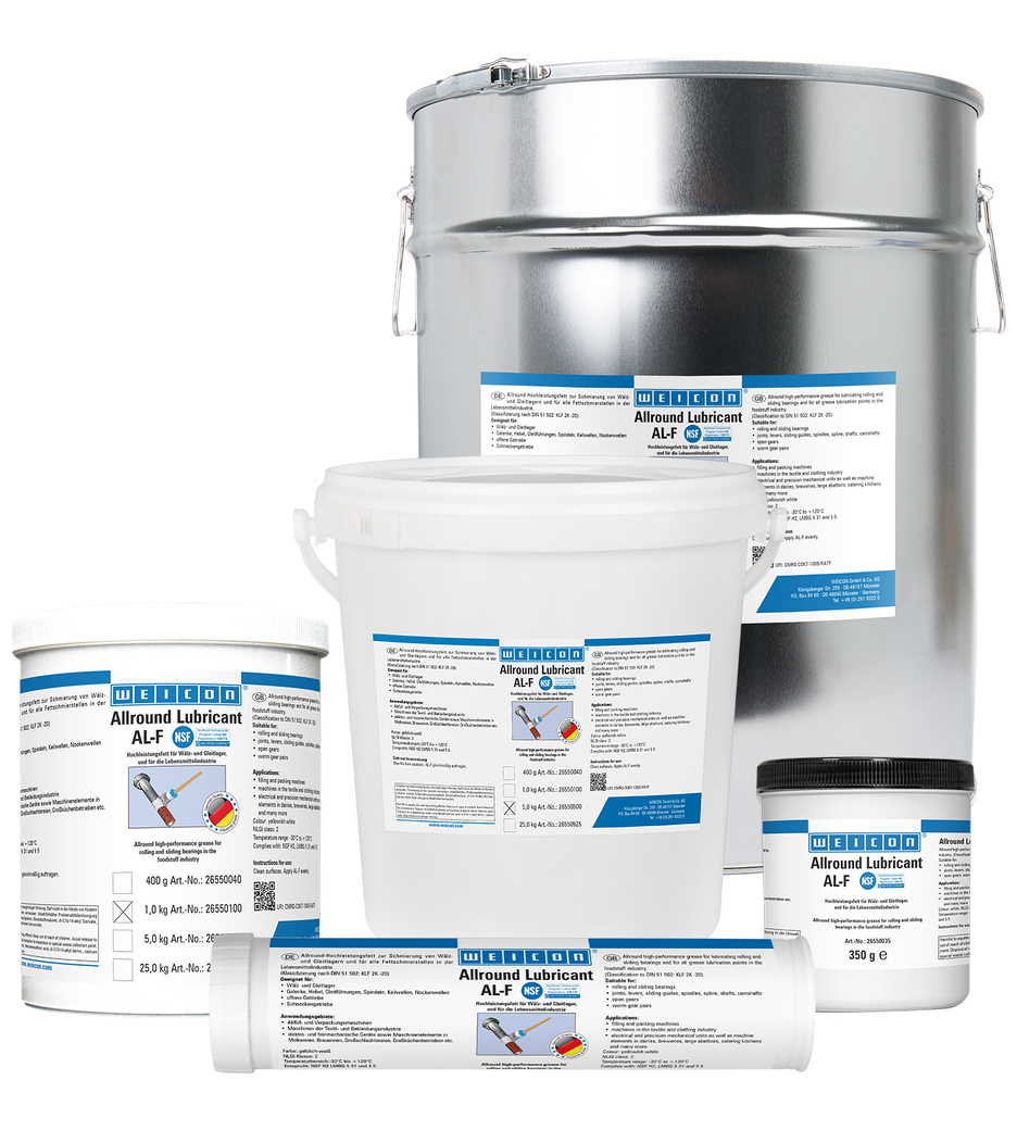 WEICON AL-F przeznaczony jest do smarowania łożysk kulkowych, ślizgowych, przegubów, dźwigni, prowadnic ślizgowych, wałków, trzpieni, wałów rozrządu i klinowych oraz przekładni otwartych i ślimakowych dla wszystkich prędkości obrotowych przewidzianych do smarowania.