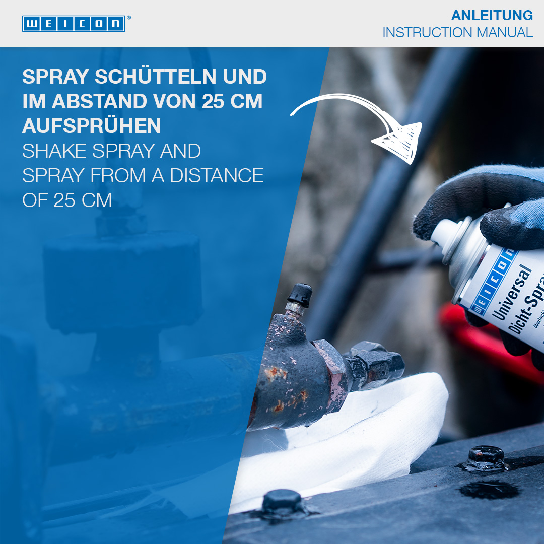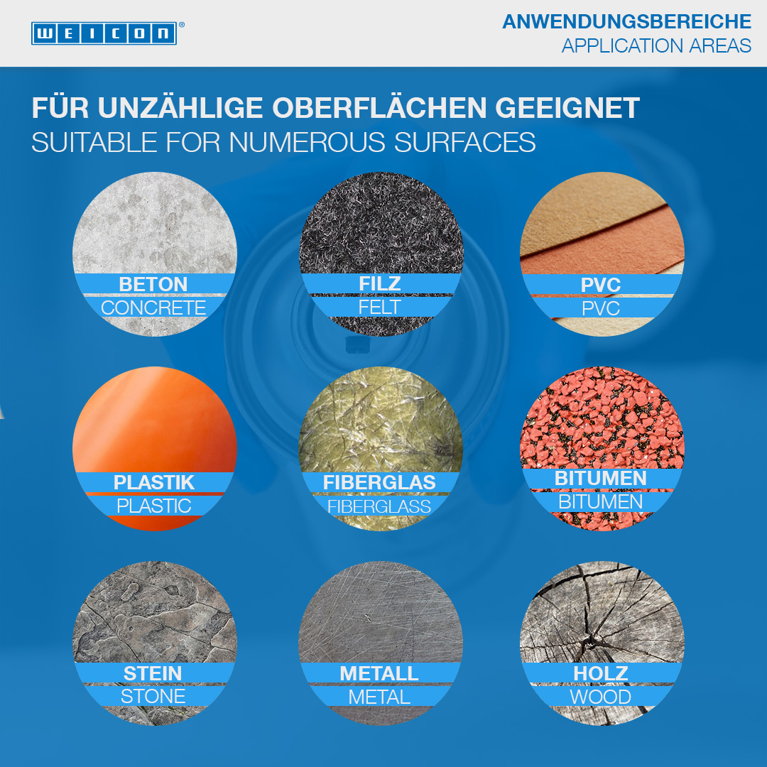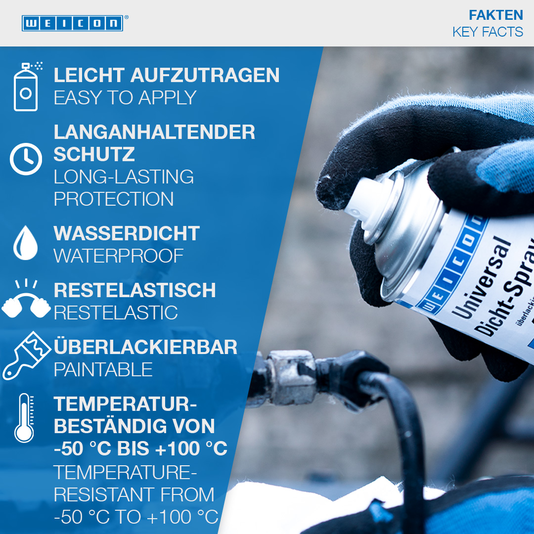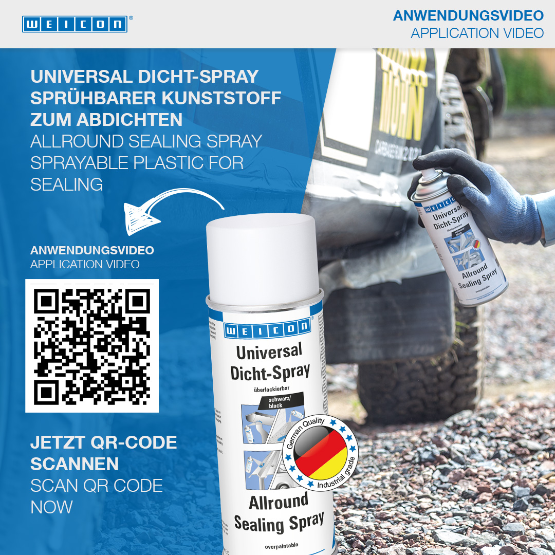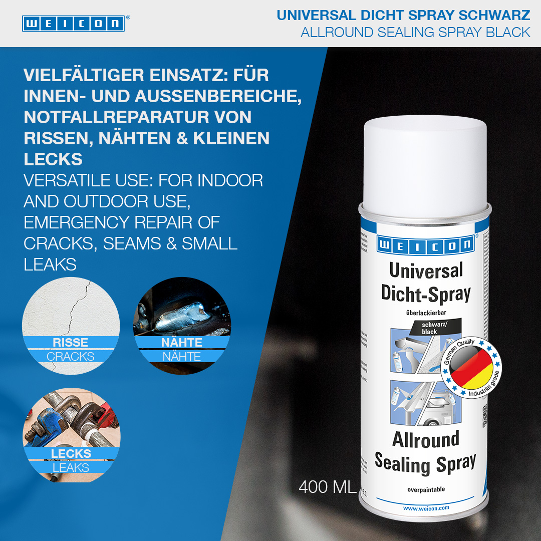WEICON Allround Sealing Spray jest natryskowym tworzywem sztucznym o wysokiej przyczepności, przeznaczonym do likwidowania nieszczelności. Został opracowany do uszczelniania małych pęknięć i szczelin, na zewnątrz i wewnątrz. Znajduje zastosowanie przy uszczelnianiu takich elementów jak rynny, rury kanalizacyjne i deszczowe, przyczepy kempingowe, kontenery mieszkalne, jachty, dachy, okna, baseny, folie w oczkach wodnych, szyby wentylacyjne. Produkt nadaje się do pokrywania farbą, jest odporny na wodę, czynniki atmosferyczne i promieniowanie UV. Nie zawiera bituminu ani silikonów i chroni powierzchnie metalowe przed korozją. WEICON Allround Sealing Spray wykazuje dobre przyleganie do powierzchni z kamienia, metali, tworzyw, drewna, emalii i wielu innych.