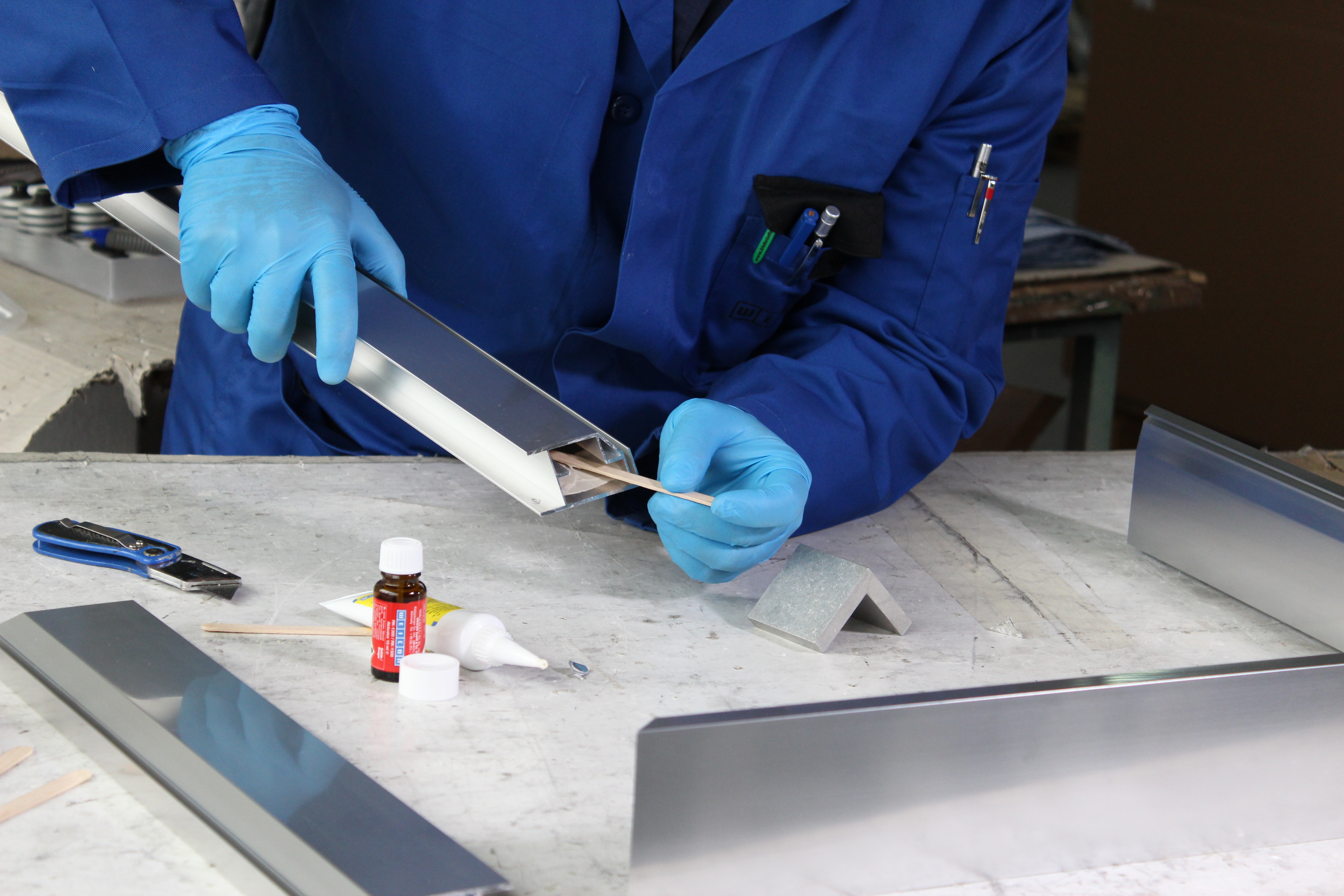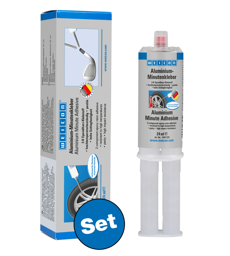 Klej do łączenia ze sobą aluminium i innych metali lekkich. Klej WEICON Aluminium Minute Adhesive może być stosowany do wypełniania pęknięć i dziur w aluminiowych obudowach, a także do naprawy kół ze stopów lekkich. Aluminium Minute Adhesive to niskozapachowy, dwuskładnikowy klej epoksydowy wypełniony aluminium. Jest odporny na wysokie temperatury do +180 °C i szybko utwardza się w temperaturze pokojowej. Po utwardzeniu klej można obrabiać (piłować, wiercić, frezować). Aluminium Minute Adhesive wypełnia szczeliny i jest odporny na ściekanie (tiksotropowy) oraz ma bardzo wysoką wytrzymałość na rozciąganie i uderzenia. Aby uzyskać optymalną przyczepność, powierzchnie przeznaczone do klejenia powinny być suche i wolne od tłuszczu lub zanieczyszczeń. Skrobanie lub szlifowanie powierzchni przed czyszczeniem pomaga zapewnić dobrą przyczepność.