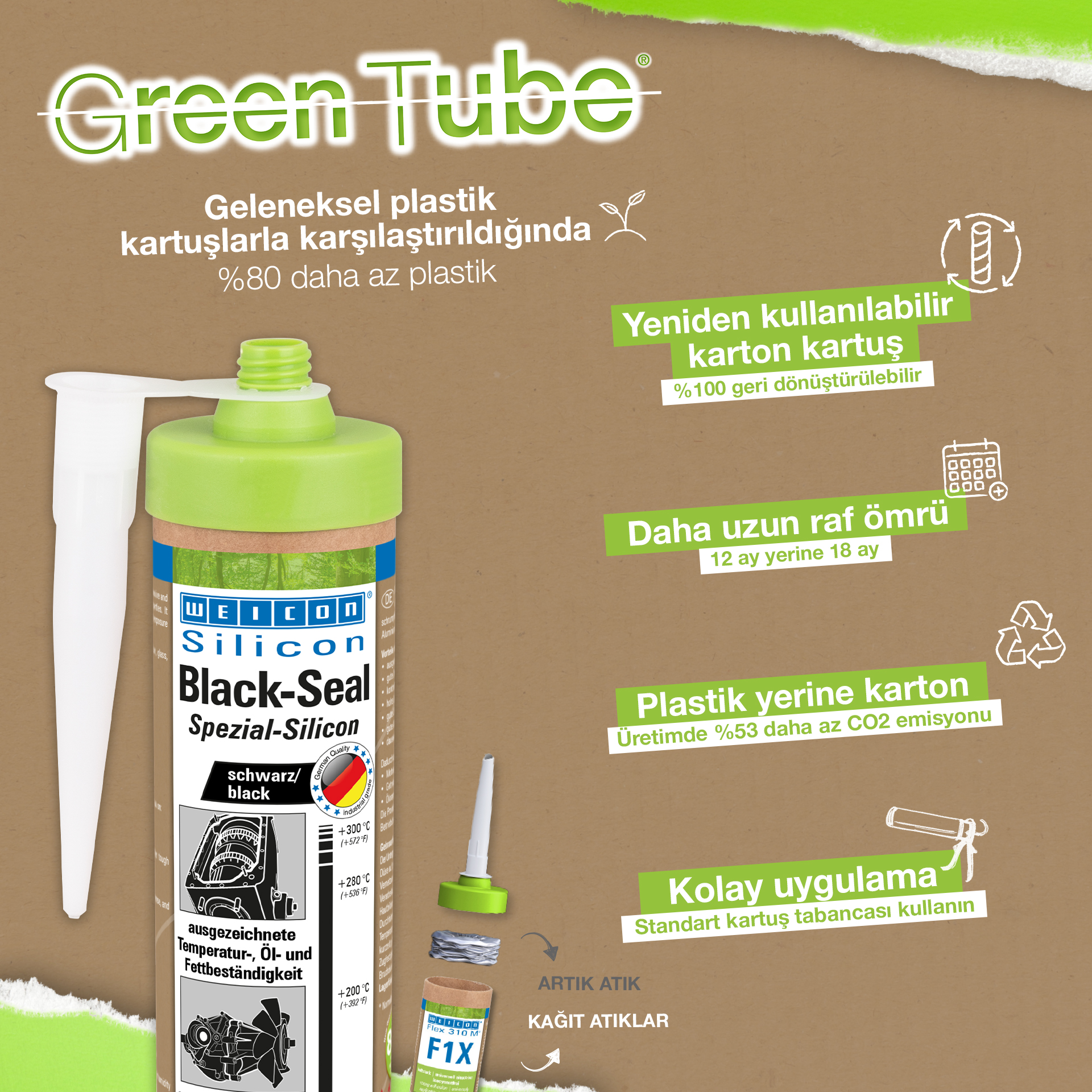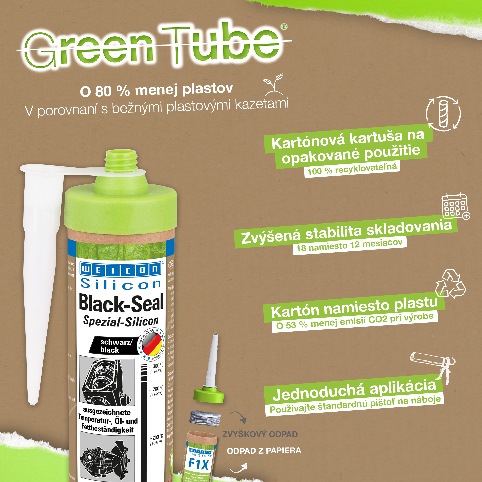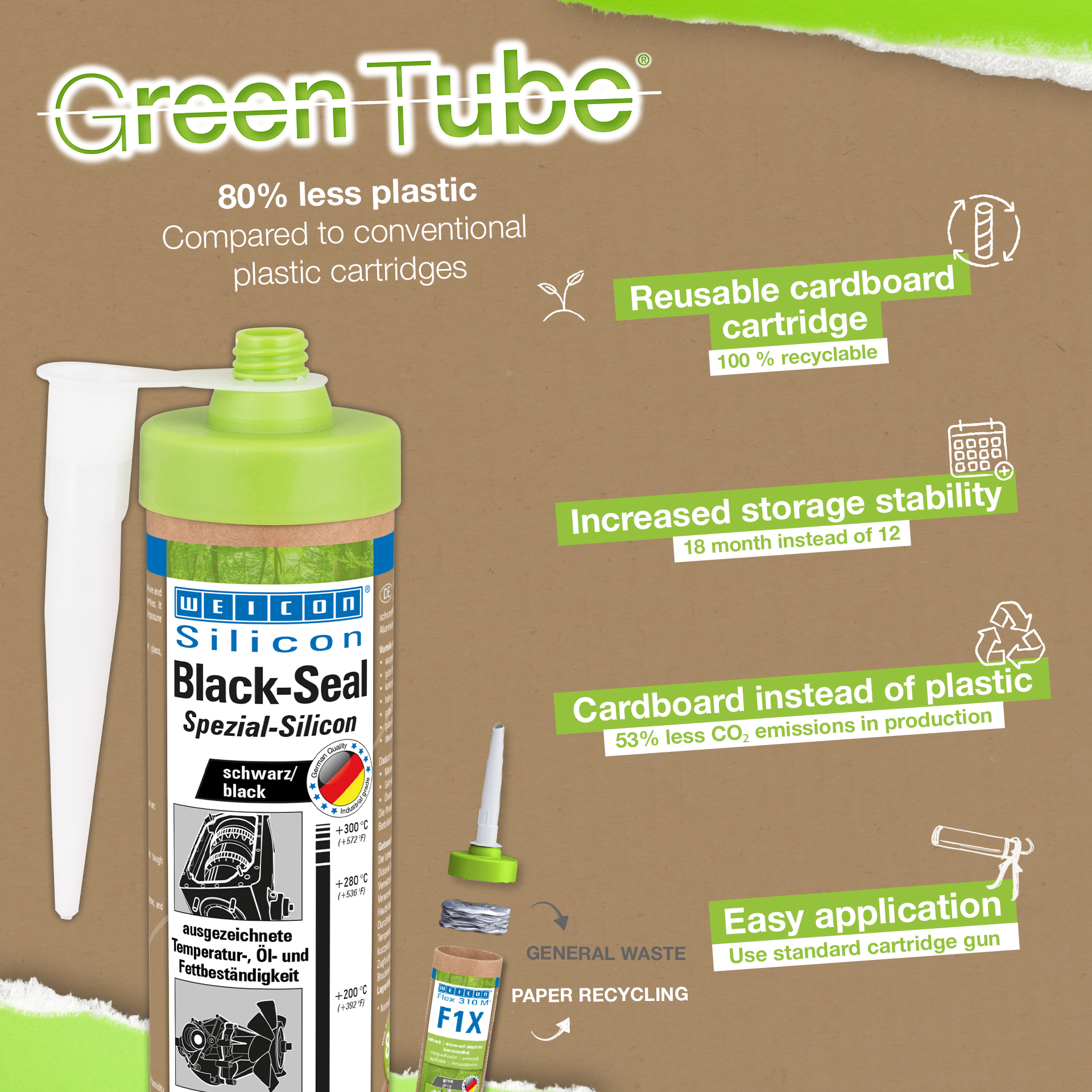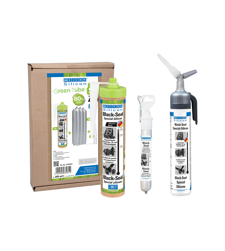 WEICON Black-Seal jest czar nym, wysoko temperaturowym (do +300 °C) klejem i uszczelniaczem. Nie zawiera rozpuszczalników, jest wytrzymały, odporny na oleje, smary oraz ciśnienie, starzenie i posiada wysoką elastyczność (wydłużenie zrywające 500%). Black-Seal przeznaczony jest do klejenia i uszczelniania w aplikacjach wymagających wysokiej odporności na oleje i smary. WEICON Black-Seal może być stosowany wskrzyniach biegów, pokrywach zaworowych, przekładniach, miskach olejowych, zbiornikach, kołnierzach i wielu innych.