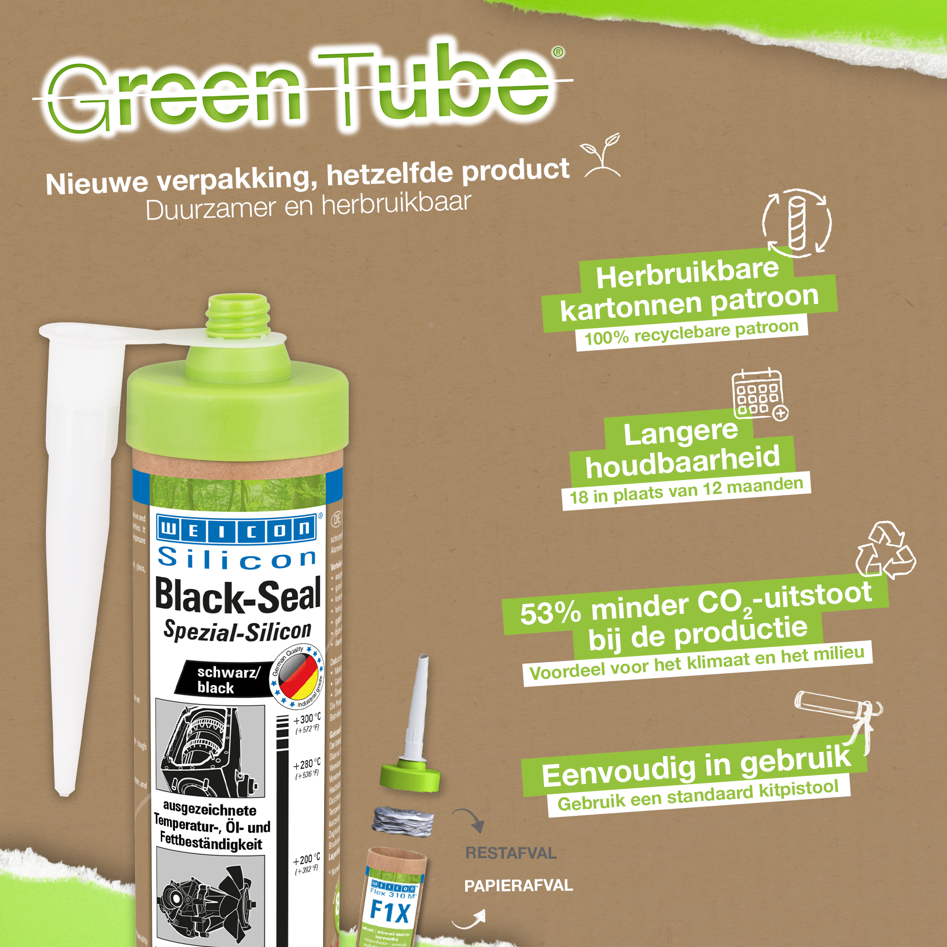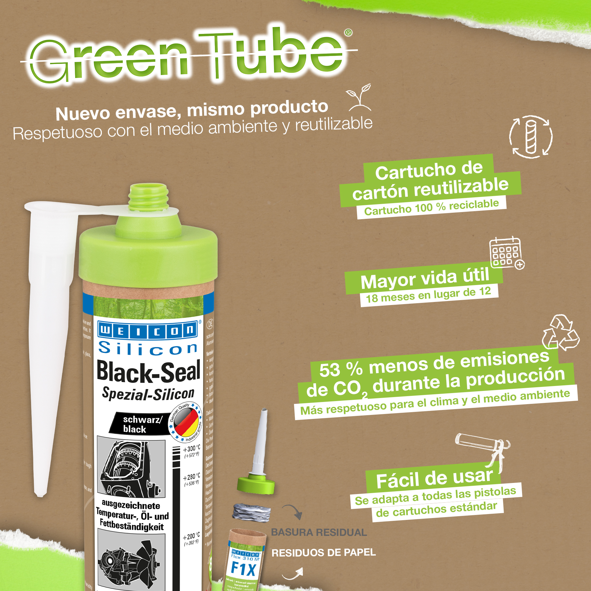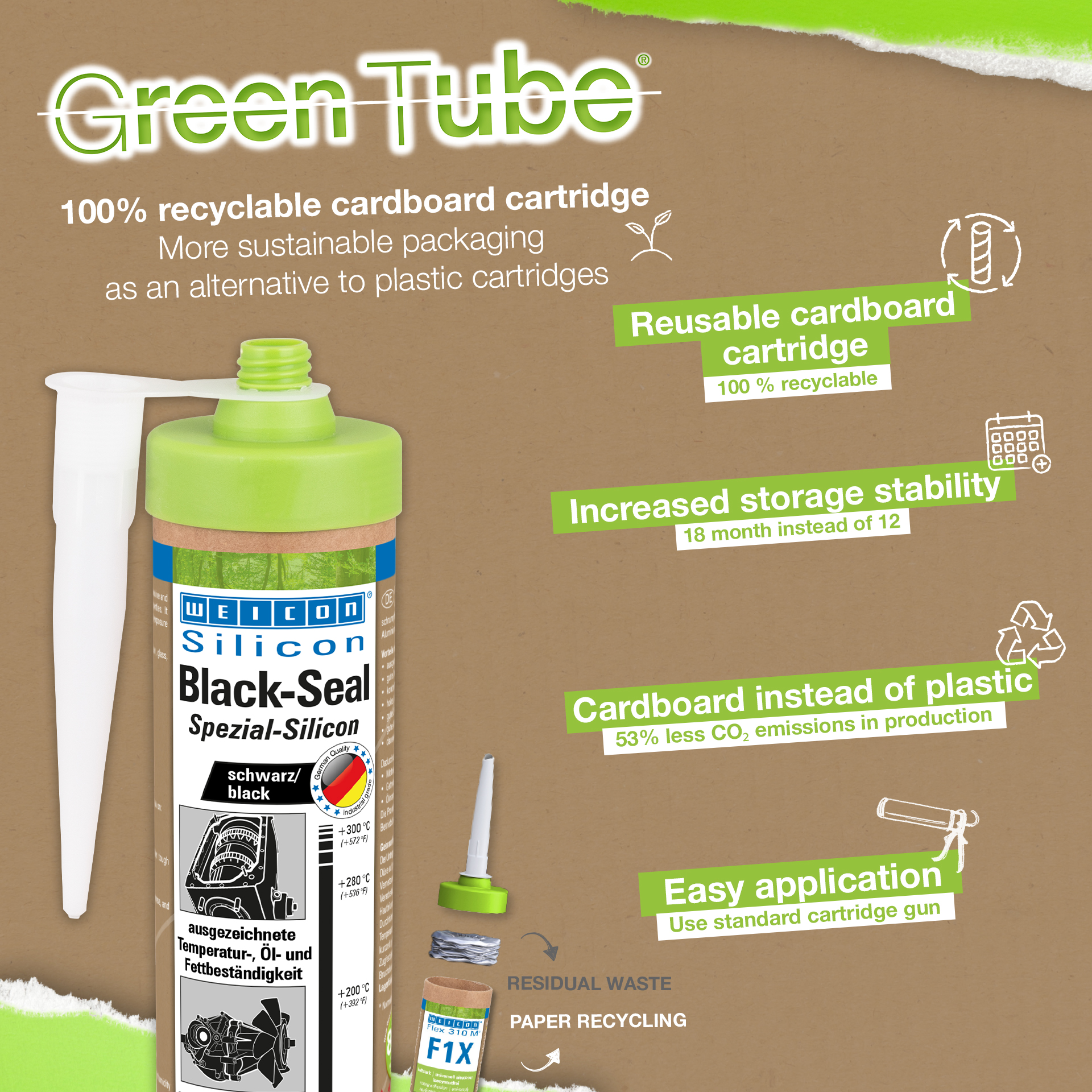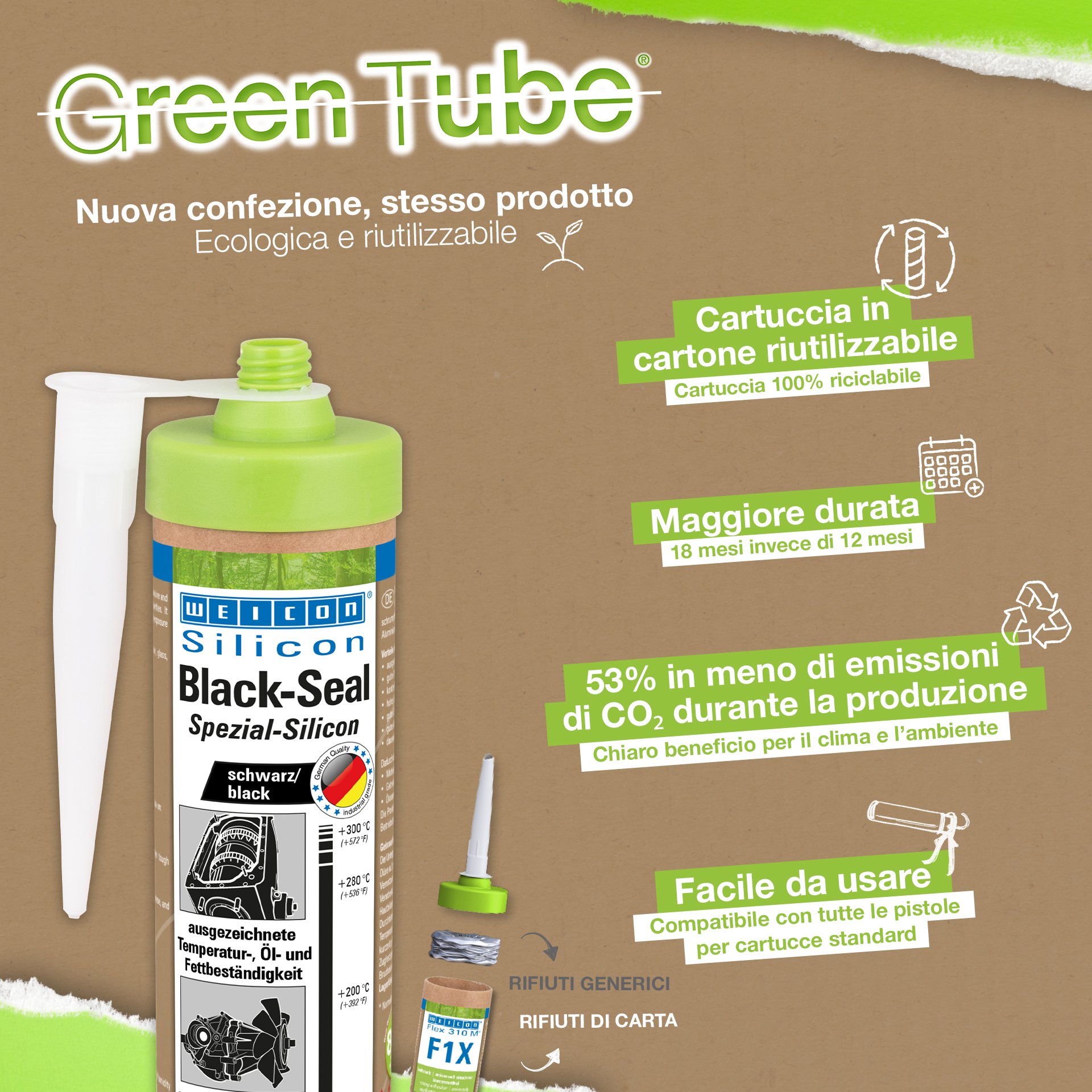 WEICON Black-Seal jest czar nym, wysoko temperaturowym (do +300 °C) klejem i uszczelniaczem. Nie zawiera rozpuszczalników, jest wytrzymały, odporny na oleje, smary oraz ciśnienie, starzenie i posiada wysoką elastyczność (wydłużenie zrywające 500%). Black-Seal przeznaczony jest do klejenia i uszczelniania w aplikacjach wymagających wysokiej odporności na oleje i smary. WEICON Black-Seal może być stosowany wskrzyniach biegów, pokrywach zaworowych, przekładniach, miskach olejowych, zbiornikach, kołnierzach i wielu innych.