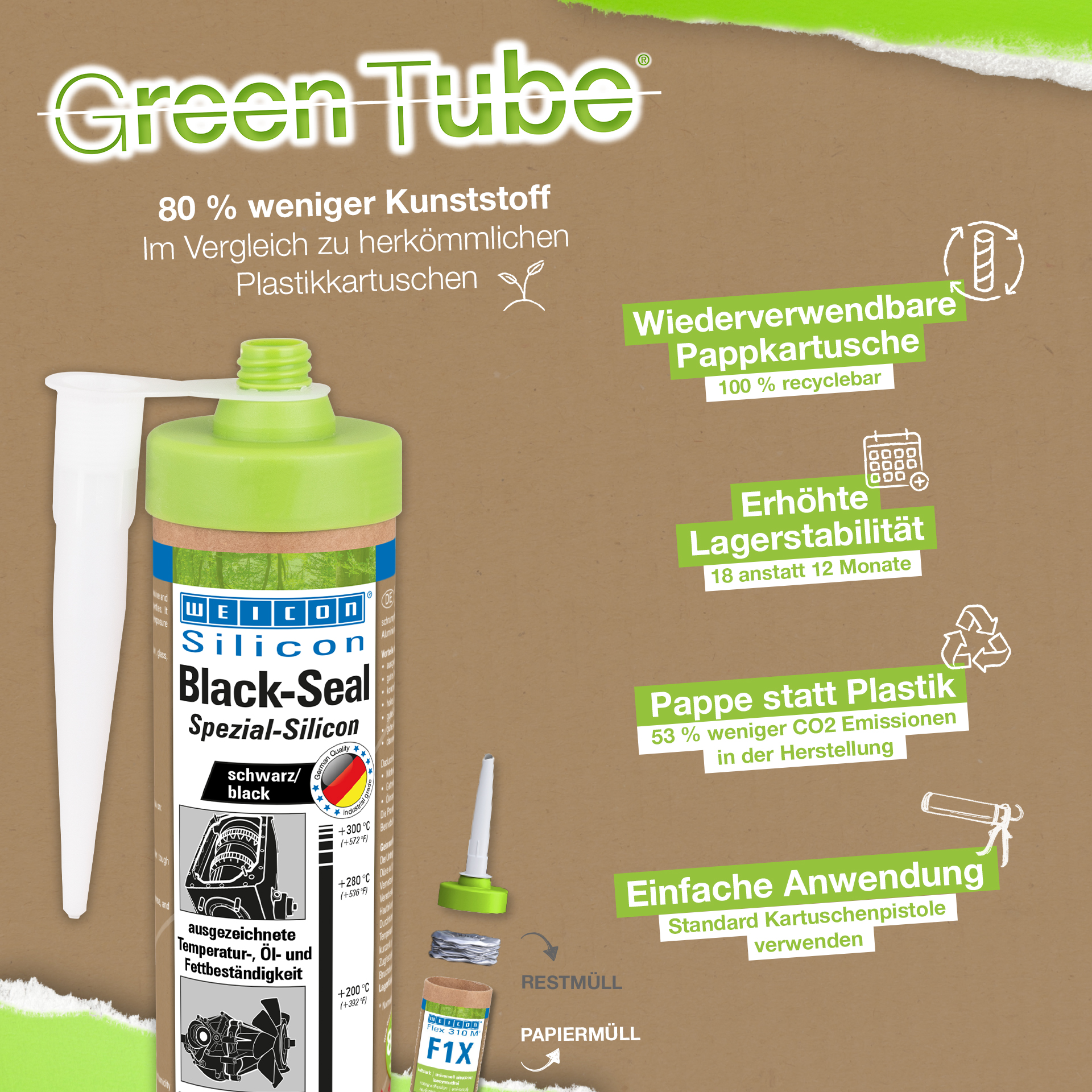WEICON Black-Seal jest czar nym, wysoko temperaturowym (do +300 °C) klejem i uszczelniaczem. Nie zawiera rozpuszczalników, jest wytrzymały, odporny na oleje, smary oraz ciśnienie, starzenie i posiada wysoką elastyczność (wydłużenie zrywające 500%). Black-Seal przeznaczony jest do klejenia i uszczelniania w aplikacjach wymagających wysokiej odporności na oleje i smary. WEICON Black-Seal może być stosowany wskrzyniach biegów, pokrywach zaworowych, przekładniach, miskach olejowych, zbiornikach, kołnierzach i wielu innych.