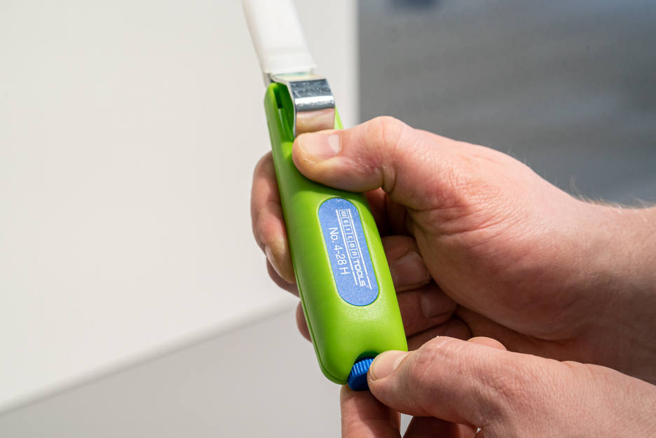 With the Green Line, a very special tool range has been developed. The tools are made of up to 97 % renewable raw materials, which is recyclable and has an excellent life cycle assessment. The Cable Stripper 4-28 H enables precise, fast and safe stripping of all common round cables with a diameter between 4 and 28 millimetres. Thanks to the set screw on the back of the handle, the cutting depth can be adjusted with an infinitely variable range. This prevents damaging the inner conductor. The cutting blade is integrated in the housing and self-rotating, thus enabling the automatic adjustment from circular to longitudinal cutting. In addition, the 4-28 H has a hook blade, which can be covered with a safety cap. The cap locks the blade safely, which significantly reduces the risk of injury.