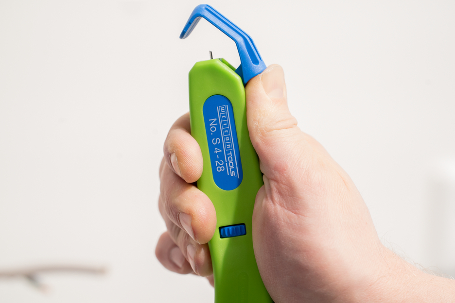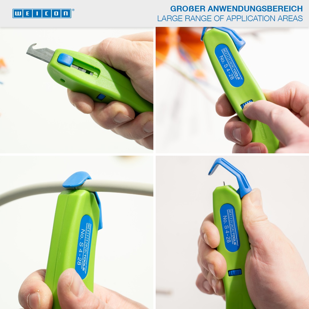 With the Green Line, a very special tool range has been developed. The tools are made of up to 97 % renewable raw materials, which is recyclable and has an excellent life cycle assessment. The Cable Stripper S 4-28 Green Line enables precise, fast and safe stripping of all common round cables with a diameter between 4 and 28 millimetres. Thanks to the adjustment screw in the housing, the cutting depth of the knife can be set with an infinitely variable range. This prevents damaging the inner conductor. The cutting blade is integrated in the housing and self-rotating, thus enabling the automatic adjustment from circular to longitudinal cutting. In addition, a hook blade has been integrated into the S 4-28, which can be retracted into the housing. The blade is lockable in both positions. This leads to a significant reduction in the risk of injury that fixed blades bring with them.