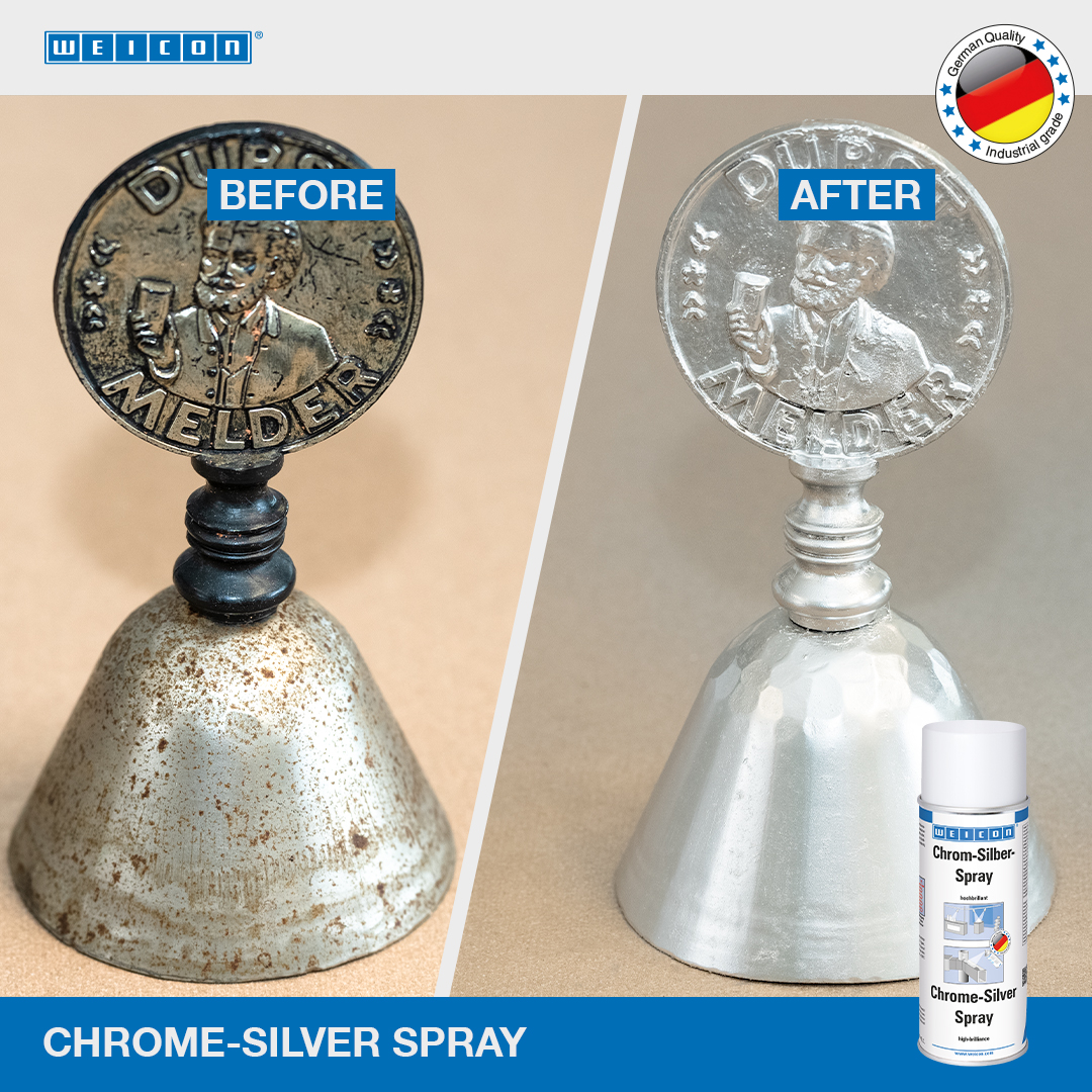 WEICON Chrome-Silver Spray tworzy wysoko połyskową powłokę (nieodporną na ścieranie), która przylega do wszystkich metali, szkła, kamienia, drewna, płyt kartonowych oraz większości tworzyw. Wysoki połysk osiąga dzięki specjalnemu składowi oraz wysokiej czystości pigmentów metalicznych. WEICON Chrome-Silver Spray posiada szereg przeznaczeń, takich jak prototypy i wzorniki, powlekanie metali (np. reflektory), ekspozytory i materiały reklamowe, specjalne dekoracje oraz podnoszenie waloru optycznego materiałów.