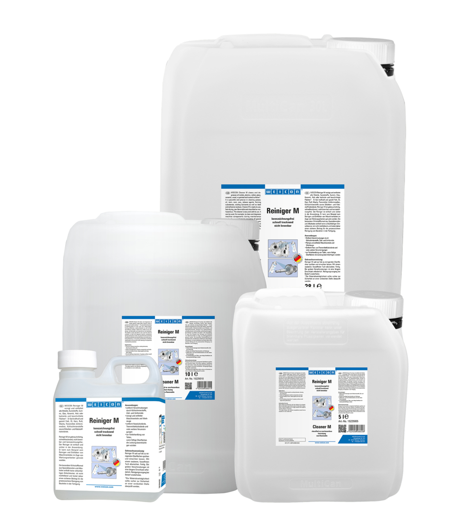 WEICON Cleaner M czyści i odtłuszcza wszystkie metale, tworzywa sztuczne, gumę, szkło, ceramikę, drewno oraz powierzchnie lakierowane i powlekane. Silnie i specyficznie rozpuszcza tłuszcz, olej, żywicę, sadzę, wosk, środki antyadhezyjne, środki formujące, smary chłodzące, jak również pozostałości po etykietach i klejach. Cleaner M jest gotowy do użycia, szybkoschnący, niepalny i nie wymaga oznakowania. Środek czyszczący jest wygodny i bezpieczny w użyciu. Znajduje zastosowanie np. do czyszczenia i odtłuszczania części maszyn i narzędzi. Specjalna formuła aktywnych składników, składająca się ze specjalnych środków powierzchniowo czynnych i alkoholi, nie zawiera silikonowych środków spieniających, jest beztłuszczowa i tym samym stanowi bezpieczny wkład w proces bezpiecznego czyszczenia komponentów w produkcji.