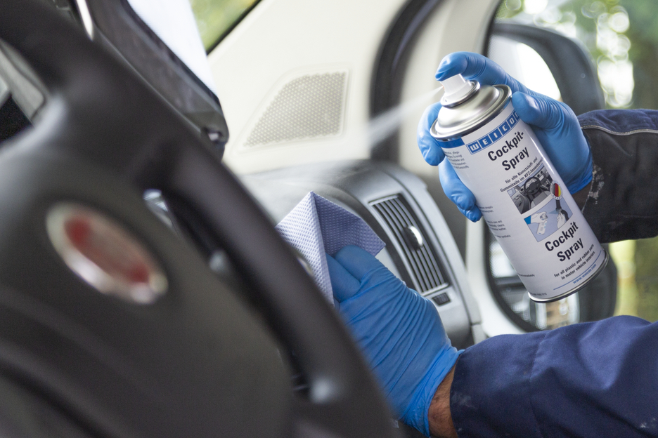 WEICON Cockpit Spray zapewnia trwałą i łatwą w utrzymaniu warstwę ochronną, która nie przyjmuje kurzu i nabłyszcza powierzchnie. Szybko i skutecznie czyści i zabezpiecza tworzywa oraz sztuczną skórę. Cockpit Spray odświeża wygląd kokpitu i ożywia kolory. Dzięki stosowaniu preparatu materiały syntetyczne nie blakną, gumy zaś nie pękają i zachowują elastyczność. WEICON Cockpit Spray eliminuje skrzypienie i piski, pielęgnuje deskę rozdzielczą, elementy poszycia samochodu, szyberach oraz sztuczną skórę, elementy z gumy i tworzywa, drewno i powłoki chromowe. Zapobiega zamarzaniu uszczelek w drzwiach, oknach i bagażniku, może być stosowany do smarowania pasów bezpieczeństwa, prowadnic siedzisk, szyberdachów i zamków.