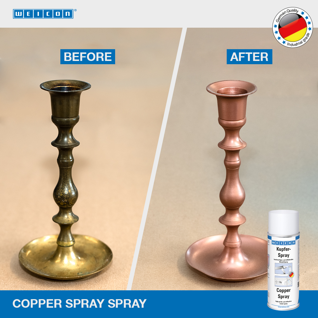WEICON Copper Spray jest wysokojakościową powłoką miedzianą o dużej odporności pogodowej i silnym przyleganiu do powierzchni. Wysoka zawartość miedzi sprawia, że jest bardzo skuteczną powłoką nieżelazną do stosowania na zewnątrz i wewnątrz. Z powodzeniem może być też stosowana do prac renowacyjnych na różnych powierzchniach metalowych. Copper Spray przeznaczona jest do aplikacjach na takich elementach jak wszelkie wyroby z żelaza, parapety, rynny dachowe i rury zewnętrzne, oświetlenie zewnętrzne, skrzynki pocztowe oraz w rzemiośle i pracach dekoracyjnych