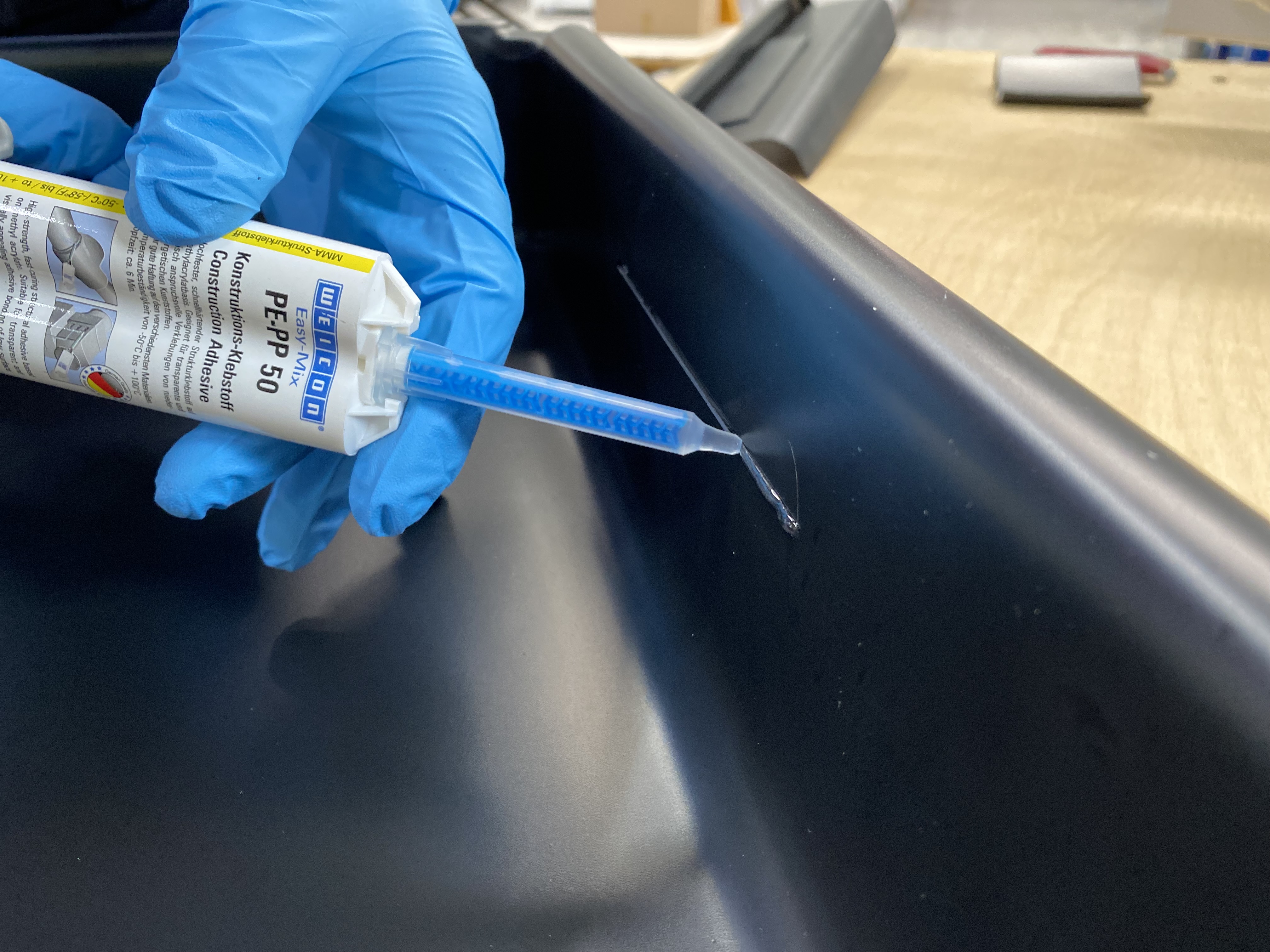 "WEICON Easy-Mix PE-PP 50 to 2-składnikowy klej budowlany na bazie akrylanu metylu. Ze względu na przezroczyste utwardzanie jest szczególnie odpowiedni do optycznie wymagających, wysokowytrzymałych połączeń tworzyw sztucznych o niskiej energii, takich jak PE, PP i TPE. Dzięki specjalnej formule klej nadaje się do klejenia z 0 szczelinami i do klejenia podłoży z bardzo małymi szczelinami klejowymi mniejszymi niż 0,2 mm. Klej strukturalny charakteryzuje się szybkim wzrostem wytrzymałości i wysoką wytrzymałością końcową. Jest odporny na uderzenia, starzenie, chemikalia i lekko tiksotropowy. PE-PP 50 ma krótką żywotność wynoszącą sześć minut i wytrzymałość ręczną wynoszącą dwanaście minut. Jest przetwarzany w systemie 1:1 i nie wymaga wstępnej obróbki klejonych części, ponieważ klej ma zintegrowany podkład. Pistolet dozujący Easy-Mix D 50 jest wymagany do przetwarzania produktów Easy-Mix w pojemniku 50 ml".
