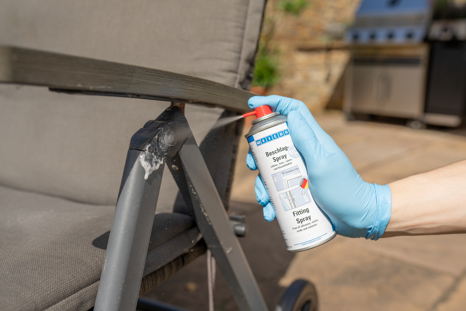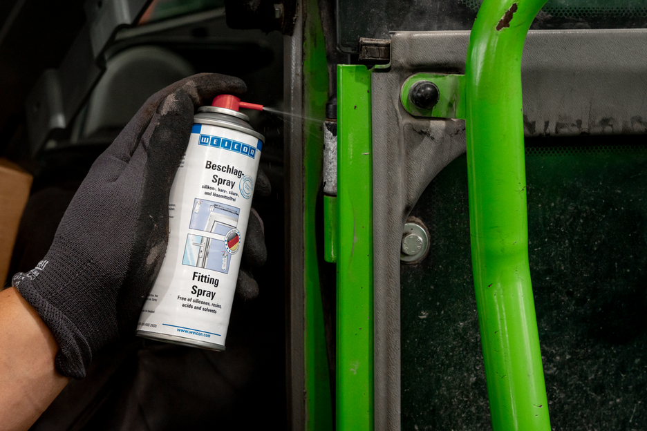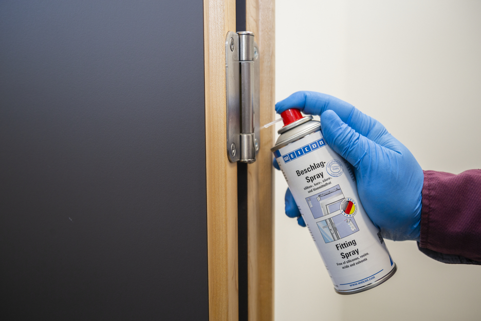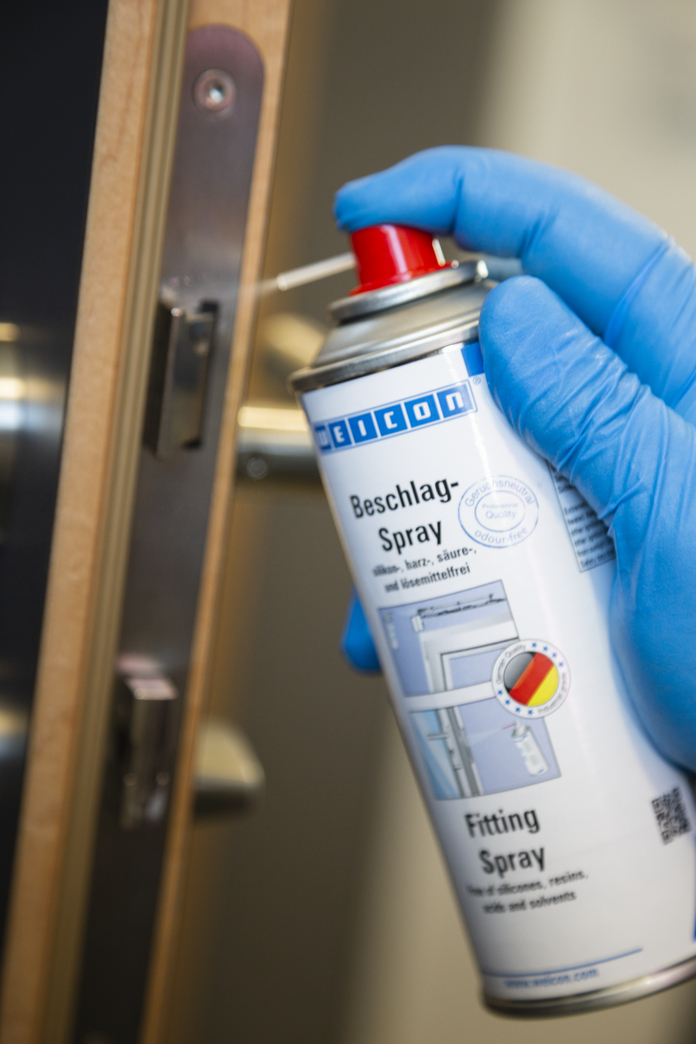 WEICON Fitting Spray jest preparatem konserwującym i pielęgnującym o wysokiej przyczepności. Jest przezroczysty, nie zawiera silikonów, żywic, kwasów ani rozpuszczalników. Dzięki wyjątkowym właściwościom pełznym i wypieraniu wilgoci, Fitting Spray zmniejsza tarcie i zużycie oraz eliminuje piski. Fitting Spray jest odporny na czynniki pogodowe, zabezpiecza przed korozją i zmywa zabrudzenia. WEICON Fitting Spray może być z powodzeniem stosowany do smarowana, konserwacji i pielęgnacji mocowań okien, drzwi, bram i garaży, mocowań przegubowych i dźwigni a także zawiasów i systemów zamykających.