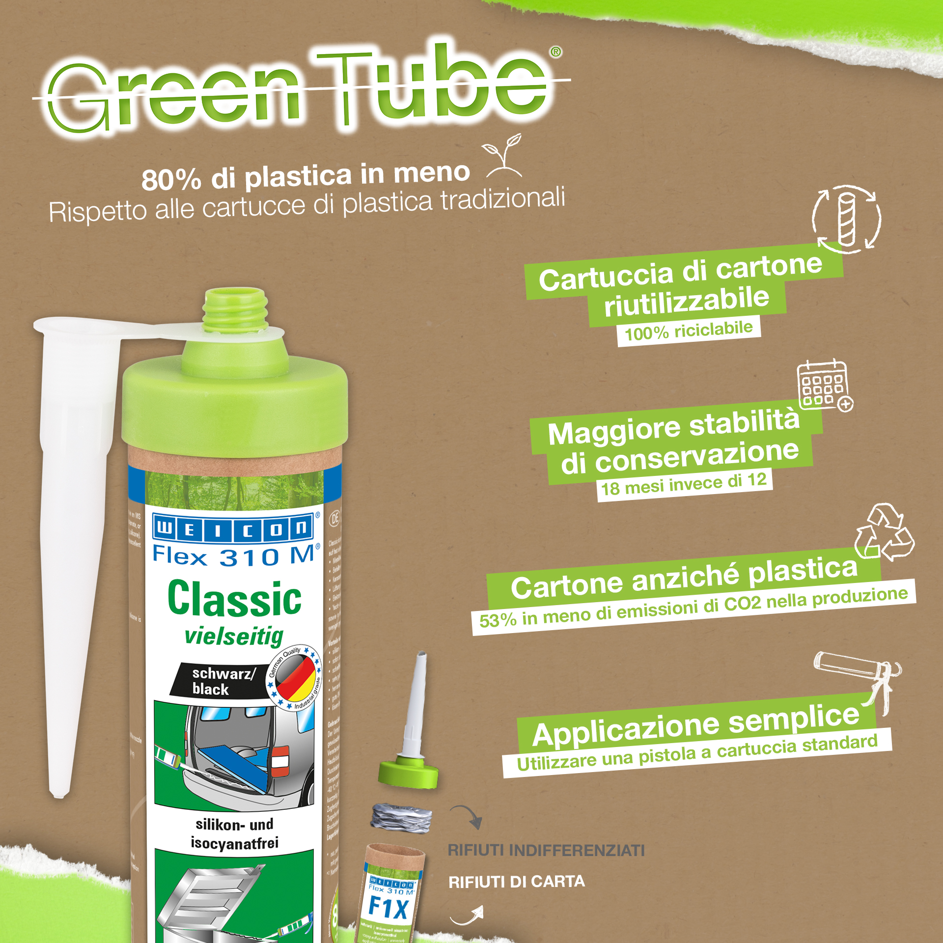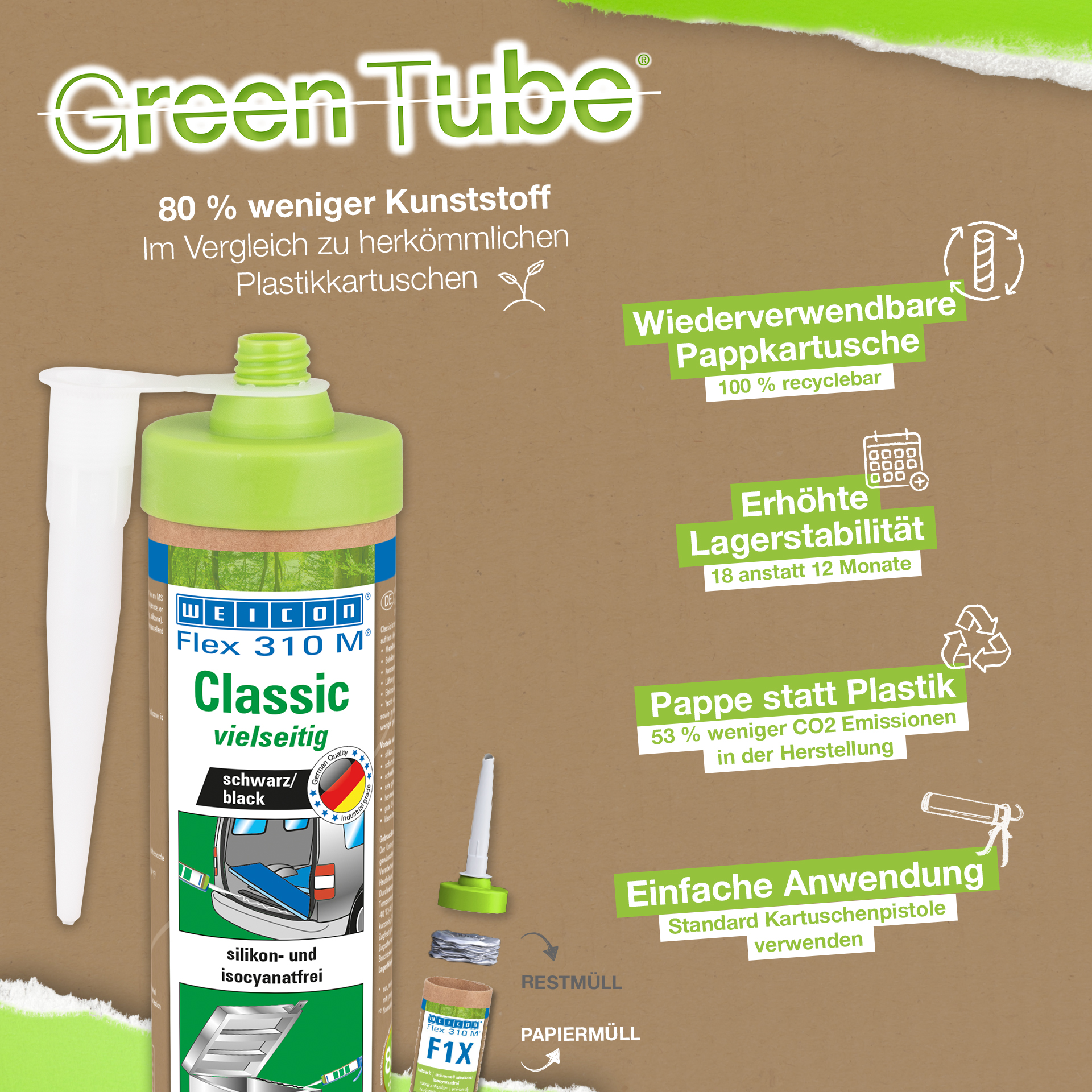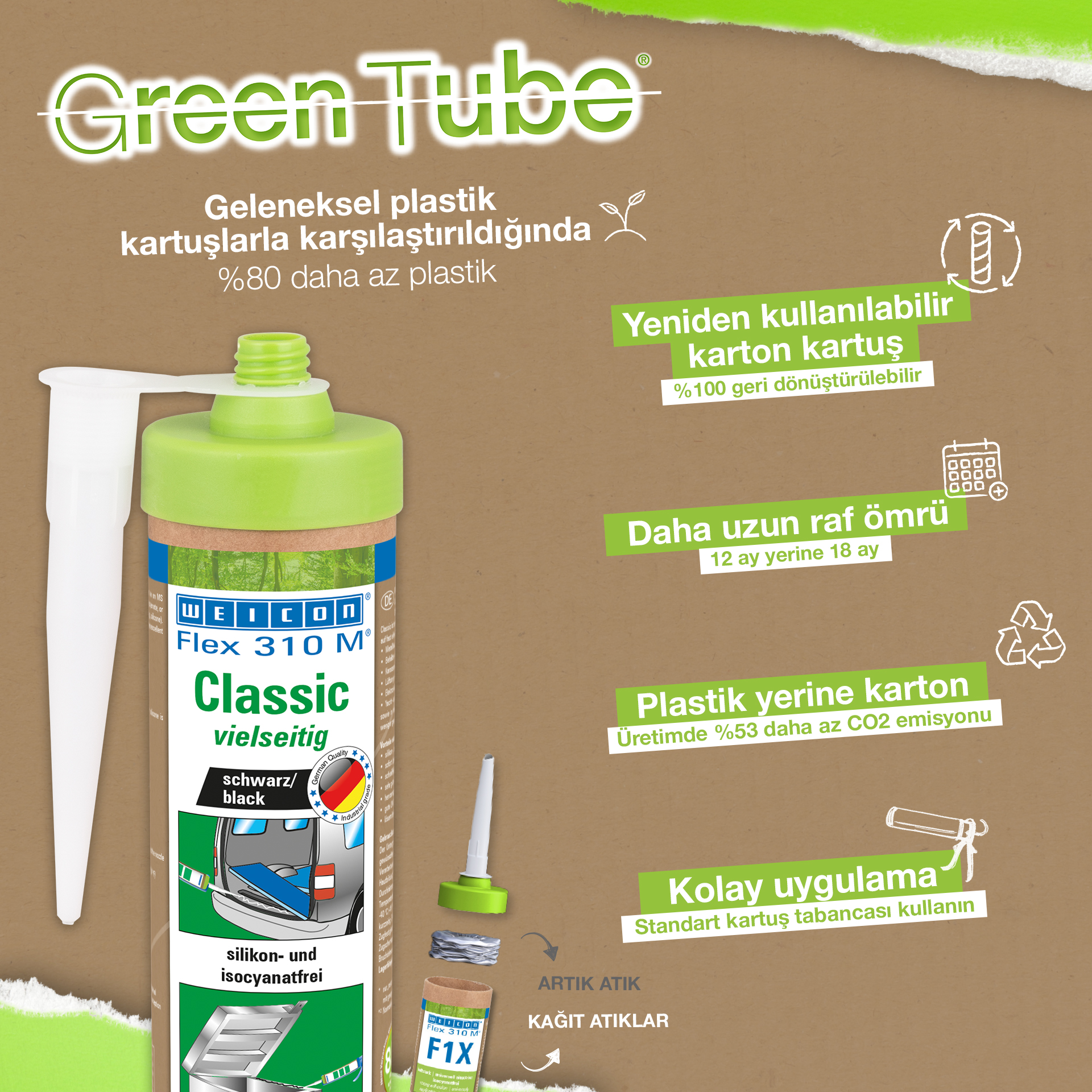 WEICON Flex 310 M® Classic jest mocnym, dającym się malować (na mokro) elastycznym klejem o bardzo dobrej odporności na starzenie oraz na promieniowanie UV, wodę słodką i słoną. Nie zawiera silikonów, izocyjanianów, halogenów ani rozpuszczalników. Produkt posiada atest ISEGA dopuszczający do stosowania jako klej w sektorze przetwórstwa żywności. Flex 310 M® Classic jest elastycznym klejem na bazie MS polimerów i przeznaczonym do łączenia metali, wielu tworzyw, ceramiki, szkła i kamienia. Flex 310 M® Classic może być stosowany w budowie pojemników i urządzeń, kontenerów, karoserii i pojazdów, konstrukcjach statków, jachtów i łódek, systemach klimatyzacji i wentylacji, przemyśle energetycznym i elektrycznym oraz wszędzie tam, gdzie nie znajdują zastosowania silikony.