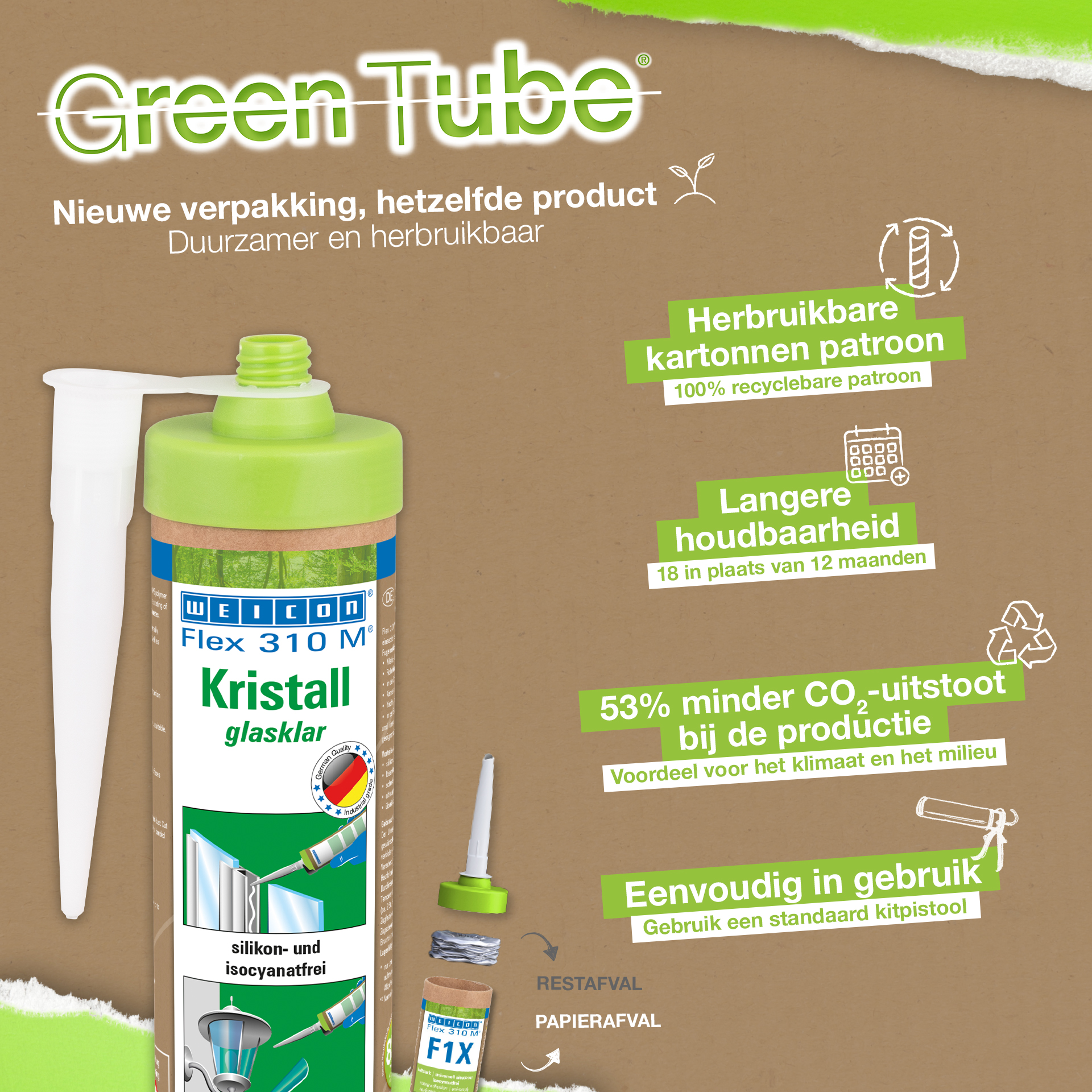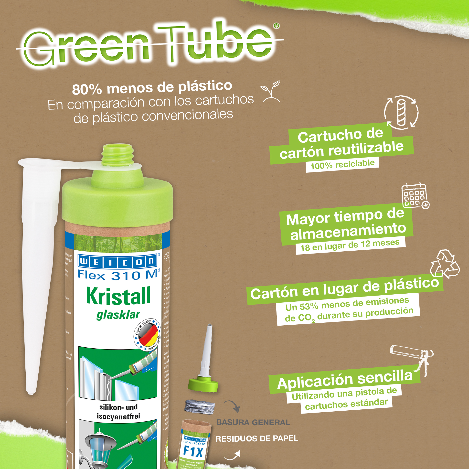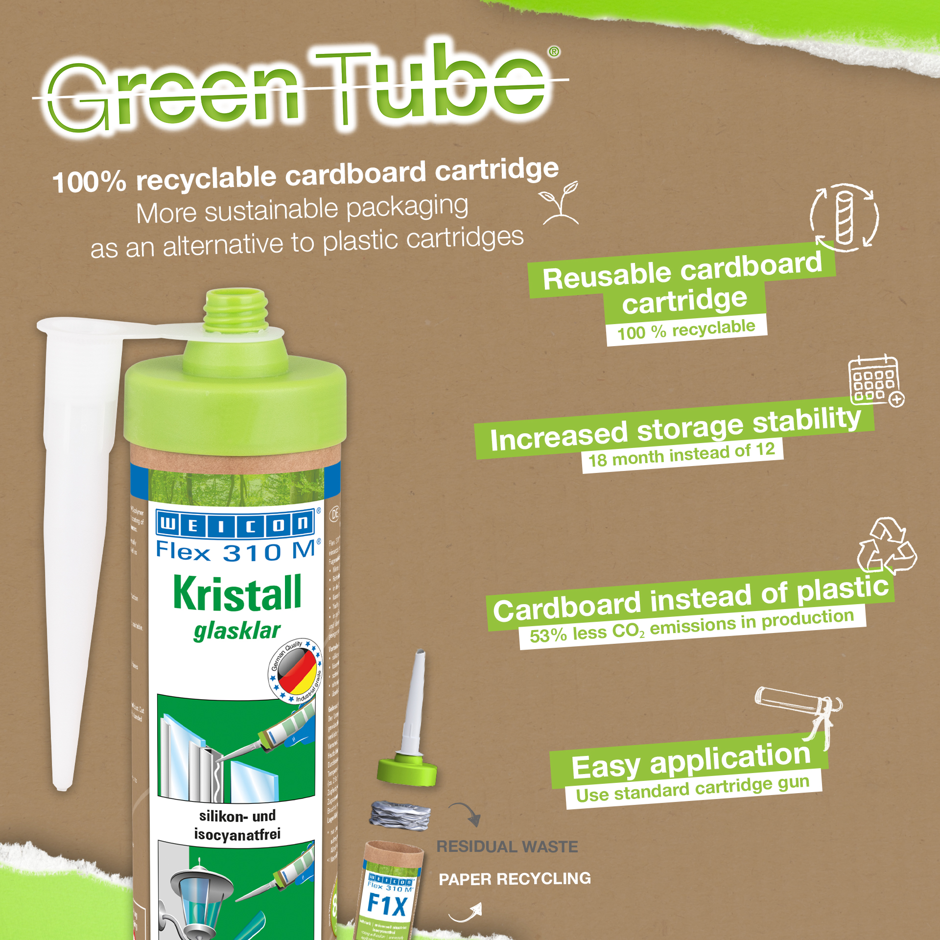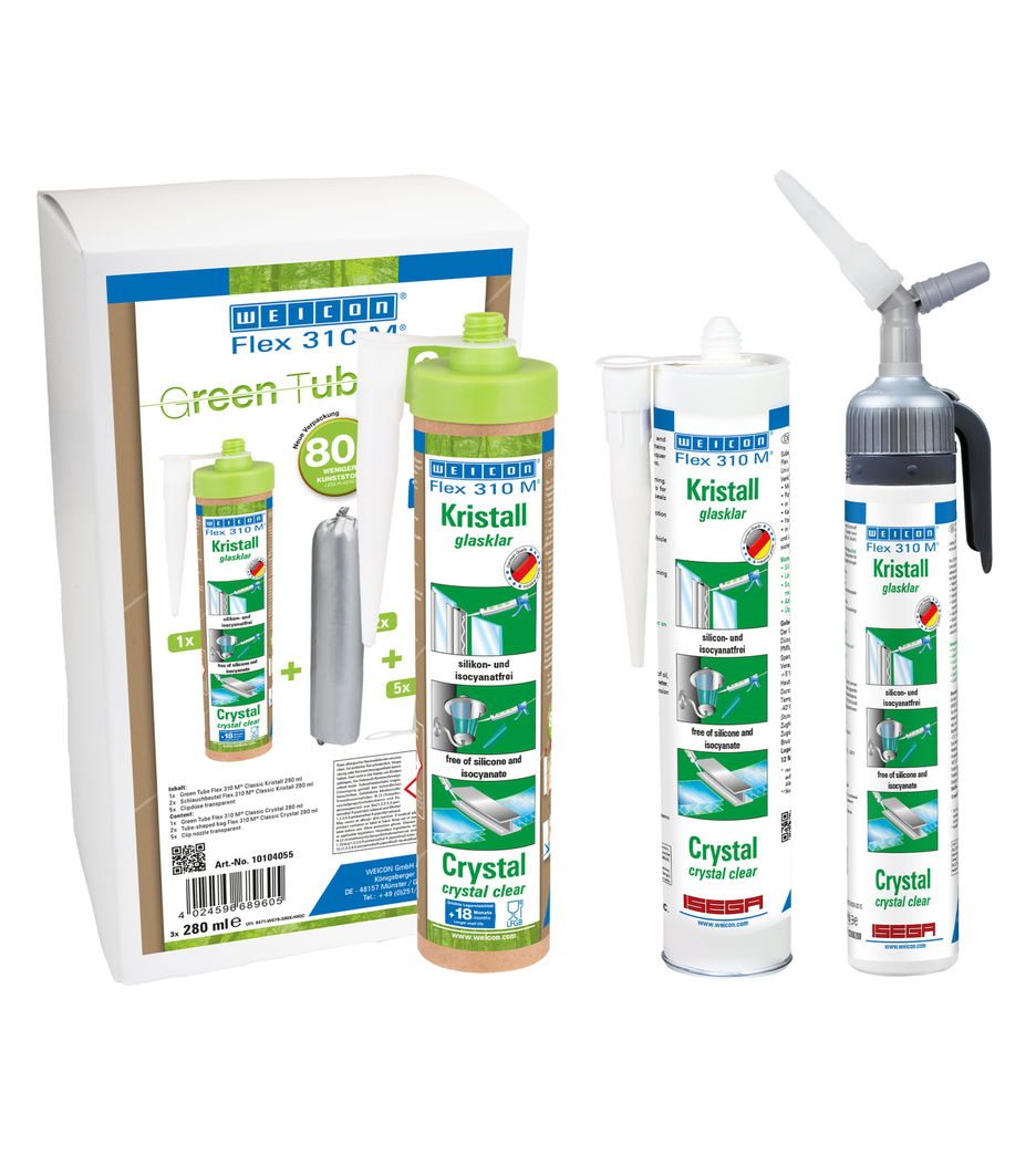 WEICON Flex 310 M® Crystal jest mocnym, dającym się malować (na mokro) i piaskować produktem o bardzo dobrej odporności na starzenie o dobrej odporności na promieniowanie UV, wodę słodką i słoną. Nie zawiera silikonów, izocyjanianów, halogenów ani rozpuszczalników. Produkt posiada atest ISEGA dopuszczający do stosowania jako klej w sektorze przetwórstwa żywności. Flex 310 M® Crystal jest elastycznym klejem na bazie MS polimerów i przeznaczonym do łączenia szkła, PC*, PMMA* i szkła akrylowego*, metali, wielu tworzyw, ceramiki i kamienia. Po utwardzeniu tworzy przejrzyste połączenie, stąd jest szczególnie polecany do aplikacji wymagających niewidocznej spoiny. Flex 310 M® Crystal może być stosowany w budowie pojemników i urządzeń, kontenerów, karoserii i pojazdów, konstrukcjach statków, jachtów i łódek, systemach klimatyzacji i wentylacji, przemyśle energetycznym i elektrycznym oraz wszędzie tam, gdzie nie znajdują zastosowania silikony.