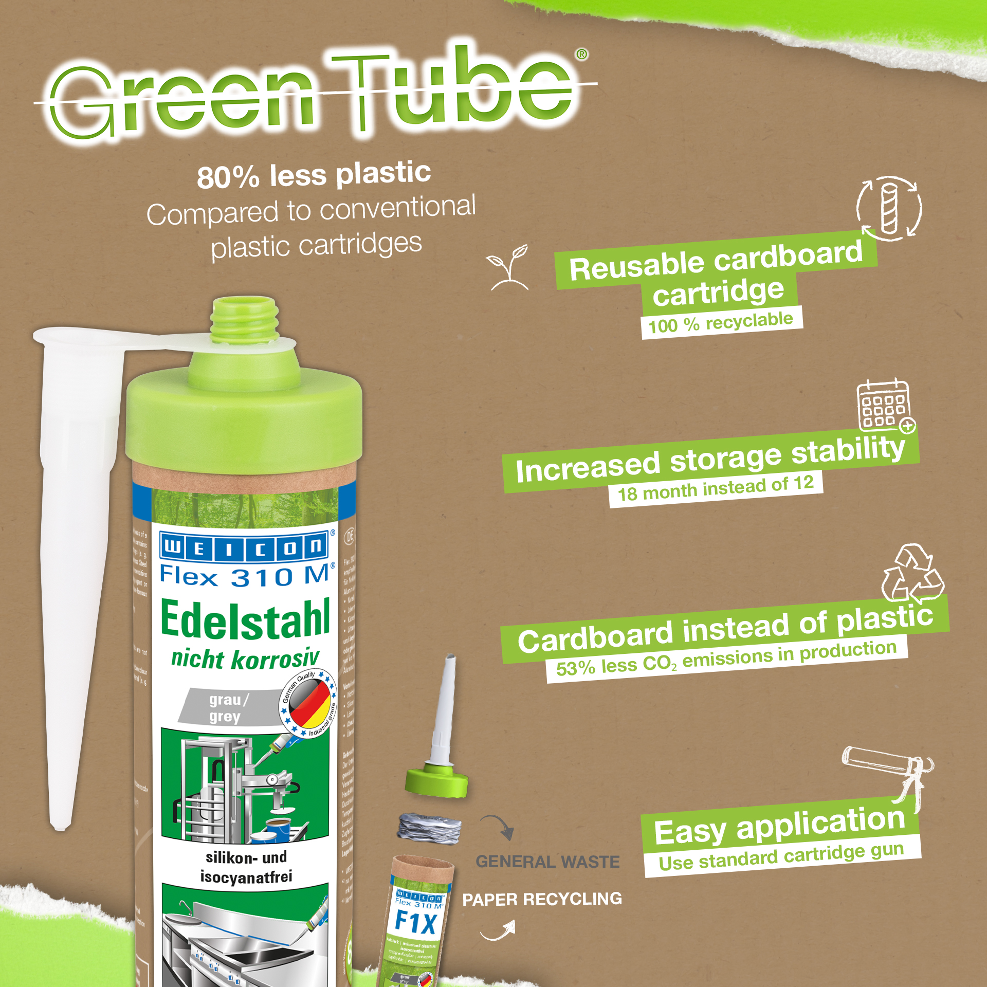 Klej i uszczelniacz WEICON Flex 310 M Stainless Steel charakteryzuje się dużą siłą klejenia, może być malowany metodą "na mokro", nadaje się do szlifowania, jest odporny na starzenie, odporny na promieniowanie UV, nie zawiera silikonu, izocyjanianu, halogenu, rozpuszczalnika i nie jest korozyjny. Produkt posiada certyfikat ISEGA i może być stosowany jako klej w technologii żywności. Flex 310 M Stainless Steel jest elastycznym klejem na bazie polimerów MS i nadaje się do klejenia, jak również uszczelniania szwów i połączeń na metalach takich jak stal nierdzewna, aluminium i metale kolorowe. Stosowany jest również wszędzie tam, gdzie kolor uszczelniacza i kleju musi być dopasowany do materiału (np. stal nierdzewna, aluminium, itp.). WEICON Flex 310 M Stainless Steel może być stosowany w konstrukcjach metalowych, przy budowie kontenerów i aparatów, w przemyśle spożywczym, przy budowie kuchni i pomieszczeń sanitarnych, w technice wentylacyjnej i klimatyzacyjnej oraz wszędzie tam, gdzie nie sprawdzają się silikony lub produkty zawierające silikon.