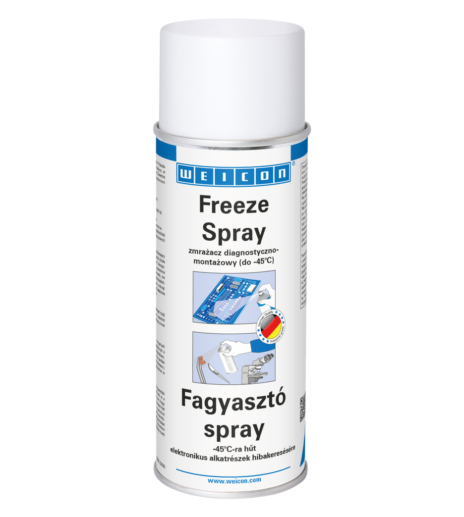 WEICON Freeze Spray przeznaczony jest do miejscowego schładzania powierzchni. Posiada wiele zastosowań przy naprawach i diagnostyce i w utrzymaniu ruchu w przemyśle. WEICON Freeze Spray błyskawicznie schładza powierzchnie do -45 °C umożliwiając stosowanie punktowe nawet na najdrobniejszych elementach konstrukcji. Freeze Spray jest nieprzewodzący i neutralny dla materiałów (z wyjątkiem tworzyw) i posiada wiele potencjalnych aplikacji przemysłowych.