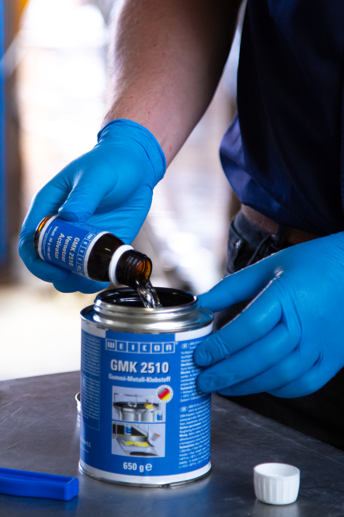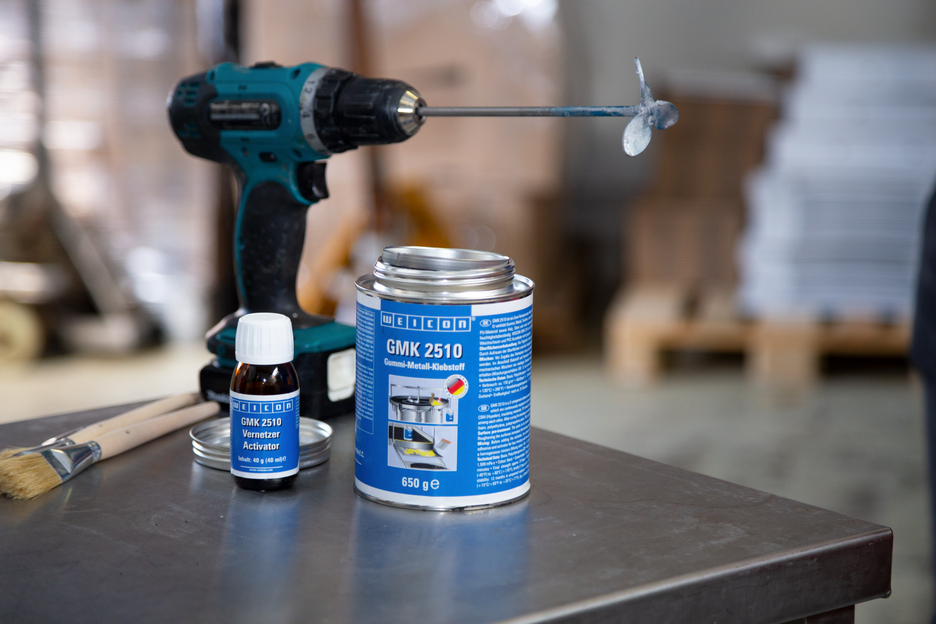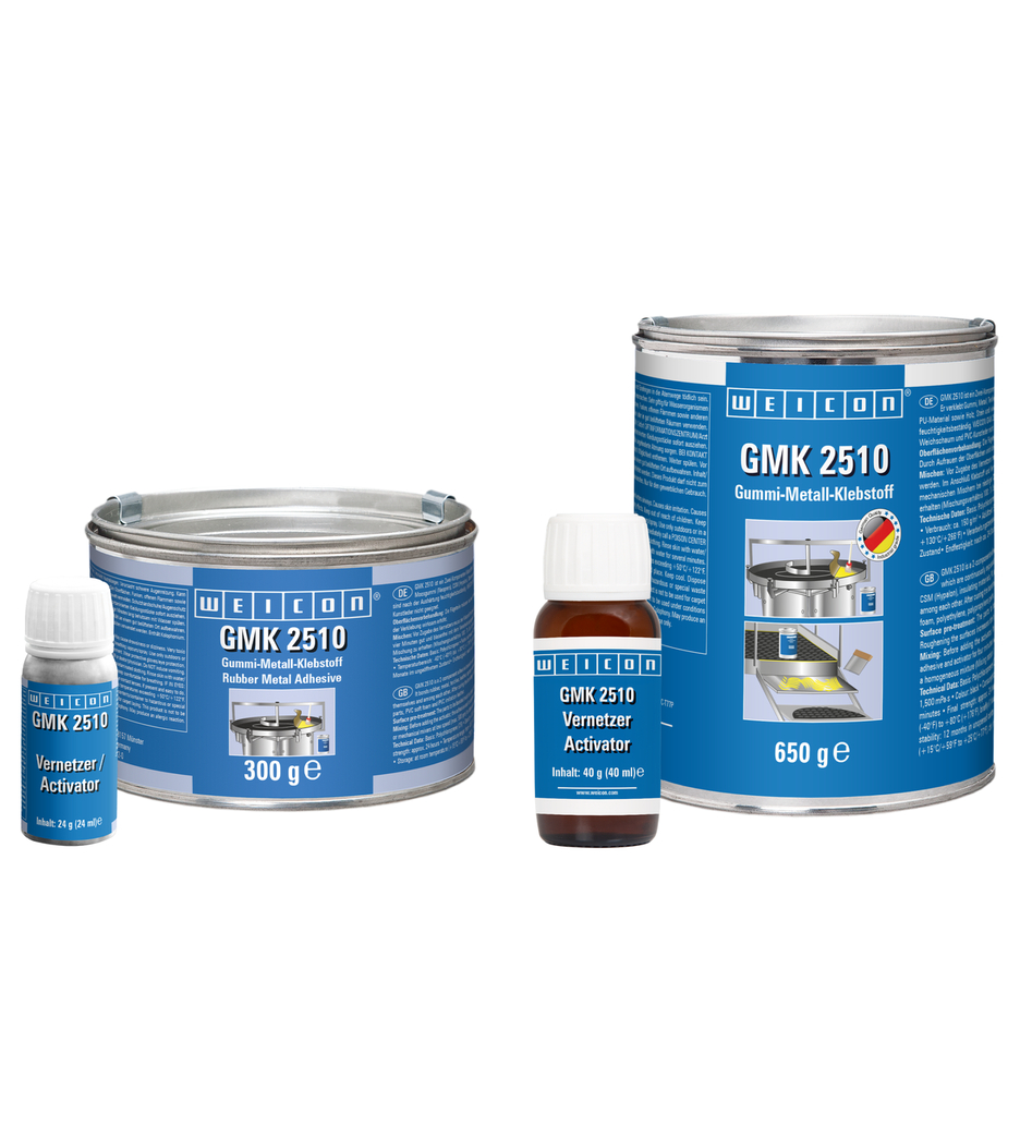 WEICON GMK2510 jest dwuskładnikowym klejem kontaktowym na bazie polichloroprenu (CR) do mocnego i elastycznego łączenia dużych powierzchni, które podlegają wysokim obciążeniom dynamicznym. W porównaniu z klejem jednoskładnikowym GMK 2410 charakteryzuje się wyższą siłą wiązania i podwyższoną odpornością termiczną. WEICON GMK2510 łączy gumę, metale, włókna tekstylne, skórę, gumę komórkową (np. neopren), CSM (Hypalon), filc, materiały izolacyjne, tekstylne, drewno i wiele tworzyw. Po utwardzeniu tworzy połączenie odporne na wilgoć. WEICON GMK2510 nie jest zalecany do łączenia polistyrenu, polietylenu, polipropylenu, elastycznych pianek PVC oraz sztucznej skóry PVC.