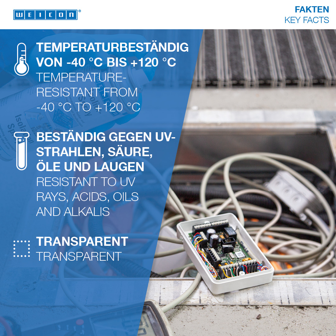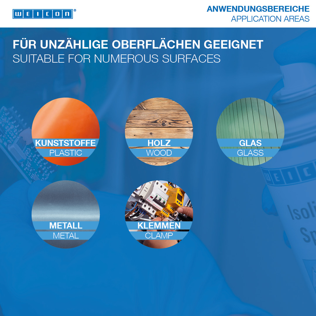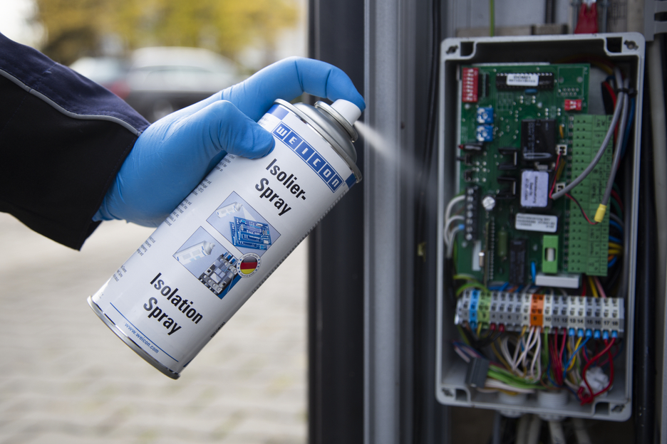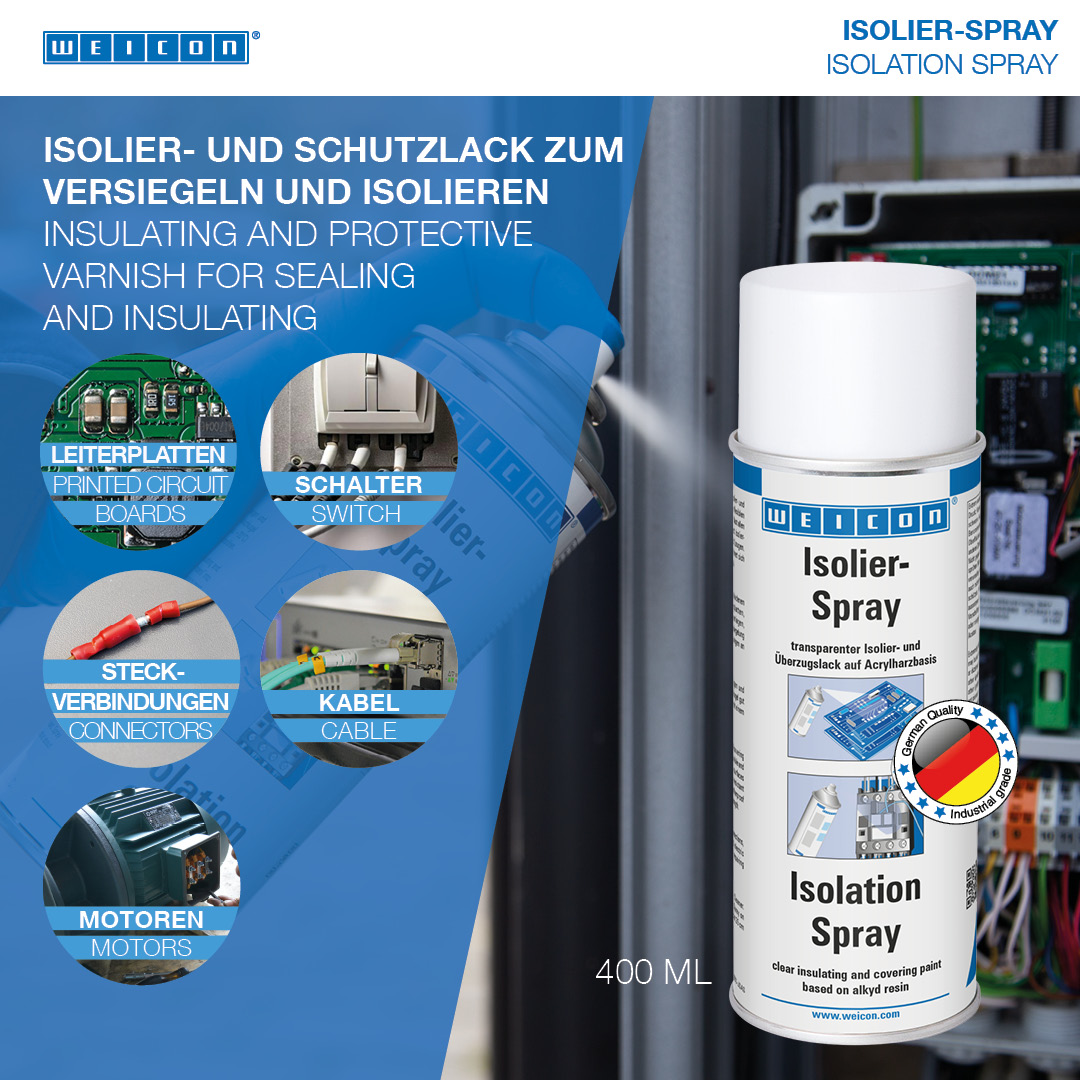 WEICON Isolation Spray to przezroczysty lakier izolacyjny na bazie żywicy akrylowej. Tworzy odporną elastyczną warstwę, która wykazuje doskonałą przyczepność do metalu, szkła, tworzywa sztucznego lub drewna. Jest odporny na promieniowanie UV, kwasy, oleje i ługi. Jest odporny na wilgoć i warunki pogodowe i ma wysoką wytrzymałość dielektryczną. Spray chroni przed wilgocią i różnymi oparami. Służy jako powłoka ochronna dla płytek obwodowych, połączeń elektrycznych, przełączników, tablic rozdzielczych, elementów elektronicznych i cewek, jako uniwersalny uszczelniacz w elektrotechnice lub do naprawy izolacji silników elektrycznych, uzwojeń i ram.
