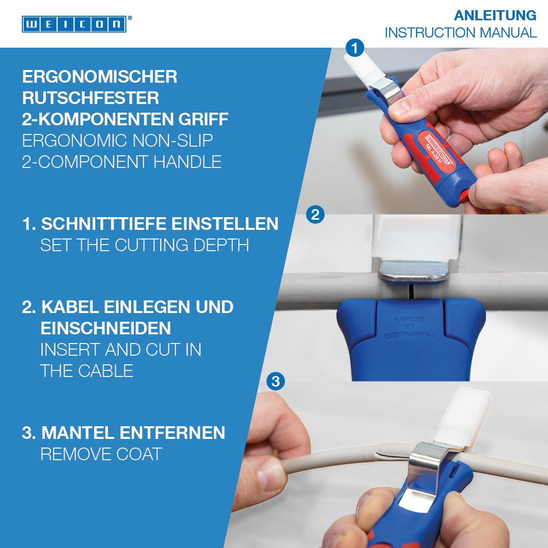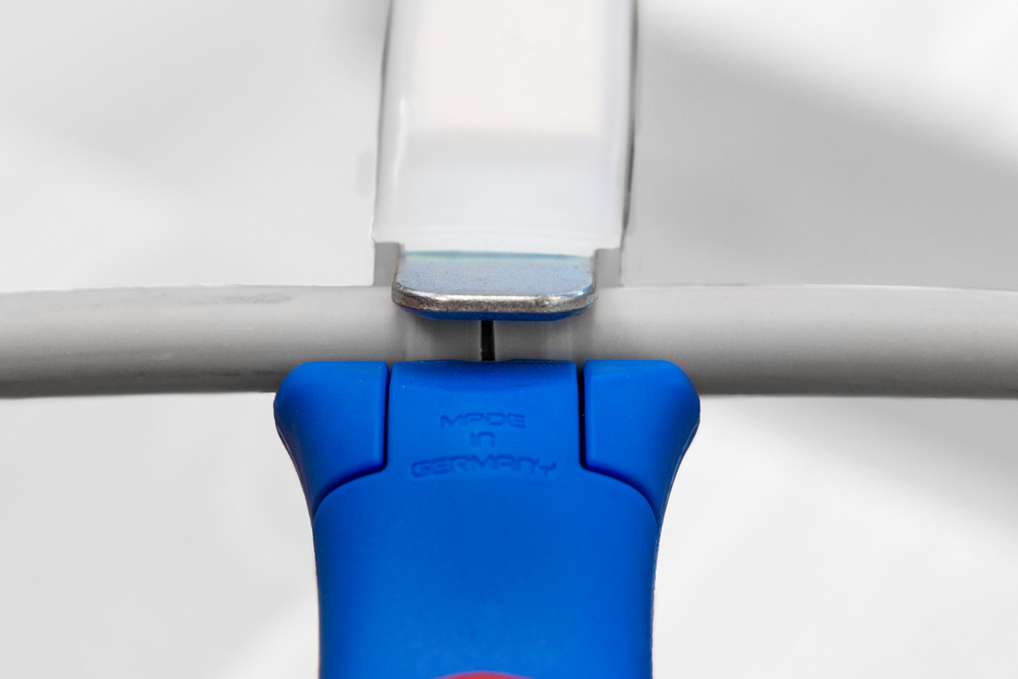 Duża średnica uchwytu zapewnia optymalny kontakt dotykowy. Płynnie regulowane i łatwe w obsłudze pokrętło nastawne. Precyzyjne, szybkie i bezpieczne ściąganie osłonek. Szybka wymiana wewnętrznych nożyków dzięki zamkowi bagnetowemu