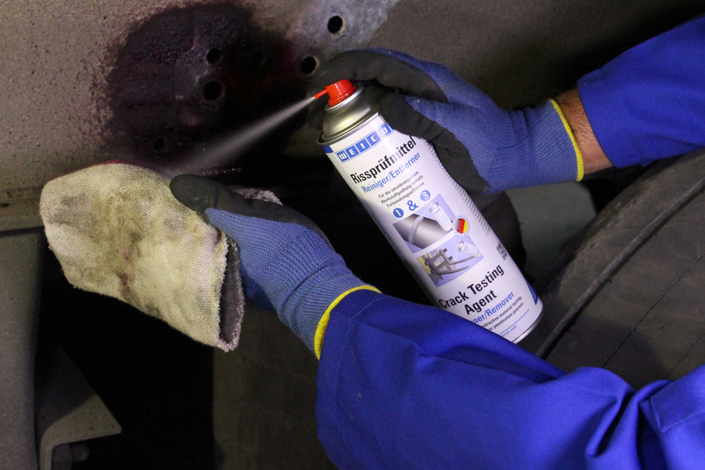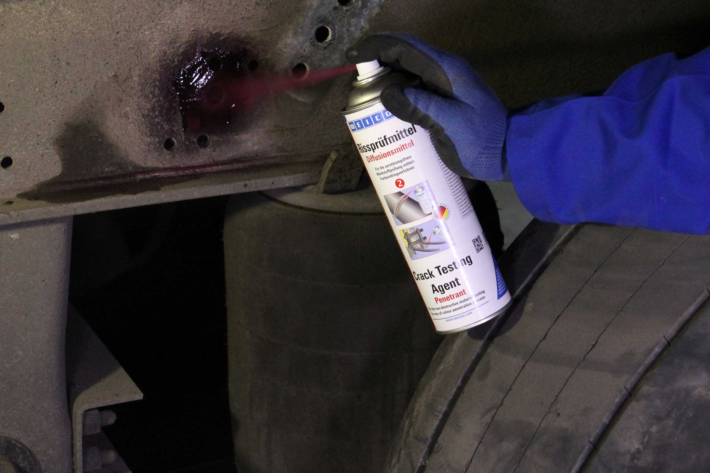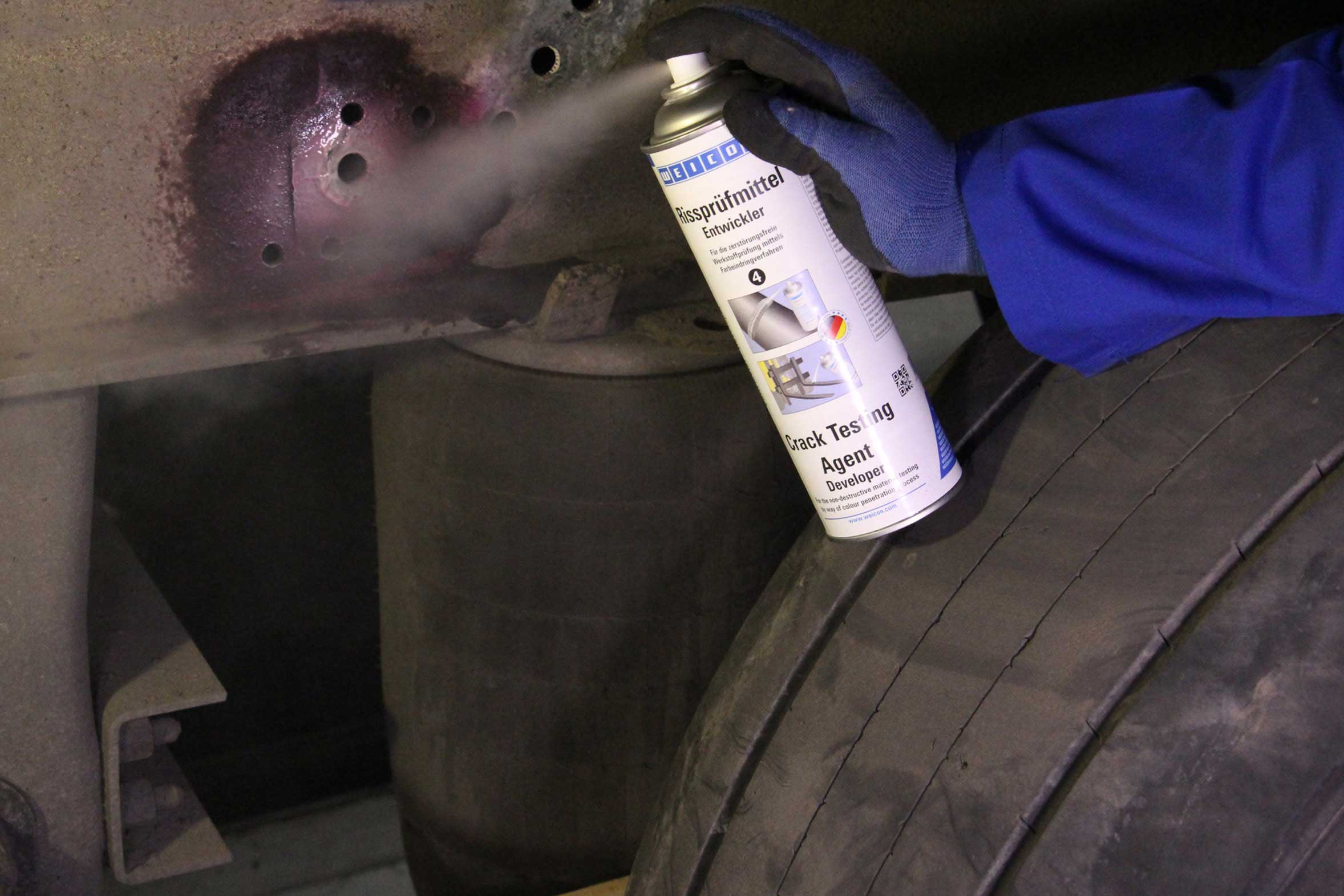 Te działania konserwacyjne służą optymalizacji procesów operacyjnych, a także bezpieczeństwa pracy. Badanie penetracyjne z wykorzystaniem barwników jest ustaloną metodą badania materiału w celu wczesnego wykrycia i wyeliminowania pęknięć oraz małych nieszczelności. WEICON Crack Testing Agent to system składający się z trzech specjalnych sprayów, za pomocą których można łatwo i bez komplikacji przeprowadzić test penetracyjny - jak tutaj na ciężarówce.