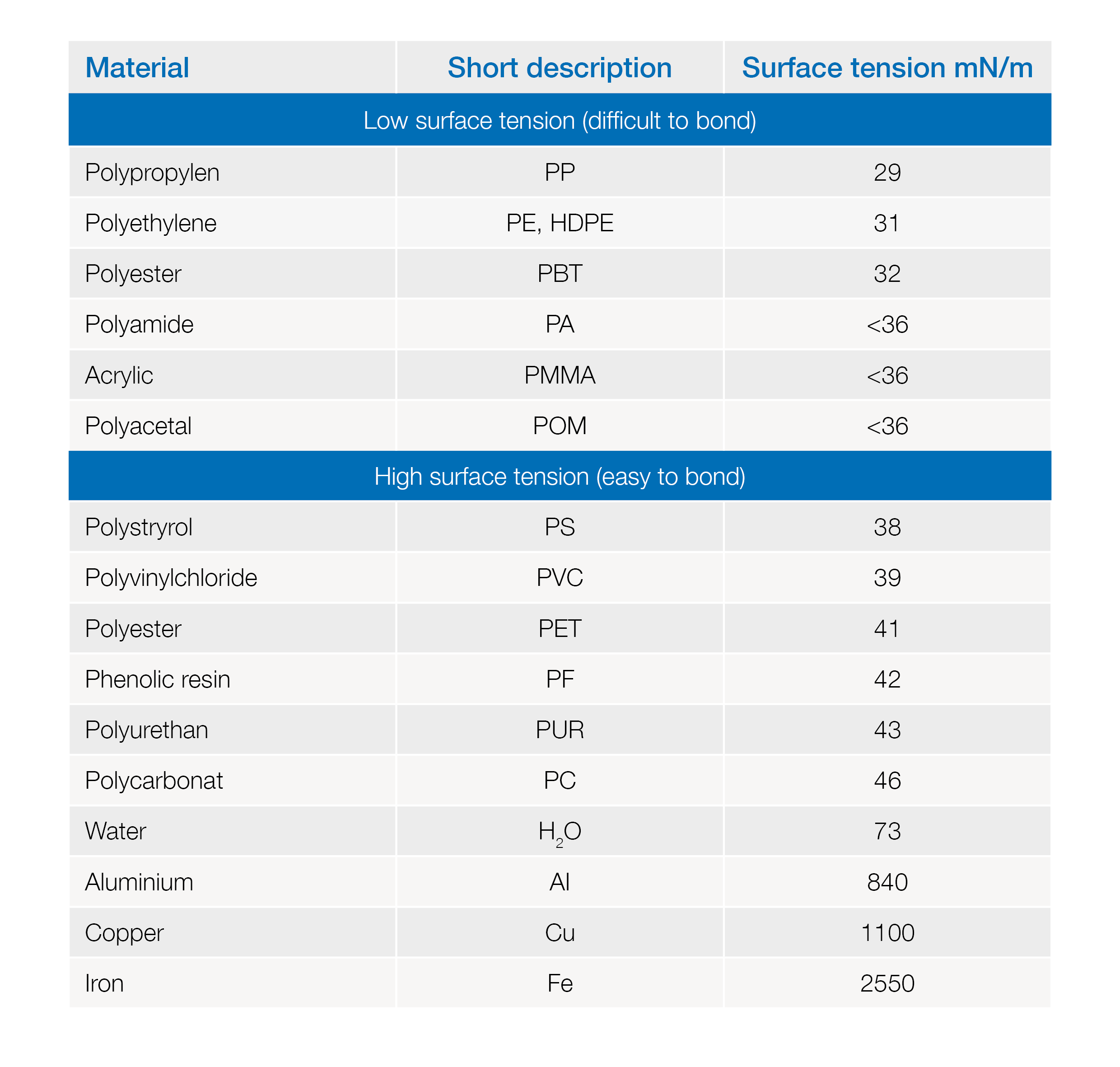 Tutaj znajdziesz przegląd tworzyw sztucznych i ich napięcia powierzchniowe. Tworzywa sztuczne, które są łatwe do sklejenia to PVC lub poliwęglan.