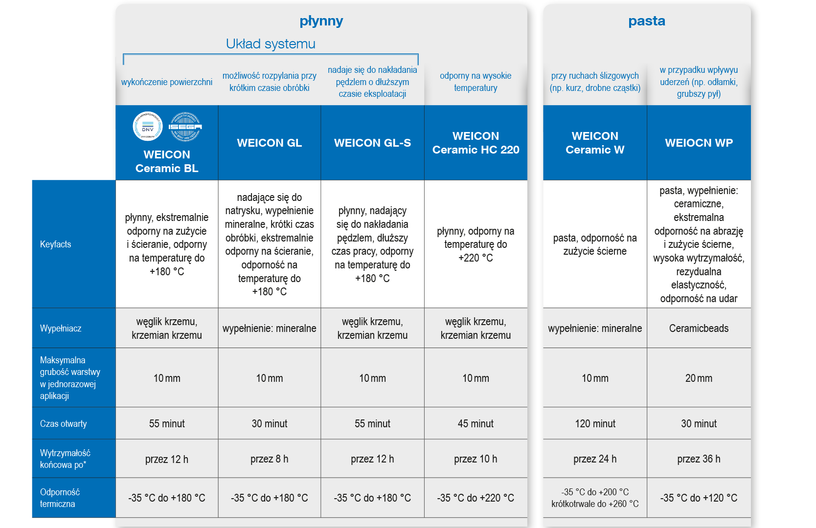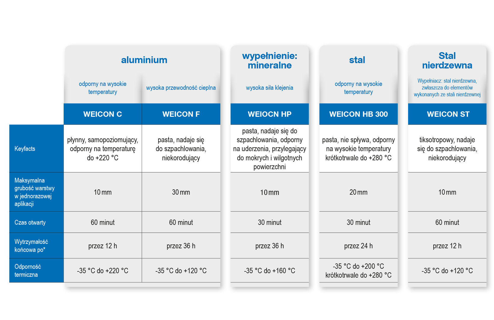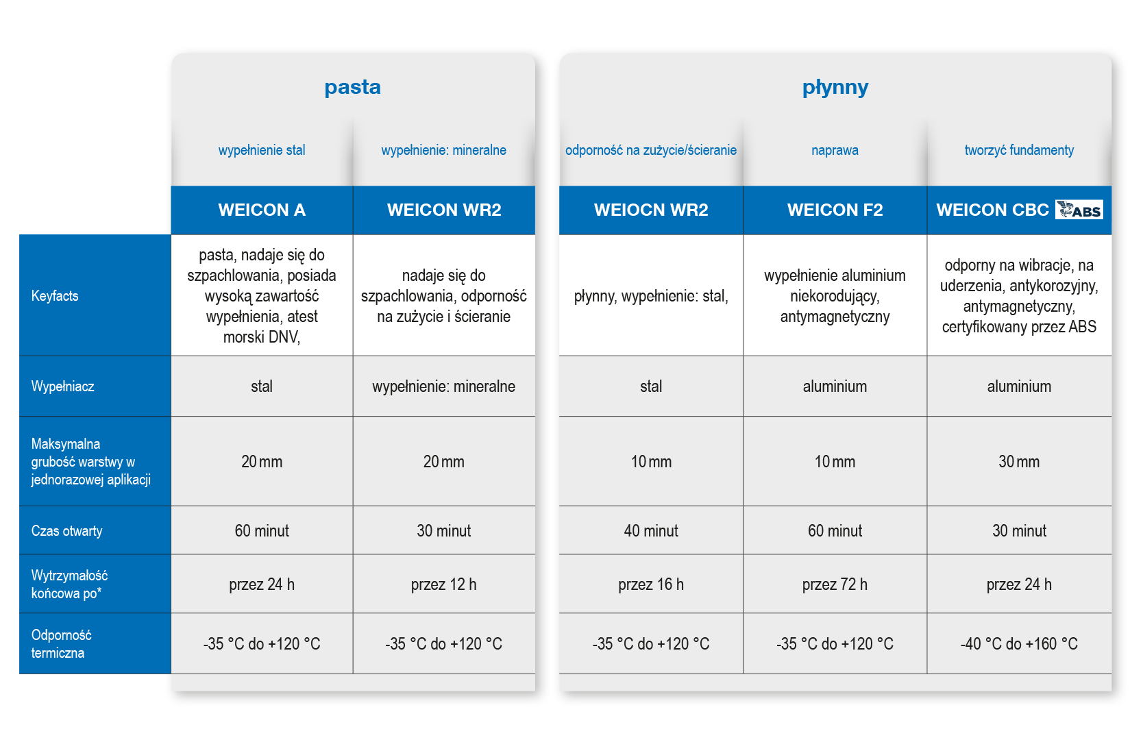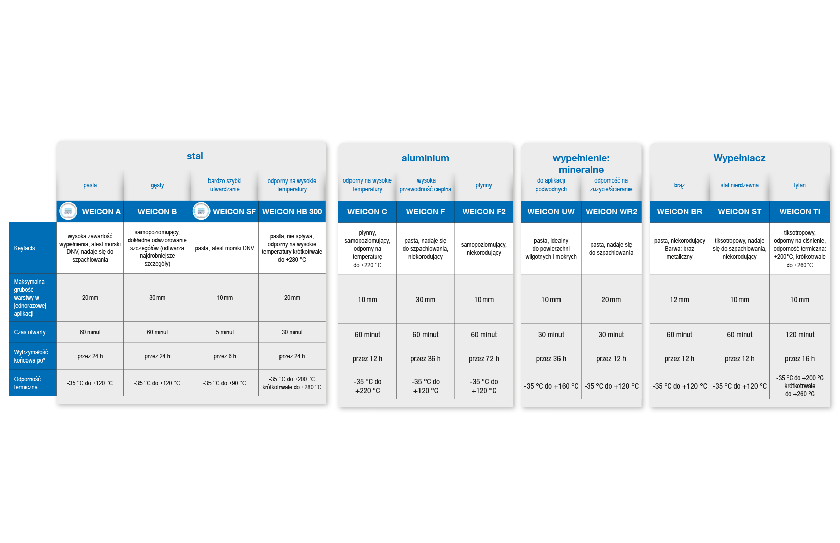 WEICON oferuje całą gamę produktów, które mogą być stosowane jako masy zalewowe, do podklejania i pokrywania, a także do wyrównywania szczelin. Stosowane są również w produkcji prototypów lub uchwytów. Specjalne produkty mogą być również stosowane do naprawy systemów przenośników, prowadnic lub szyn nośnych. Żywice epoksydowe zapewniają ulgę w konstrukcjach stalowych, budowie torów, na systemach dźwigowych i w naprawach mostów. Zaletami tych systemów naprawczych jest wysoka płynność, wysoka przyczepność i bardzo dobra odporność na nacisk. Zapewniają również długotrwałą ochronę przed korozją.