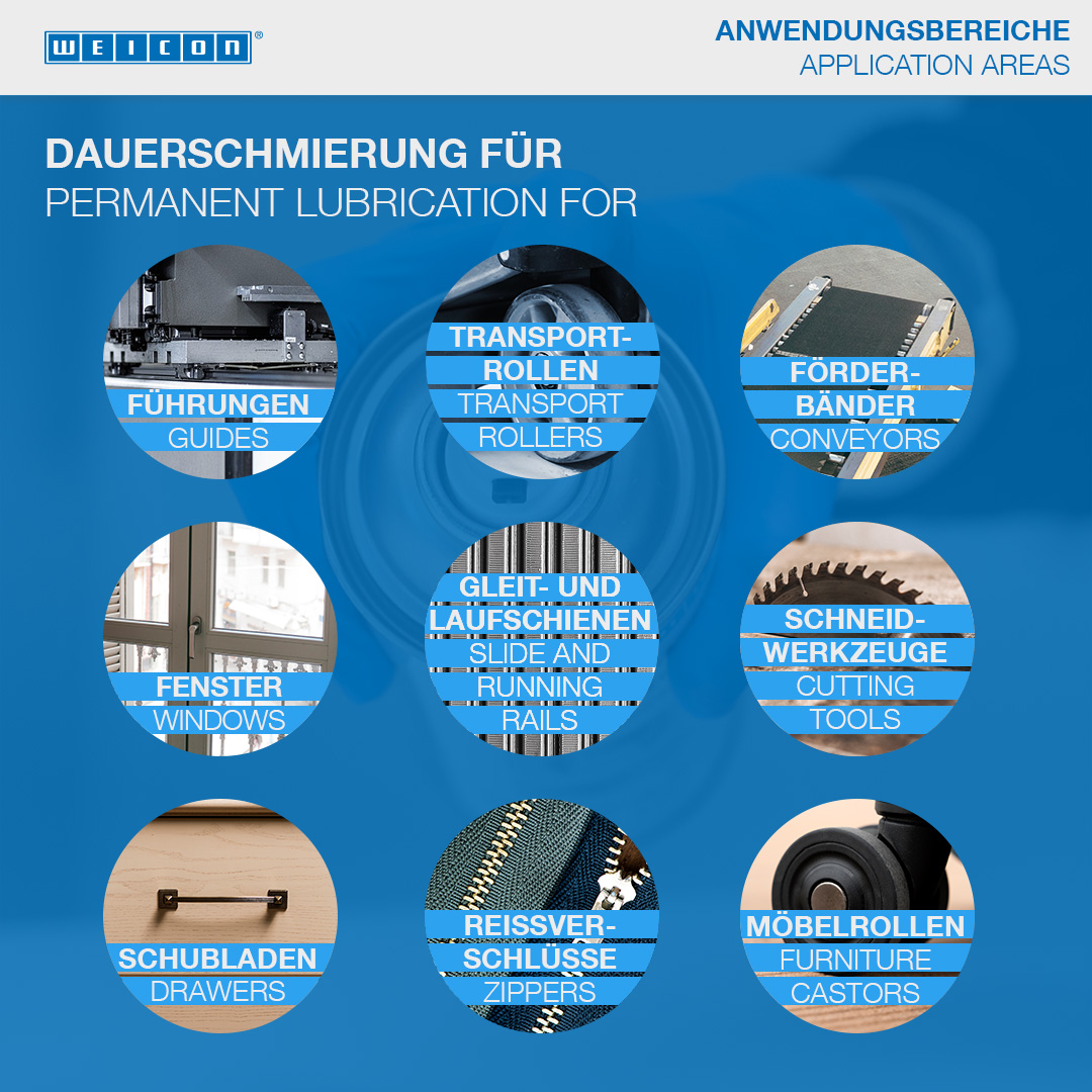 WEICON PTFE-Spray jest bezolejowym, suchym smarem na bazie P T F E posiadającym świetne właściwości poślizgowe. Przylega do wszelkich powierzchni metalowych, drewnianych i wykonanych z tworzyw. Wysoka zawartość PTFE zmniejsza współczynnik tarcia, zaś sama powłoka smaru nie przyjmuje pyłu, brudu ani wody, jest odporna na smary, oleje jak i wiele chemikaliów. PTFE Spray znajduje zastosowanie na ślizgach i prowadnicach, przenośnikach taśmowych, rolkach transportowych, w mechanizmach okiennych, narzędziach tnących i urządzeniach pakujących. Może być tez stosowany jako trwały smar w łożyskach z tworzyw, jako wodoodporne zabezpieczenie na uszczelkach papierowych i korkowych, jako zamiennik silikonowych preparatów antyadhezyjnych oraz wszędzie tam, gdzie nie można stosować smarów na bazie olejów i mydeł.