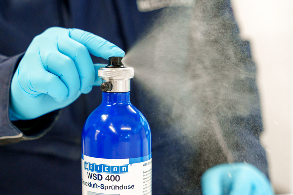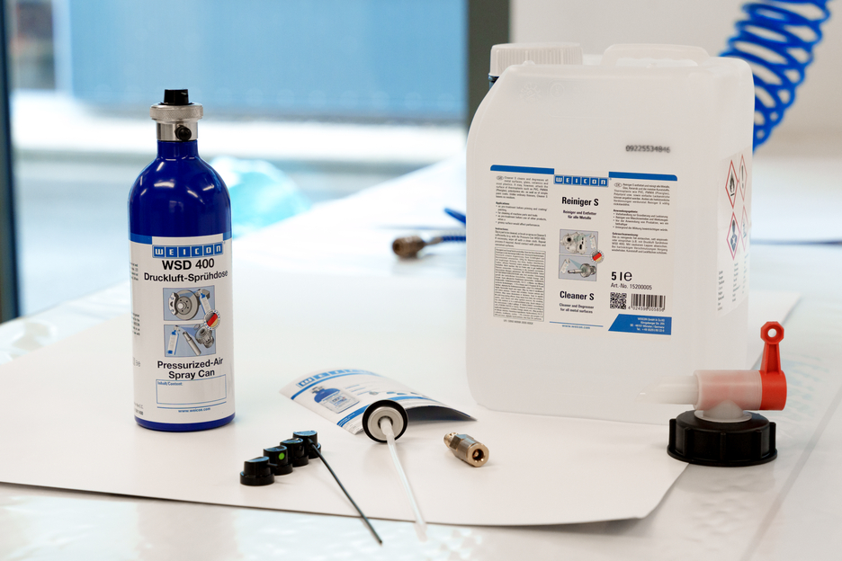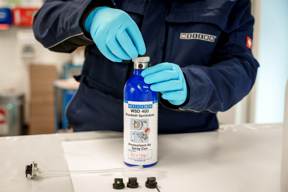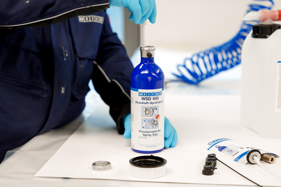 WSD 400 jest wielokrotnego użytku puszką aerozolową przystosowaną do podawania wielu Płynów Technicznych WEICON. Ciśnienie w puszce uzupełniane jest sprężonym powietrzem poprzez adapter (dodatkowy) lub bezpośrednio z instalacji centralnej sprężonego powietrza zaworem typu samochodowego. Optymalne ciśnienie robocze puszki to 7,5 bar. WSD 400 posiada następujące akcesoria pomocnicze: ► adapter do napełniania z dowolnego układu sprężonego powietrza ► zestaw 4 różnych końcówek natryskowych wraz z zapasowym zaworem głównym puszki
