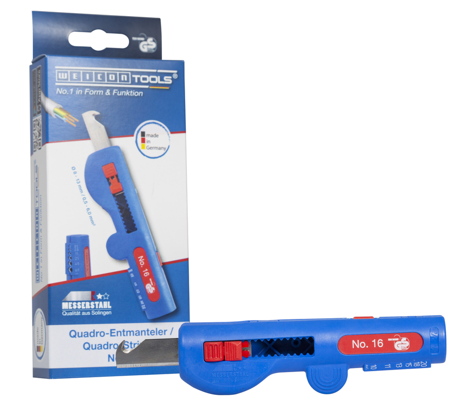 Zdejmowanie izolacji poprzez nacinanie poprzeczne i wzdłużne. Wymienne ostrze hakowe, mocno blokowane w dowolnej pozycji. Antypoślizgowy kształt uchwytu. Ułatwia to codzienną pracę o dodatkowo zwiększa bezpieczeństwo. Narzędzie optymalne do pracy na kablach NYM od 3 x 1,5 mm² do 5 x 2,5 mm². Jakość 100 % Made in Germany. Wykonany z poliamidu wzmocnionego włóknem szklanym - wytrzymały, ergonomiczny kształt, wygodnie leży w dłoni. Wysokiej jakości stal noża z firmy Solingen gwarantuje trwałe ostrze. Atest nimiecki TÜV/ GS. Quadro-Stripper Nr 16 to nowo opracowane narzędzie dla profesjonalnych użytkowników w przemyśle i handlu. Narzędzie spełnia kilka funkcji: cięcie okrągłe - cięcie wzdłużne - zdejmowanie izolacji. W ten sposób można zastąpić jednym narzędziem kilka narzędzi. Oszczędza to pieniądze i miejsce w skrzynce narzędziowej. Optymalnie zintegrowane prowadzenie kabli w obudowie zapewnia bezpieczne, precyzyjne i wygodne usuwanie wszystkich popularnych okrągłych i wilgotnych kabli pokojowych o średnicy 8,0 - 13,0 mm. (np. kabel NYM od 3 x 1,5 mm² do 5 x 2,5 mm). Ergonomiczny kształt rączki sprawia, że narzędzie jest wyjątkowo łatwe w użyciu. Charakterystyczny uchwyt oznacza, że striptizerka Quadro nr 16 leży dobrze i pewnie w dłoni. Ułatwia to codzienną pracę i zwiększa bezpieczeństwo. Głębokość cięcia nie musi być regulowana ręcznie. Wszystkie popularne elastyczne i solidne przewody o przekroju 0,5 - 6 mm² mogą być przetwarzane w zintegrowanym obszarze usuwania izolacji.