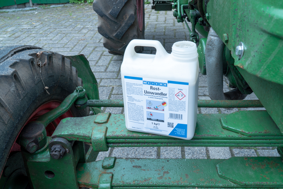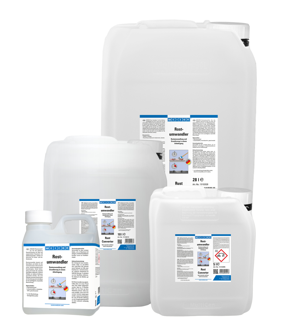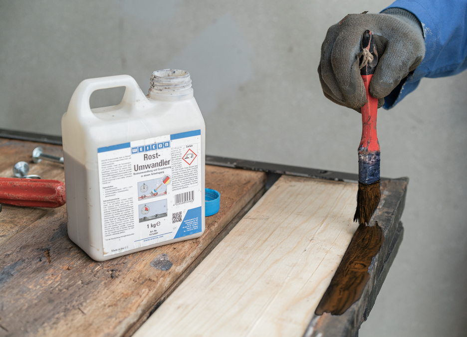 WEICON Rust Converter służy do skutecznej neutralizacji rdzy na skorodowanych powierzchniach ze stali i żeliwa oraz niezawodnie zatrzymuje proces korozji. Dzięki specjalnej formule substancji czynnych na bazie kwasu i taniny wnika w warstwę rdzy. W procesie chemicznym przekształca tlenki żelaza w stabilną warstwę oraz dodatkowo zapewnia tymczasową ochronę antykorozyjną dzięki fosforanowi cynku. W zależności od zawartości węgla w metalu, obrabiana powierzchnia zmienia zabarwienie na niebieskawe, brązowawe aż do czarnego. Warstwa ta stanowi idealną podstawę dla kolejnych powłok ochronnych, takich jak WEICON Zinc Spray. WEICON Rust Converter osiąga optymalne rezultaty na lekko skorodowanych powierzchniach o stopniu skorodowania A i B. Luźną rdzę i luźne części należy wcześniej usunąć mechanicznie. Konwerter staje się aktywny dopiero po nałożeniu na rdzę lub metal i może być stosowany na dużych powierzchniach we wszystkich skorodowanych miejscach, na przykład na maszynach i urządzeniach, sprzęcie rolniczym oraz pojazdach silnikowych. W przeciwieństwie do innych konwerterów, WEICON Rust Converter jest usuwany z powierzchni za pomocą czystej wody i gąbki lub miękkiej szczotki po upływie czasu reakcji. Służy to usunięciu pozostałości materiałów, które powstały podczas procesu konwersji.