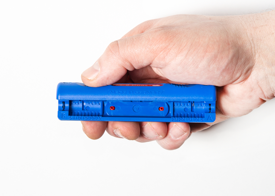 Obszar roboczy: 4,8 - 7,5 mm Ø. Stopniowane ściąganie izolacji z wszystkich powszechnie stosowanych kabli koaxialnych. Nie jest potrzebne ustawienie głębokości cięcia. Nadaje się także do kabli elastycznych. Skala długości (0 - 17 mm) zintegrowana w obudowie
