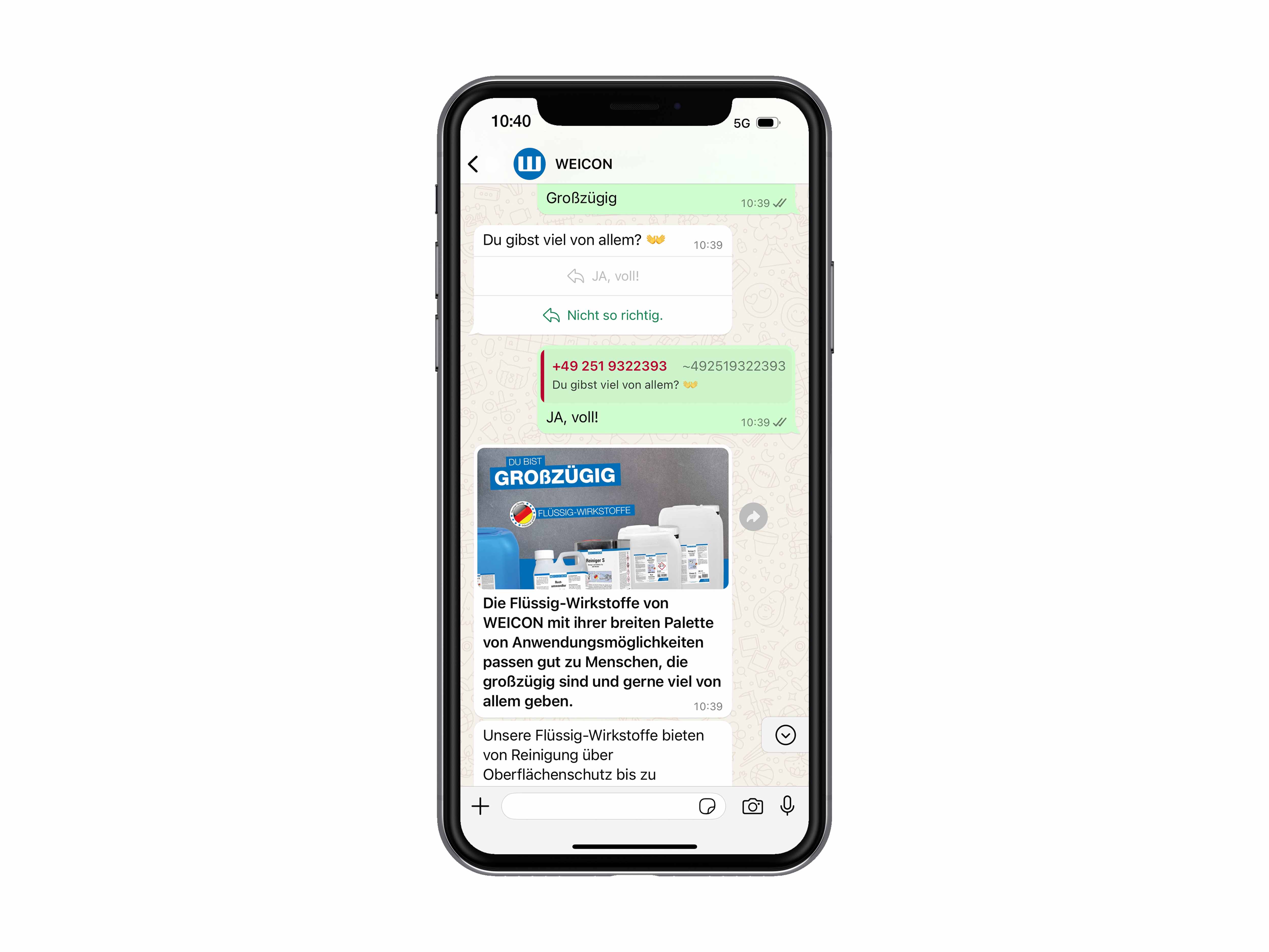 Are you interested in our products in general? But you don't know, for example, whether you would prefer to use a lubricating oil or a lubricating grease, a 1C or 2C adhesive or you are still missing the right tool? Then use our WhatsApp service to receive more information or take our "Which WEICON type am I?" test on WhatsApp.
