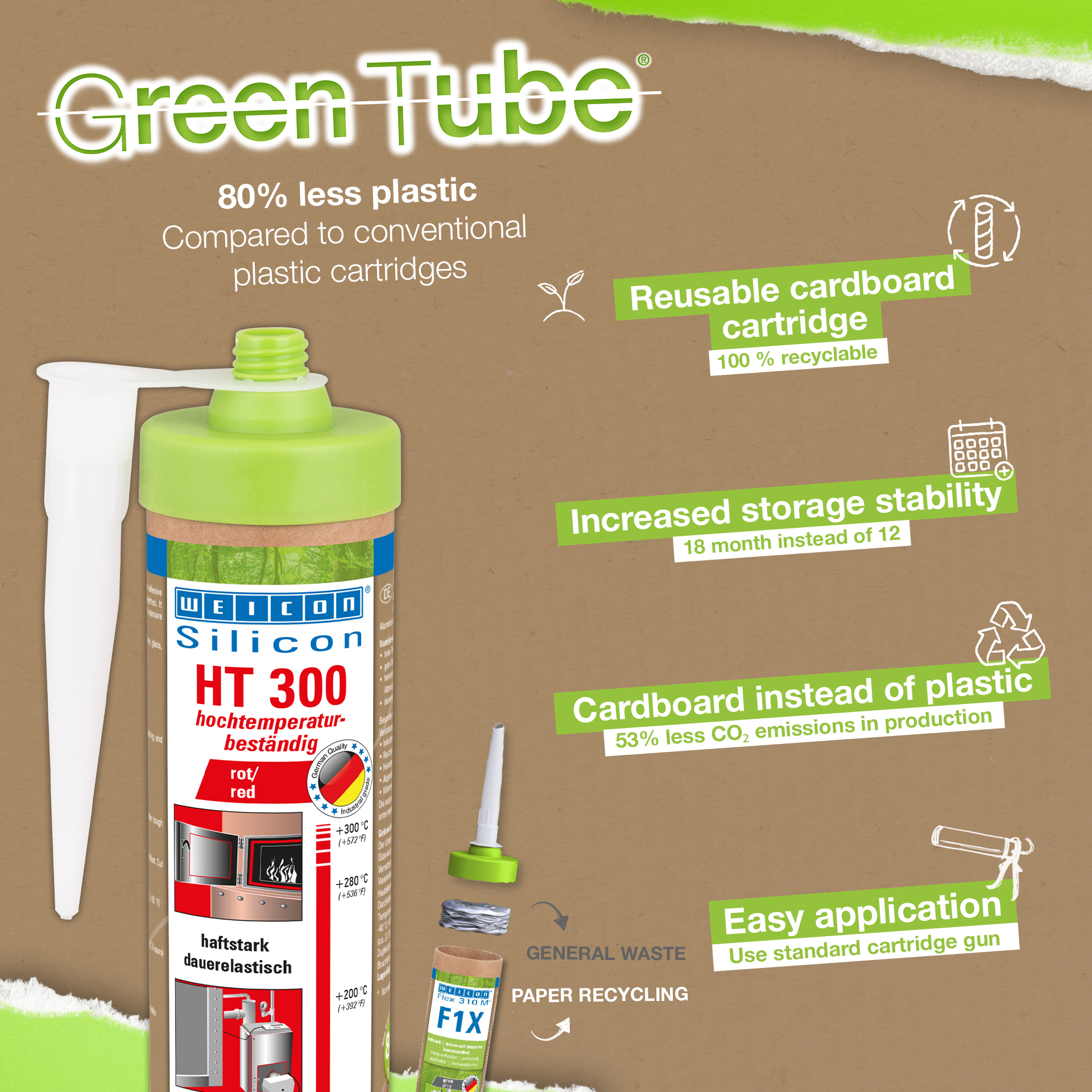 WEICON HT300 jest produktem klejącym i uszczelniającym, nie zawiera rozpuszczalników, posiada czerwoną barwę i sieciowanie octanowe. Wykazuje odporność na czynniki atmosferyczne i starzenie, temperatury do +300 °C oraz bardzo wysoką elastyczność (wydłużenie zrywające 300%). HT 300 szczególnie polecany jest do połączeń i uszczelnień narażonych na bardzo wysokie temperatury, dobrze łączy stal, aluminium, szkło i ceramikę i wiele innych. HT 300 może być stosowany w piecach przemysłowych, układach spalinowych, instalacjach grzewczych , systemach wydechowych i wielu podobnych.