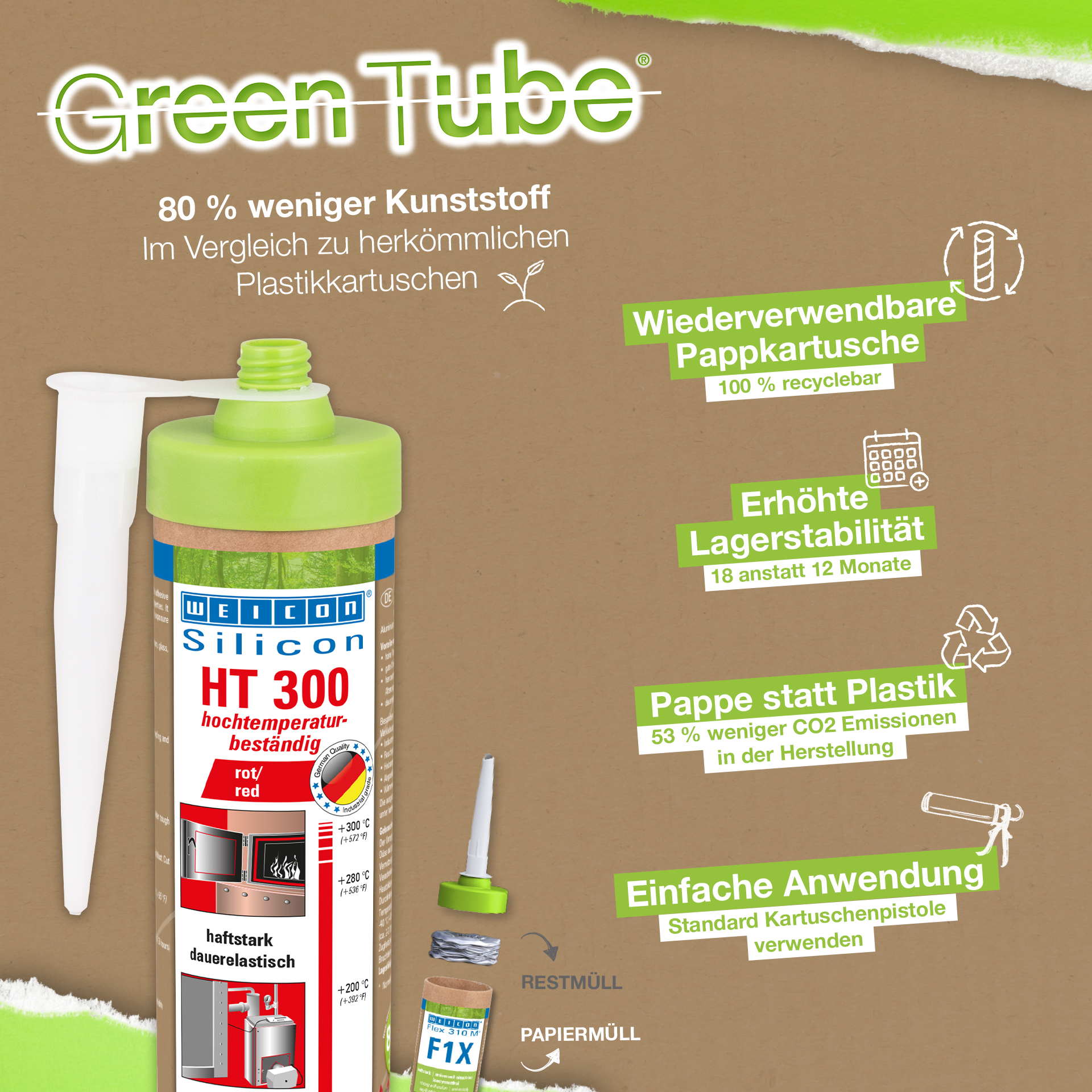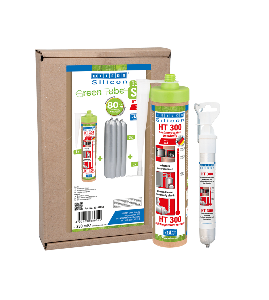 WEICON HT300 jest produktem klejącym i uszczelniającym, nie zawiera rozpuszczalników, posiada czerwoną barwę i sieciowanie octanowe. Wykazuje odporność na czynniki atmosferyczne i starzenie, temperatury do +300 °C oraz bardzo wysoką elastyczność (wydłużenie zrywające 300%). HT 300 szczególnie polecany jest do połączeń i uszczelnień narażonych na bardzo wysokie temperatury, dobrze łączy stal, aluminium, szkło i ceramikę i wiele innych. HT 300 może być stosowany w piecach przemysłowych, układach spalinowych, instalacjach grzewczych , systemach wydechowych i wielu podobnych.