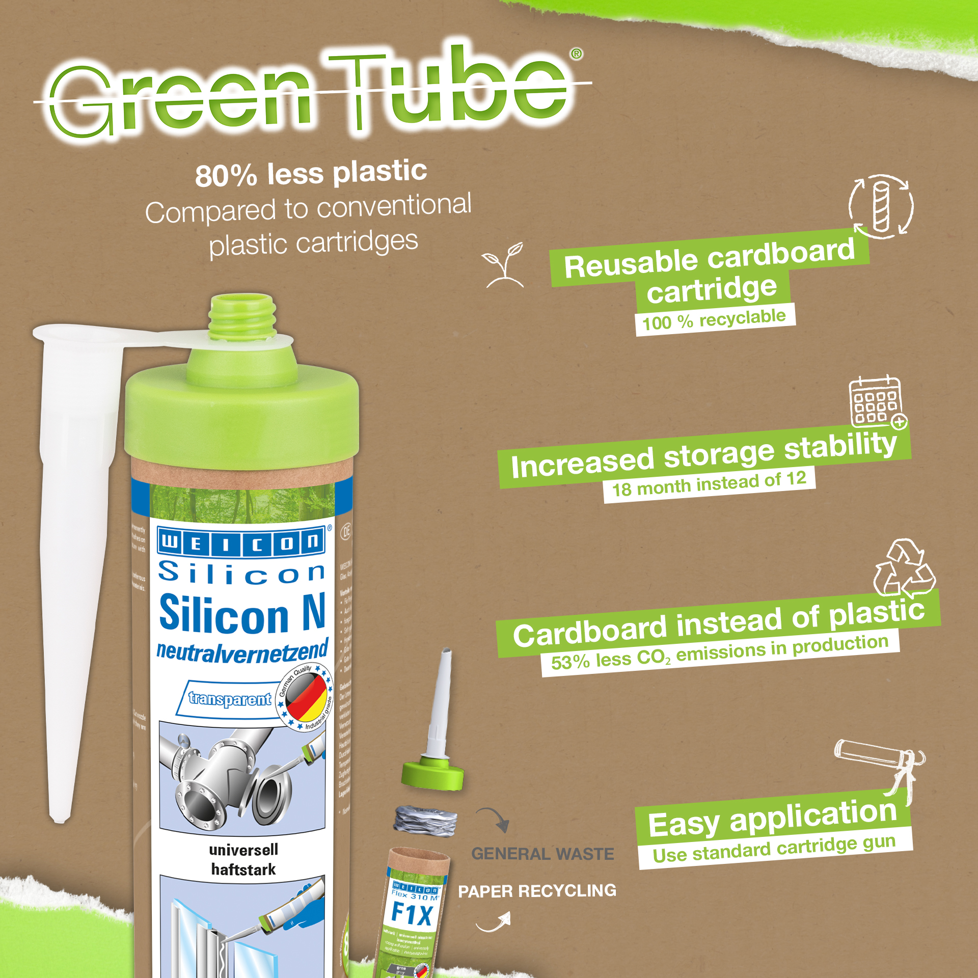 WEICON Silicone N jest produktem klejącym i uszczelniającym, nie zawiera rozpuszczalników i posiada sieciowanie neutralne. Wykazuje odpor ność na czynniki atmosferyczne, temperatury do +180 °C, bardzo wysoką elastyczność (wydłużenie zrywające 800%) i posiada szeroki zakres zastosowań. Silicone N dobrze łączy stal, aluminium, szkło i ceramikę. Silicone N może być stosowany w budowie maszyn i urządzeń, systemach klimatyzacji i wentylacji, przemyśle energetycznym i elektrycznym oraz w sektorze reklamowym i wielu innych aplikacjach.