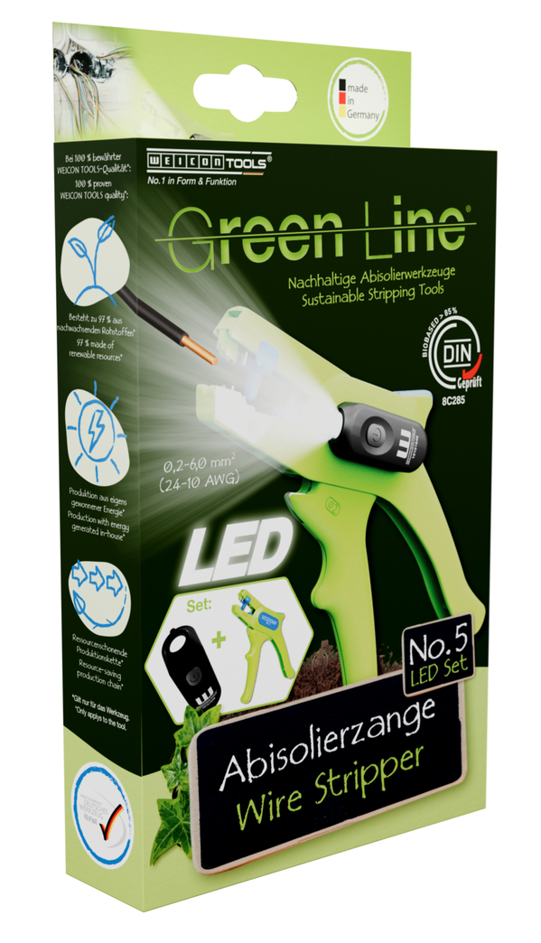 Wire Stripper No. 5 Green Line: Sustainable stripping tool I Space-saving thanks to locking mechanism I automatic wire stripper for all common stranded and solid conductors (0.2 – 6.0 mm²) I very easy to operate I precise working thanks to adjustable length stop (5 - 12 mm) I LED Work Light: the integrated LED light ensures a well-illuminated working area that allows you to work safely with both hands I powerful and rechargeable lithium battery with 180 mAh I 2 hours of bright light (at level 2) after a charging time of 40 minutes I three brightness settings with up to 250 lumens, light colour: 6500K I dustproof, splash-resistant and impact-resistant housing made of polycarbonate, tested acc. to IP65 protection code I can be used with many WEICON TOOLS wire strippers