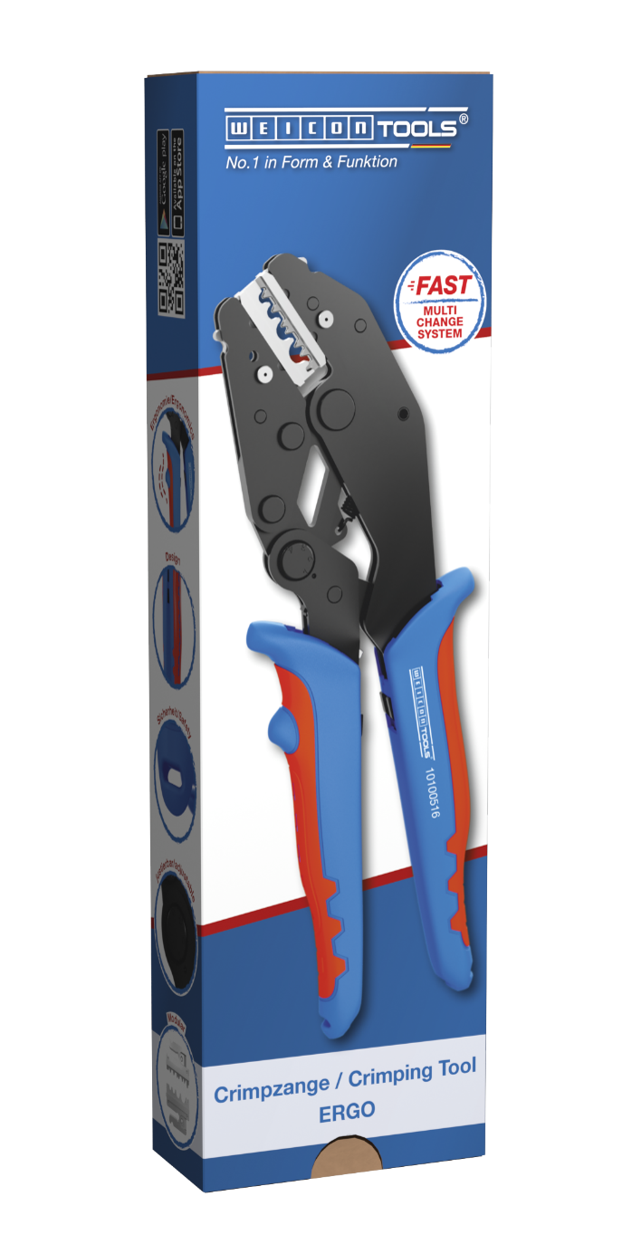 ERGO-CRIMP was developed for the process-safe crimping of various electrical connectors. The crimping tool has a ratchet mechanism with a blocking device to ensure a consistently high crimping quality and results that can be precisely repeated. The mechanism only opens the tool when the crimping process is complete. In addition, an emergency release has been integrated into the handle, which allows the user to open the crimping tool whenever necessary, e.g. in the event of misuse. Another special feature is the adjustable crimping force, which ensures a high crimping quality thanks to the precise eccentric setting. With the Multi Change System, the crimp modules can be exchanged quickly, as needed. The simple change system, which requires no additional tools, ensures that the modules can be installed and removed fast. The ERGO-CRIMP tool includes three pairs of modules made of high-quality steel. One module is suitable for MC4 connectors with cable cross-sections of 2.5 mm², 4 mm² and 6 mm² (14-10 AWG). Another pair of modules is suitable for insulated wire end ferrules from 0.25-6 mm² (AWG 24-10). The third pair of modules was developed for insulated cable lugs from 0.5-6mm² (AWG 22-10). The three pairs of modules are stored safely and protected from dust in a small plastic box. Additional module pairs are also available as accessories. The 2-component handles ensure non-slip and ergonomically friendly handling for maximum force transmission. The tried-and-tested “ice-crack design” was used, which ensures a comfortable feel. The integrated eyelets on the handles can be used to attach a safety catch.
