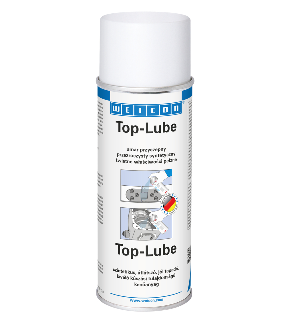Top - Lube jest syntetycznym, przezroczystym smarem przyczepnym do trwałego smarowania wszystkich typów mocno obciążonych podzespołów mechanicznych. WEICON Top-Lube posiada wysoką siłę przylegania, wytrzymałość odśrodkową a także niezwykłe właściwości pełzne. Jest odporny na ciśnienia, wypiera wodę, może być stosowany w ciągłym ruchu z zachowaniem zasad bezpieczeństwa. Nie atakuje następujących tworzyw i elastomerów: PTFE, PE, PA, kauczuk fluorowy, butadienowy, silikonowy i chloroprenowy. Ograniczoną odporność wykazują wobec niego: PE-LD (polietylen o małej gęstości), POM, PP, NBR. WEICON Top-Lube może być stosowany na sworzniach przenoszących napęd, kołach zębatych, w przekładniach ślimakowych, szybko pracujących częściach maszyn, złączach, przegubach, rolkach, łożyskach kulkowych oraz sprężynach w wielu aplikacjach przemysłowych.