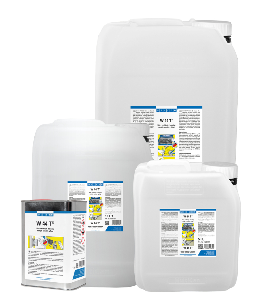 WEICON W 44 T® jest produktem wielozadaniowym, dzięki specjalnej formule i niezwykłym właściwościom pełznym łączy ochronę przed korozją, wypieranie wilgoci, smarowanie, konserwację i czyszczenie w jednym produkcie. WEICON W 44 T® służy do luzowania zatartych, zablokowanych gwintów, śrub i zaworów, penetruje i rozluźnia rdzę, wypiera wilgoć ze styków elektrycznych, zapobiega prądom upływu i ułatwia rozruch wilgotnych silników. W 44 T nadaje się również jako olej do cięcia i wiercenia wszystkich rodzaju stali. Ponadto eliminuje hałasy takie jak skrzypienie, piszczenie zawiasów, prowadnic, łożysk i wszelkich rodzajów spoin i połączeń, czyści zabrudzone powierzchnie metalu pozostawiając długotrwały film, który nie przyciąga kurzu. Również chroni i konserwuje narzędzia, maszyny, elektryczne urządzenia i precyzyjne wyposażenie mechaniczne, utrzymując je w stanie gotowości operacyjnej. W 44 T® ma niemal nieograniczoną liczbę aplikacji w warsztatach, w sektorach motoryzacyjnym, rolniczym, elektrycznym, transportowym a także w pracach domowych.