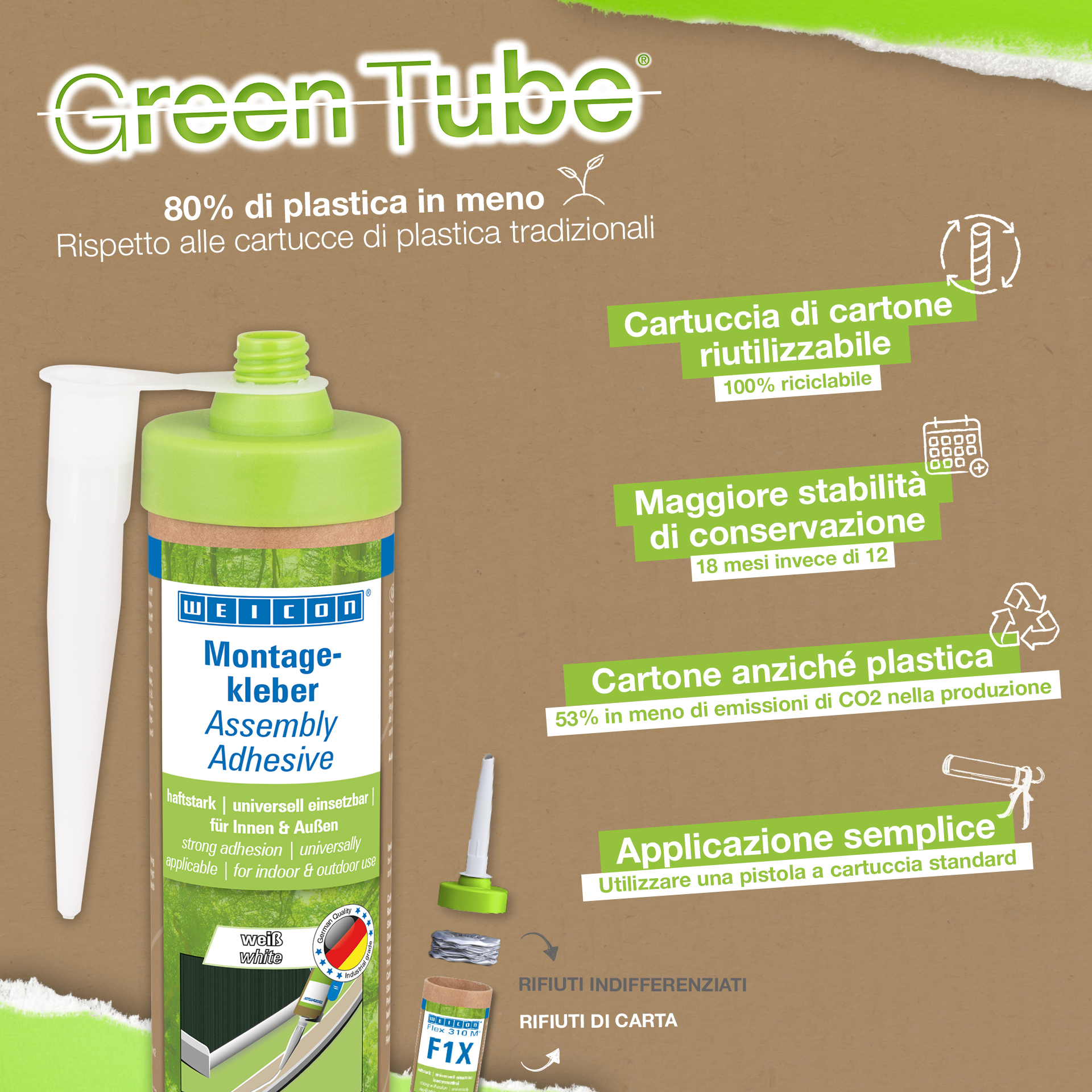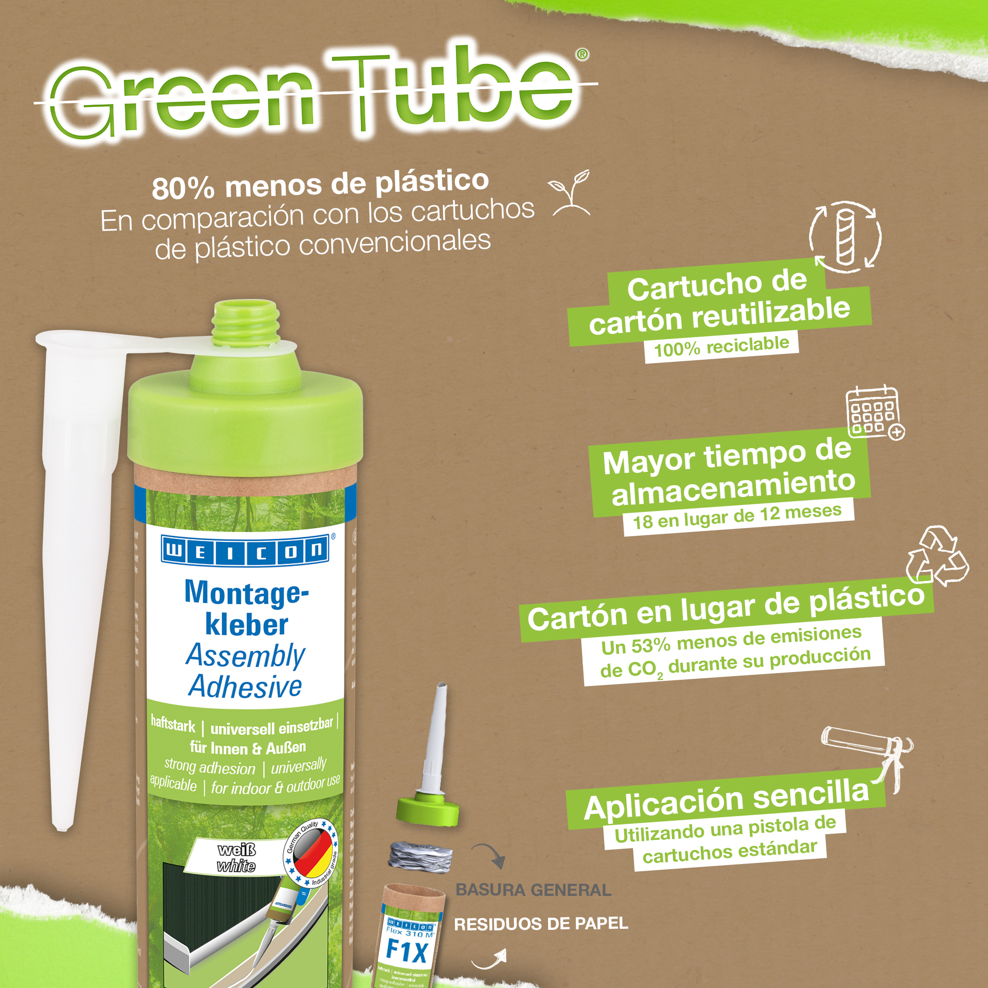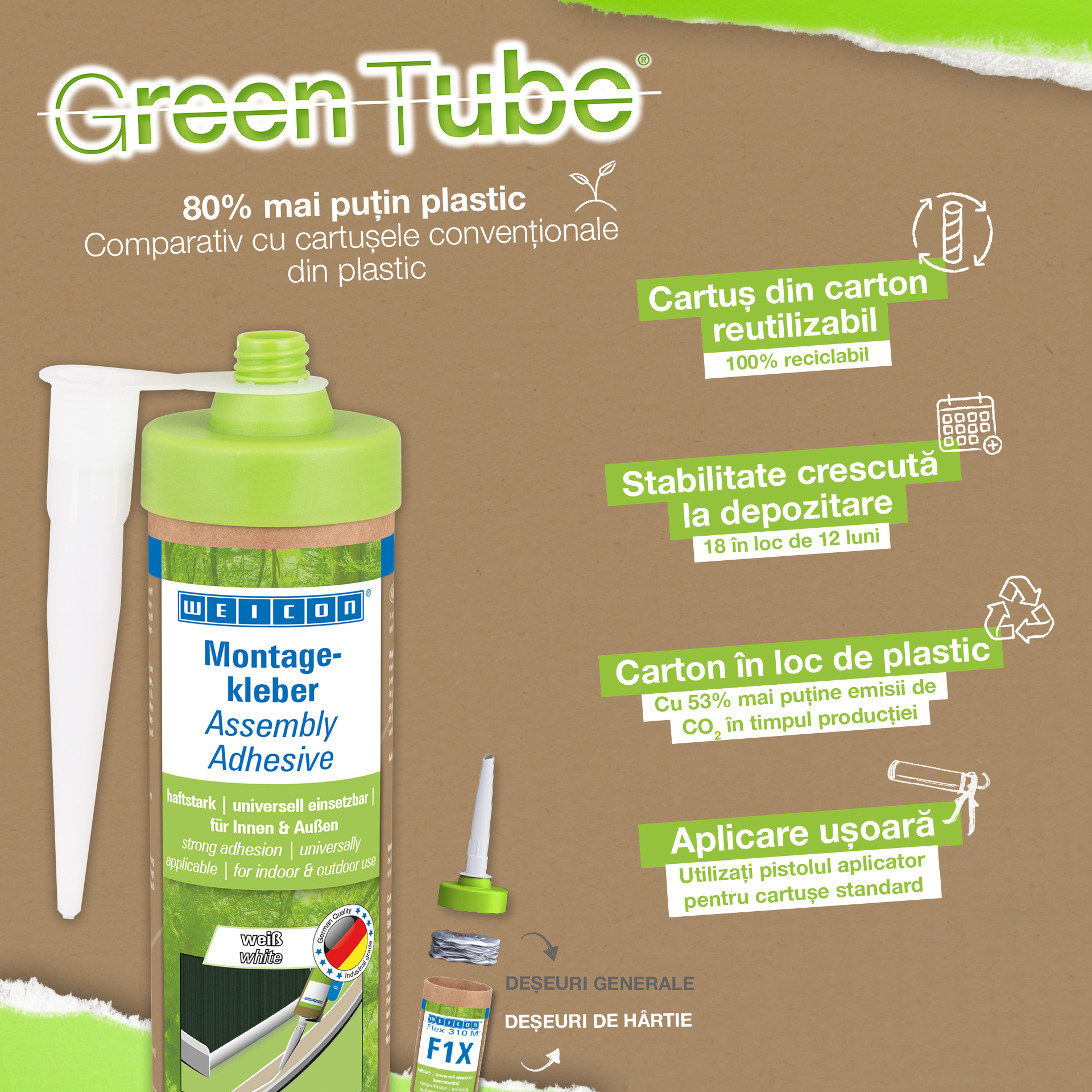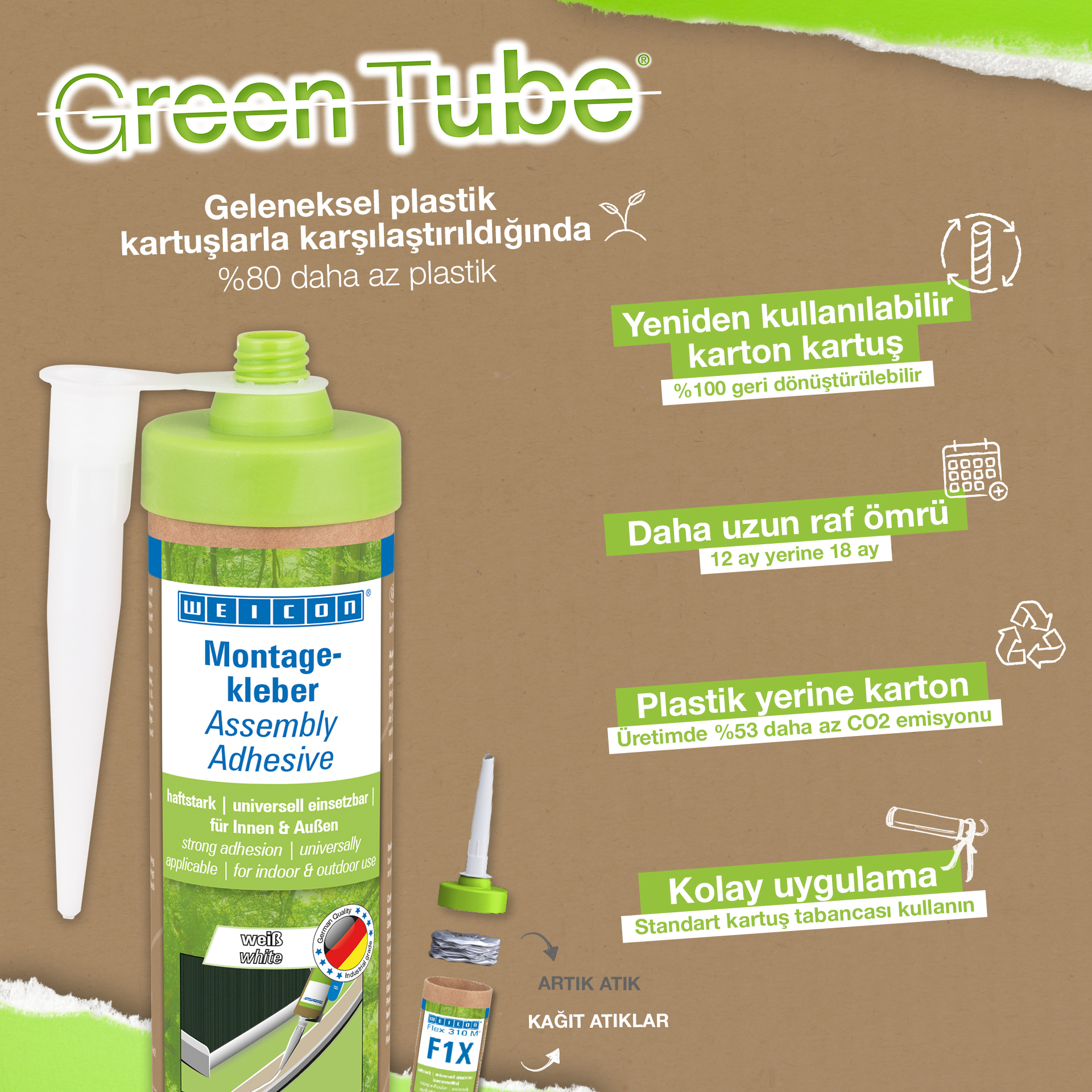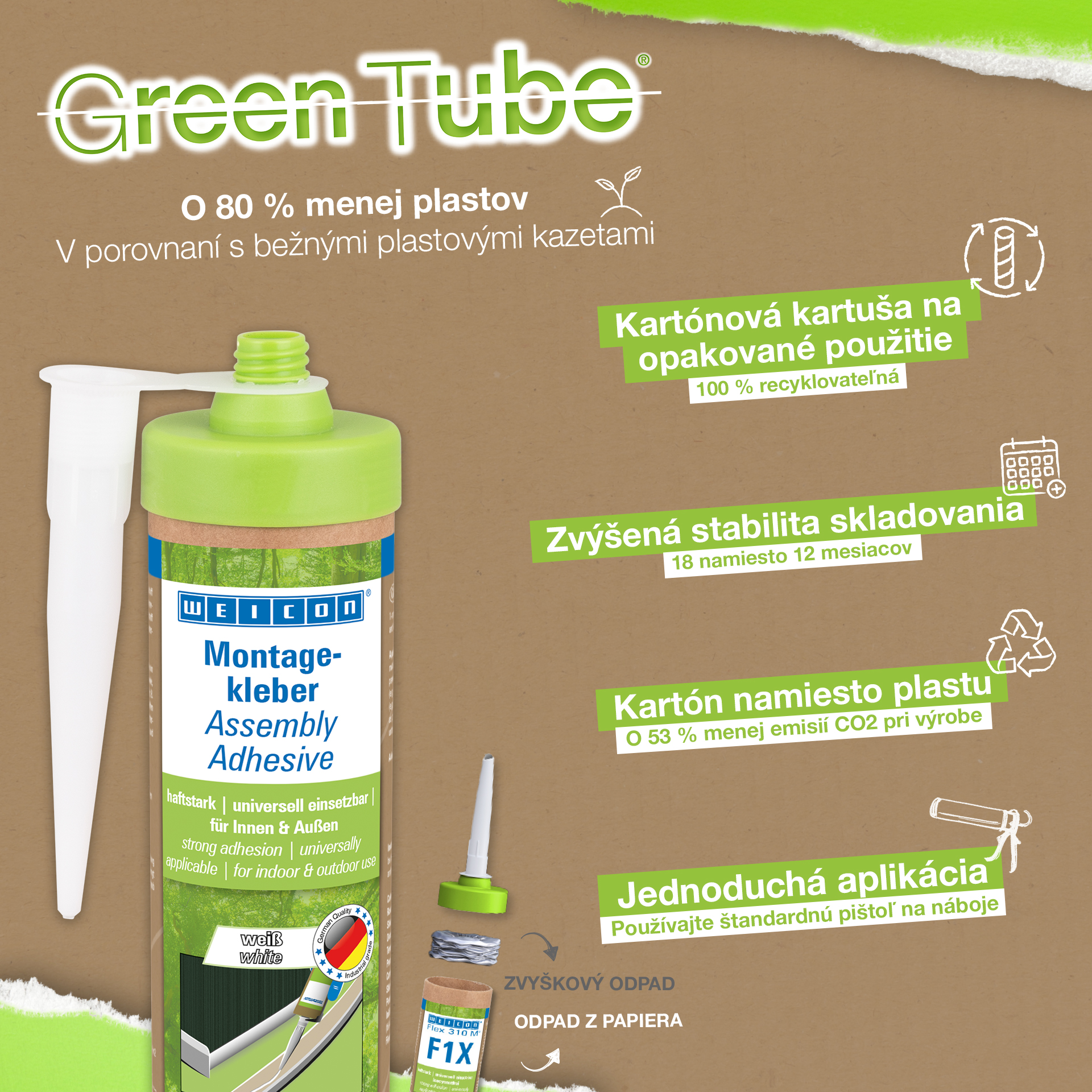 Klej montażowy WEICON jest silnym dyspersyjnym klejem akrylowym do montażu, napraw i prac wykończeniowych. Klej ma wysoką przyczepność początkową i wytrzymałość końcową oraz szybko się utwardza. Po wyschnięciu klej montażowy można przeszlifować i otynkować, a także pomalować dostępnymi na rynku farbami i lakierami. Klej jest odporny na temperaturę w zakresie od -20 °C do +80 °C i nadaje się zarówno do zastosowań wewnętrznych, jak i zewnętrznych. Biały, elastyczny klej jest niskoemisyjny i nie zawiera rozpuszczalników. Klej montażowy ma uniwersalne zastosowanie i może być używany w wielu różnych zastosowaniach. Idealnie nadaje się na przykład do klejenia powierzchniowego materiałów drewnopochodnych (takich jak listwy przypodłogowe, listwy dekoracyjne, panele lub płyty wiórowe), PVC, polistyrenu, płyt styropianowych, sztywnej pianki PU (np. płyt izolacyjnych i kanałów kablowych), materiałów mineralnych (np. płytek) i metali na chłonnych podłożach, takich jak tynk, beton, cement włóknisty, płyty gipsowo-kartonowe i surowe drewno. Zrównoważone opakowanie - równie wytrzymałe! Green Tube, zrównoważone opakowanie: końcówka i pokrywka są wykonane w 100% z plastiku pochodzącego z recyklingu, a korpus wkładu w 100% z kartonu. Mniejsza emisja CO2 i mniejsze zużycie plastiku niż w przypadku konwencjonalnych wkładów. Bez utraty wydajności!