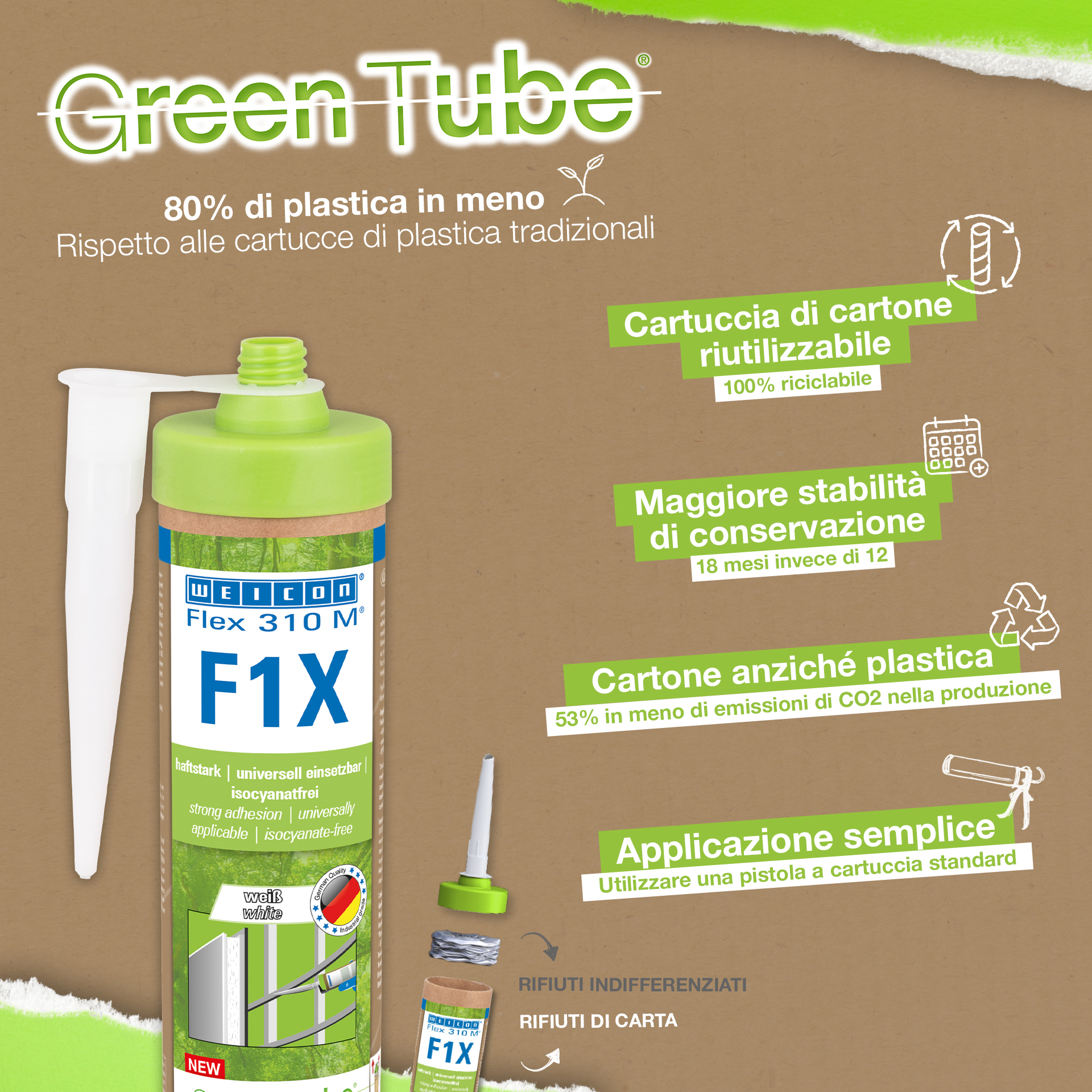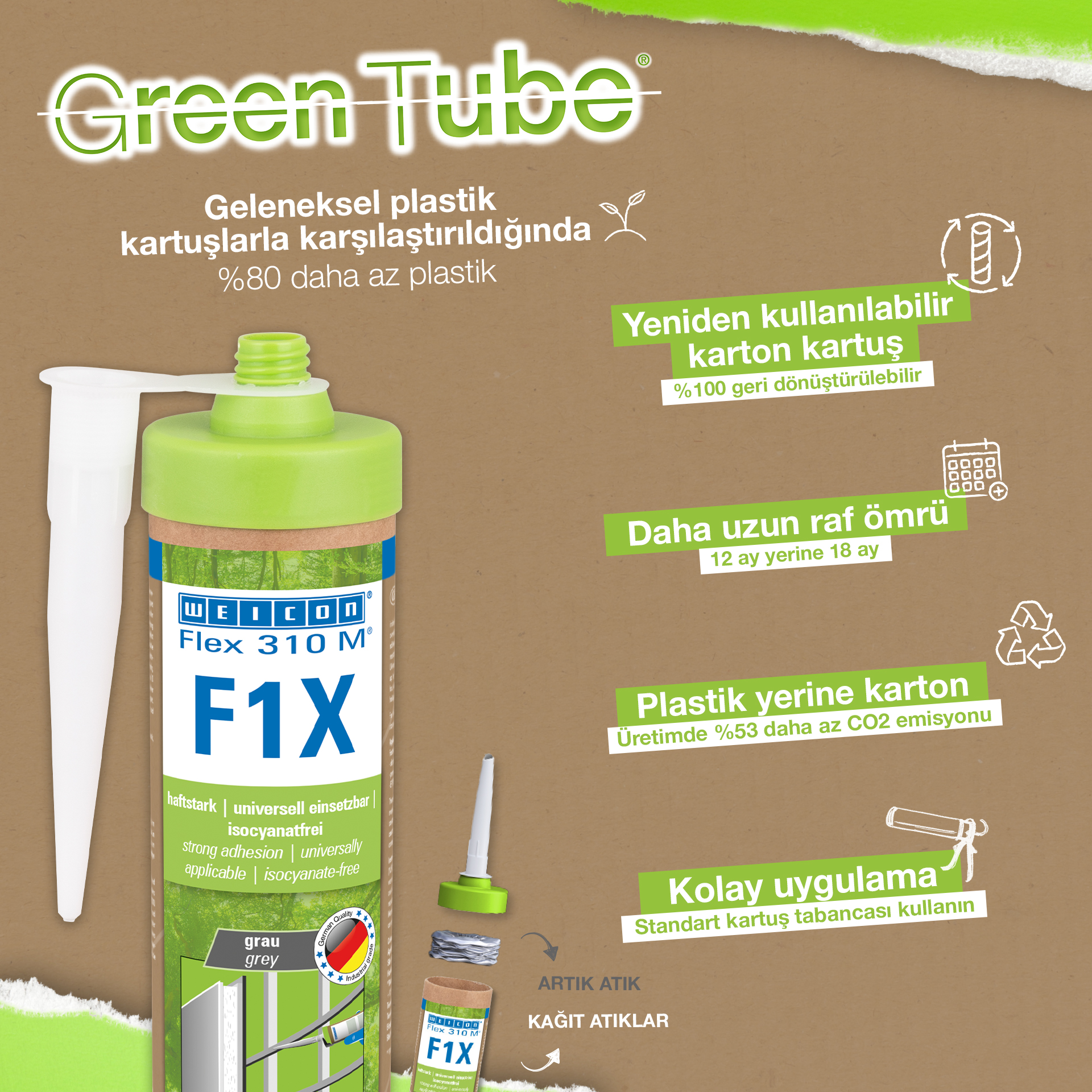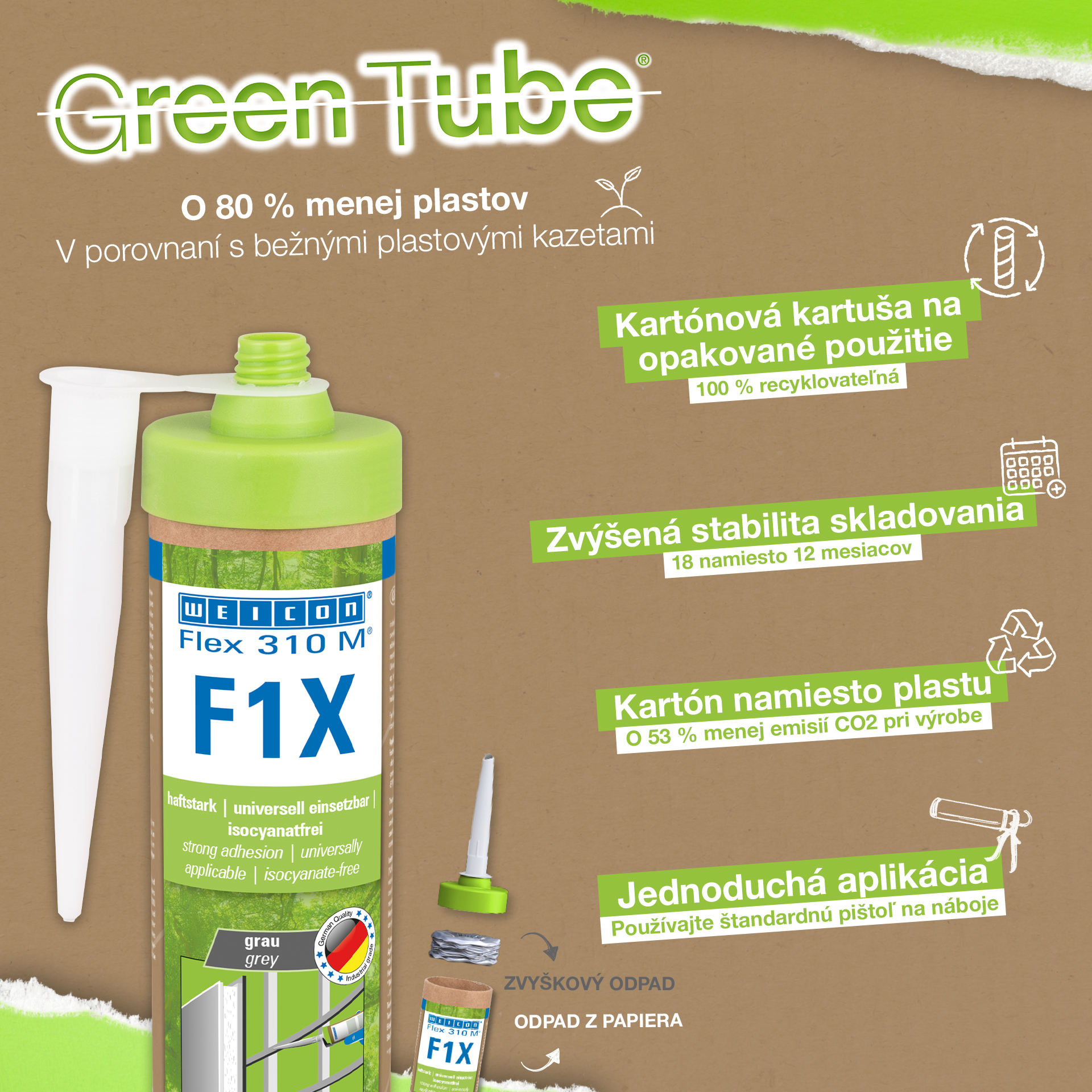 WEICON Flex 310 M F1X to elastyczny klej i uszczelniacz na bazie MS polimerów. Szary klej jest bardzo mocny i uniwersalnie nadaje się do trwałego mocowania prawie wszystkich materiałów do różnych powierzchni. Dzięki bardzo wysokiej przyczepności początkowej, klejenie jest możliwe na powierzchniach pionowych, a nawet nad głową, zarówno wewnątrz, jak i na zewnątrz. Na przykład Flex 310 M F1X może być stosowany do łączenia ze sobą metali, wielu tworzyw sztucznych, ceramiki, drewna, szkła i kamienia. Trwale elastyczny klej może być malowany "mokro na mokro", jest przemalowywalny, odporny na warunki atmosferyczne, wilgoć, starzenie, pleśń i promieniowanie UV. Może wytrzymać temperatury do 180 °C krótkotrwale (do 30 minut) i może być malowany proszkowo po utwardzeniu po czterech dniach. Klej i uszczelniacz nie zawiera silikonu, izocyjanianu, halogenu ani rozpuszczalników oraz nie powoduje korozji. Flex 310 M F1X może być stosowany do mocowania listew przypodłogowych, listew, profili, ram, paneli, płyt, płytek, kamieni i folii EPDM. Może być stosowany podczas suchej zabudowy i budowy wnętrz, w konstrukcjach metalowych, w budowie zbiorników i aparatów, w budowie kontenerów, w technologii wentylacji i klimatyzacji, w stoiskach targowych i sklepach, w budowie jachtów i łodzi oraz wszędzie tam, gdzie silikony lub produkty zawierające silikon nie są odpowiednie. Zrównoważone opakowanie - równie mocne! Green Tube, ekologiczne opakowanie: Końcówka i pokrywka są wykonane w 100% z plastiku pochodzącego z recyklingu, a korpus kartusza w 100% z kartonu. Niższa emisja CO2 i zużycie plastiku niż w przypadku konwencjonalnych kartuszów. Bez uszczerbku dla wydajności!