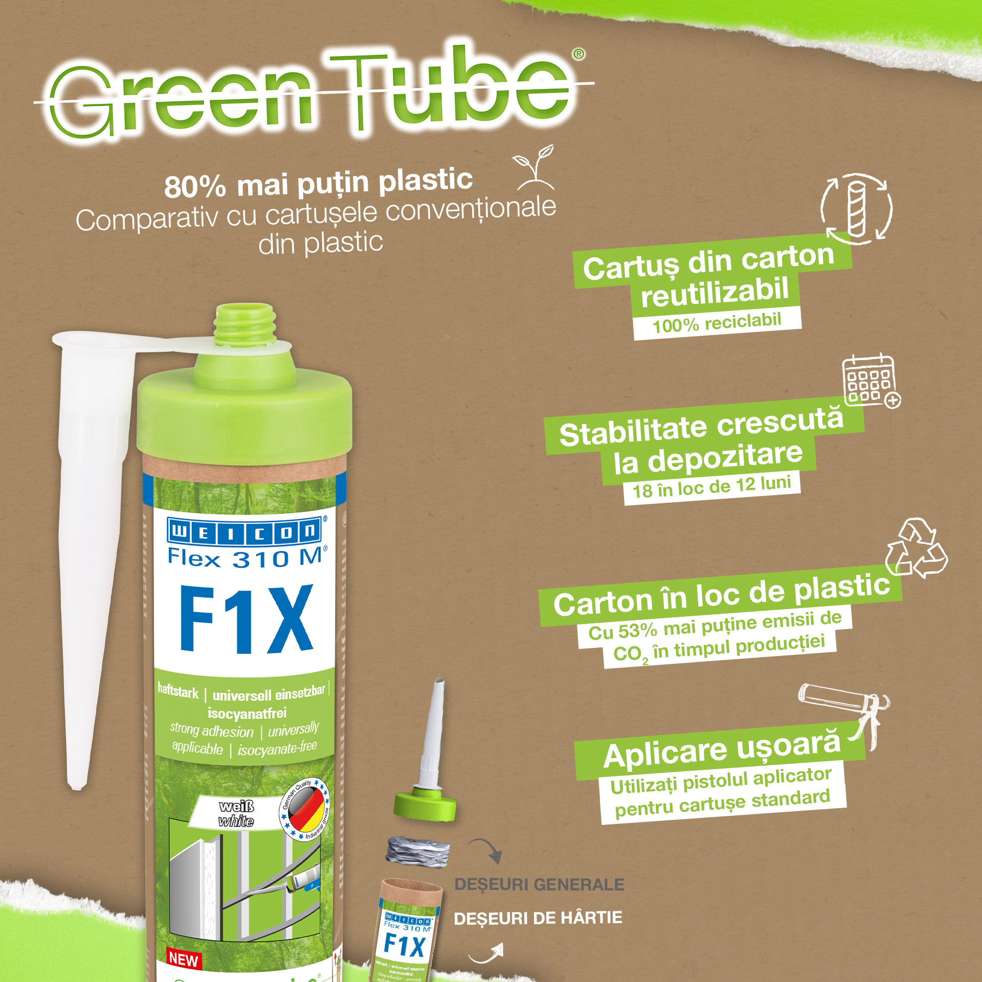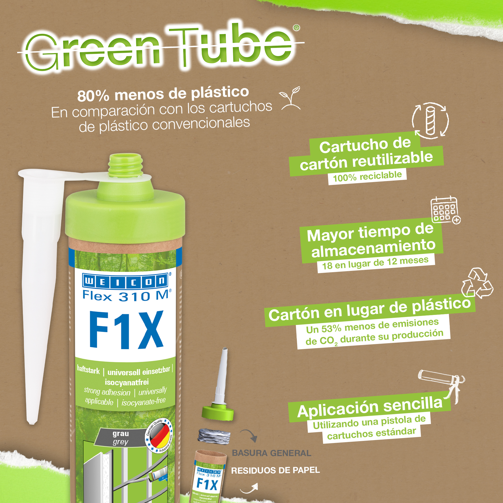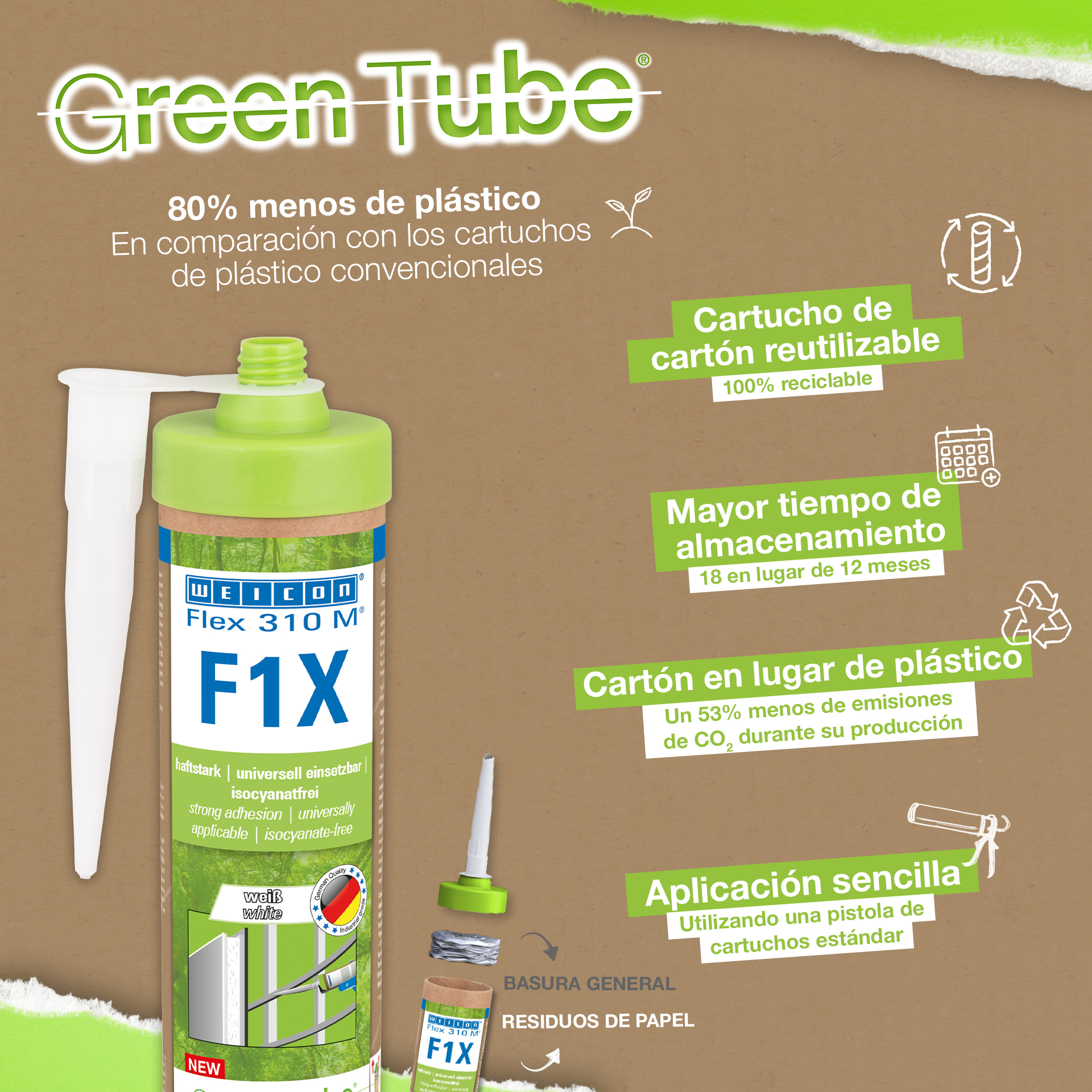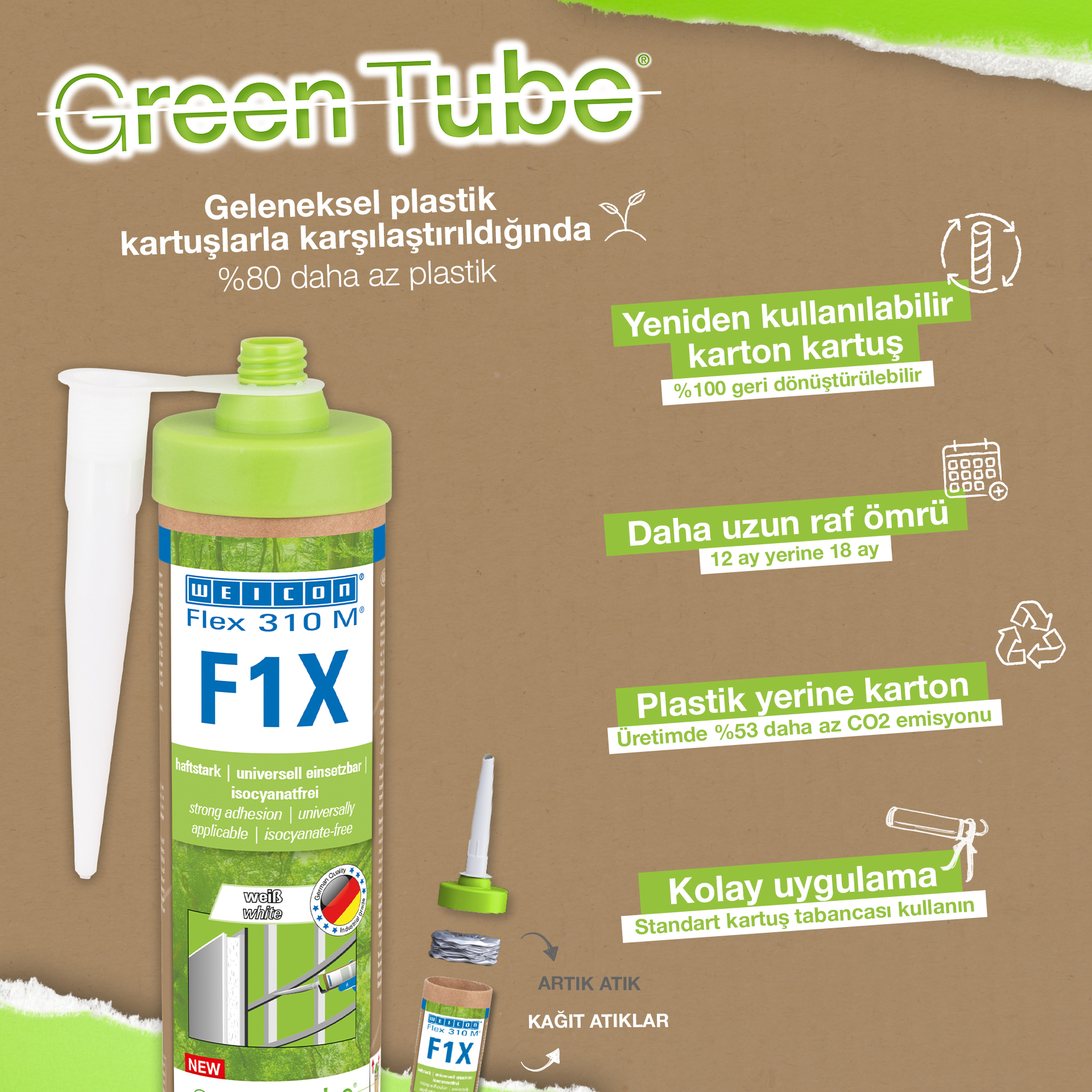 WEICON Flex 310 M F1X to elastyczny klej i uszczelniacz na bazie MS polimerów. Szary klej jest bardzo mocny i uniwersalnie nadaje się do trwałego mocowania prawie wszystkich materiałów do różnych powierzchni. Dzięki bardzo wysokiej przyczepności początkowej, klejenie jest możliwe na powierzchniach pionowych, a nawet nad głową, zarówno wewnątrz, jak i na zewnątrz. Na przykład Flex 310 M F1X może być stosowany do łączenia ze sobą metali, wielu tworzyw sztucznych, ceramiki, drewna, szkła i kamienia. Trwale elastyczny klej może być malowany "mokro na mokro", jest przemalowywalny, odporny na warunki atmosferyczne, wilgoć, starzenie, pleśń i promieniowanie UV. Może wytrzymać temperatury do 180 °C krótkotrwale (do 30 minut) i może być malowany proszkowo po utwardzeniu po czterech dniach. Klej i uszczelniacz nie zawiera silikonu, izocyjanianu, halogenu ani rozpuszczalników oraz nie powoduje korozji. Flex 310 M F1X może być stosowany do mocowania listew przypodłogowych, listew, profili, ram, paneli, płyt, płytek, kamieni i folii EPDM. Może być stosowany podczas suchej zabudowy i budowy wnętrz, w konstrukcjach metalowych, w budowie zbiorników i aparatów, w budowie kontenerów, w technologii wentylacji i klimatyzacji, w stoiskach targowych i sklepach, w budowie jachtów i łodzi oraz wszędzie tam, gdzie silikony lub produkty zawierające silikon nie są odpowiednie. Zrównoważone opakowanie - równie mocne! Green Tube, ekologiczne opakowanie: Końcówka i pokrywka są wykonane w 100% z plastiku pochodzącego z recyklingu, a korpus kartusza w 100% z kartonu. Niższa emisja CO2 i zużycie plastiku niż w przypadku konwencjonalnych kartuszów. Bez uszczerbku dla wydajności!