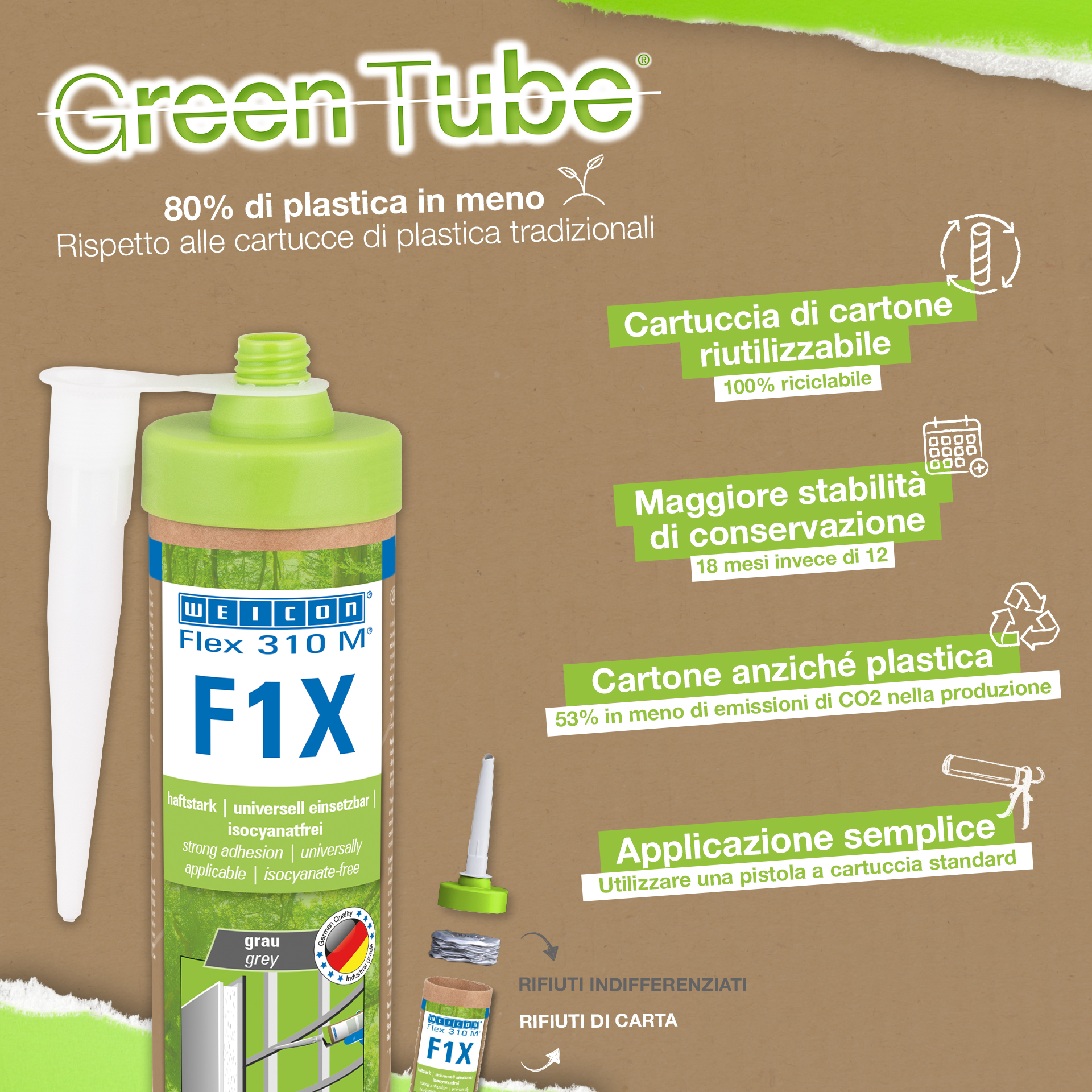WEICON Flex 310 M F1X to elastyczny klej i uszczelniacz na bazie MS polimerów. Szary klej jest bardzo mocny i uniwersalnie nadaje się do trwałego mocowania prawie wszystkich materiałów do różnych powierzchni. Dzięki bardzo wysokiej przyczepności początkowej, klejenie jest możliwe na powierzchniach pionowych, a nawet nad głową, zarówno wewnątrz, jak i na zewnątrz. Na przykład Flex 310 M F1X może być stosowany do łączenia ze sobą metali, wielu tworzyw sztucznych, ceramiki, drewna, szkła i kamienia. Trwale elastyczny klej może być malowany "mokro na mokro", jest przemalowywalny, odporny na warunki atmosferyczne, wilgoć, starzenie, pleśń i promieniowanie UV. Może wytrzymać temperatury do 180 °C krótkotrwale (do 30 minut) i może być malowany proszkowo po utwardzeniu po czterech dniach. Klej i uszczelniacz nie zawiera silikonu, izocyjanianu, halogenu ani rozpuszczalników oraz nie powoduje korozji. Flex 310 M F1X może być stosowany do mocowania listew przypodłogowych, listew, profili, ram, paneli, płyt, płytek, kamieni i folii EPDM. Może być stosowany podczas suchej zabudowy i budowy wnętrz, w konstrukcjach metalowych, w budowie zbiorników i aparatów, w budowie kontenerów, w technologii wentylacji i klimatyzacji, w stoiskach targowych i sklepach, w budowie jachtów i łodzi oraz wszędzie tam, gdzie silikony lub produkty zawierające silikon nie są odpowiednie. Zrównoważone opakowanie - równie mocne! Green Tube, ekologiczne opakowanie: Końcówka i pokrywka są wykonane w 100% z plastiku pochodzącego z recyklingu, a korpus kartusza w 100% z kartonu. Niższa emisja CO2 i zużycie plastiku niż w przypadku konwencjonalnych kartuszów. Bez uszczerbku dla wydajności!