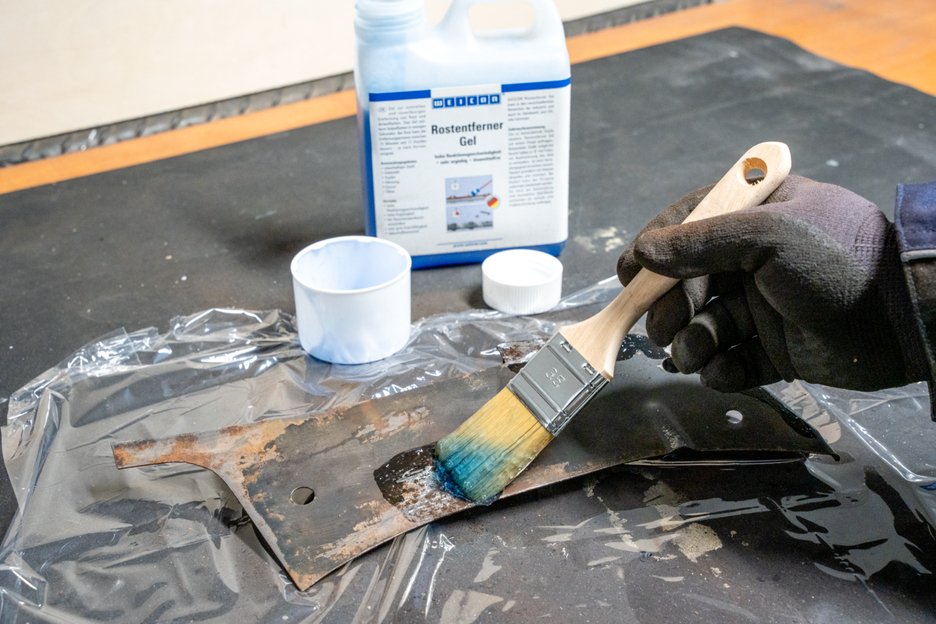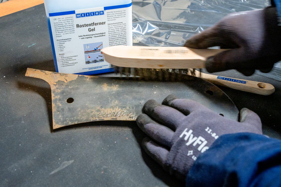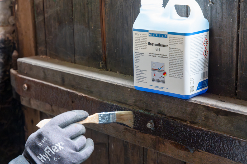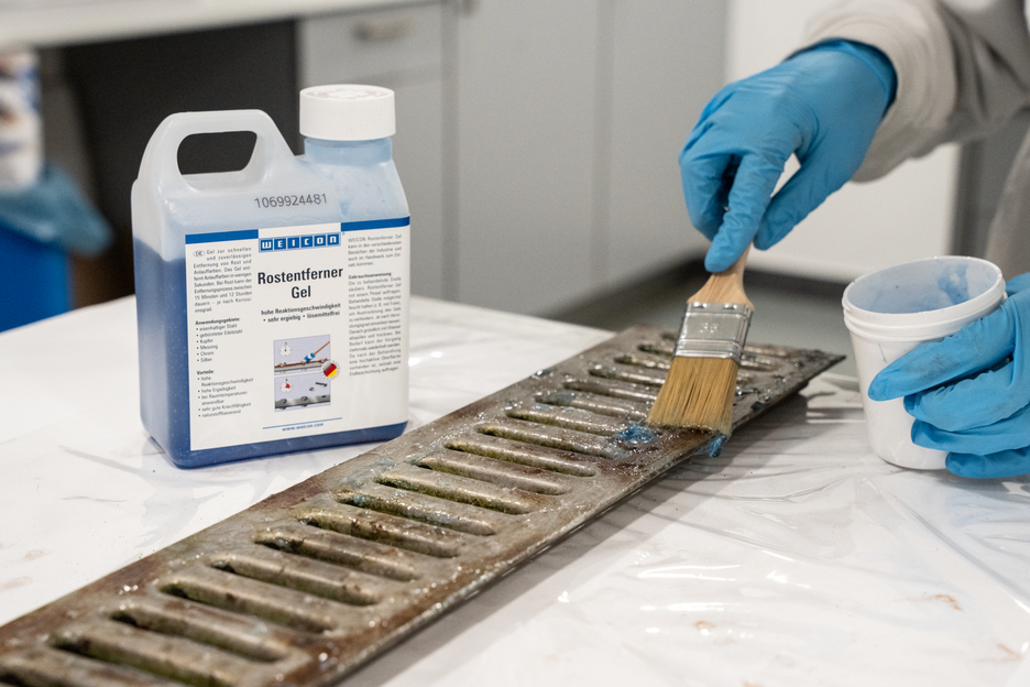 Żel do szybkiego i niezawodnego usuwania rdzy i nalotów. Żel odrdzewiający Rust Remover Gel może być stosowany do stali żelaznej, szczotkowanej stali nierdzewnej, miedzi, mosiądzu, chromu i srebra. Charakteryzuje się szybkością reakcji, bardzo dobrymi właściwościami pełzającymi i jest bardzo ekonomiczny. Naloty są usuwane przez żel w ciągu zaledwie kilku sekund. W przypadku rdzy proces usuwania może trwać od 15 minut do 12 godzin - w zależności od stopnia korozji. Niebieski żel nie musi być podgrzewany do aplikacji, ponieważ może być przetwarzany w temperaturze pokojowej. Roztwór ten ma naturalny, bezrozpuszczalnikowy skład i zapewnia delikatne usuwanie rdzy. WEICON Rust Remover Gel może być stosowany w różnych dziedzinach przemysłu, a także w branży rzemieślniczej.